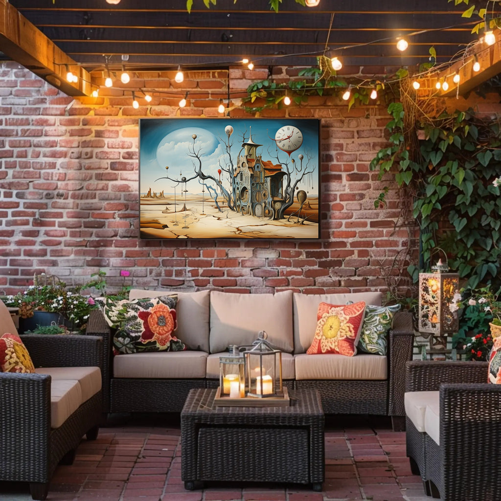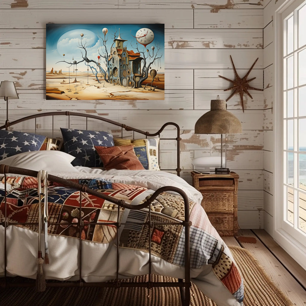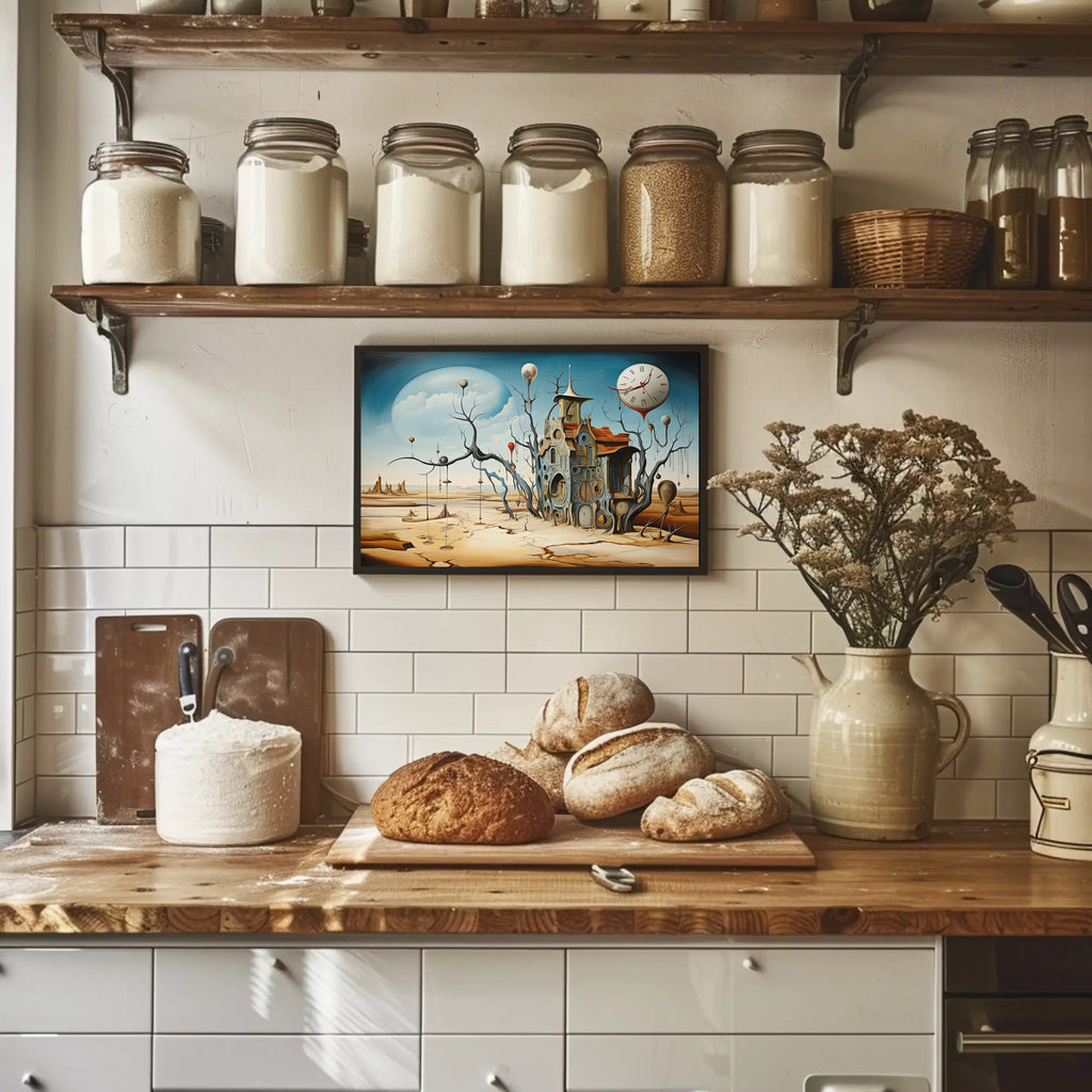 Immerse your space in a dreamlike desert where time flows and reality warps — the Surrealistic Timepiece Desert Art Print by PosterGoat captures an evocative, Dali‑inspired landscape featuring a melting clock, cracked sand plains, and an intricate house woven from circular timepieces. This abstract poster marries surrealism and contemporary art to create a striking focal point for living rooms, offices, studios, or gallery walls.