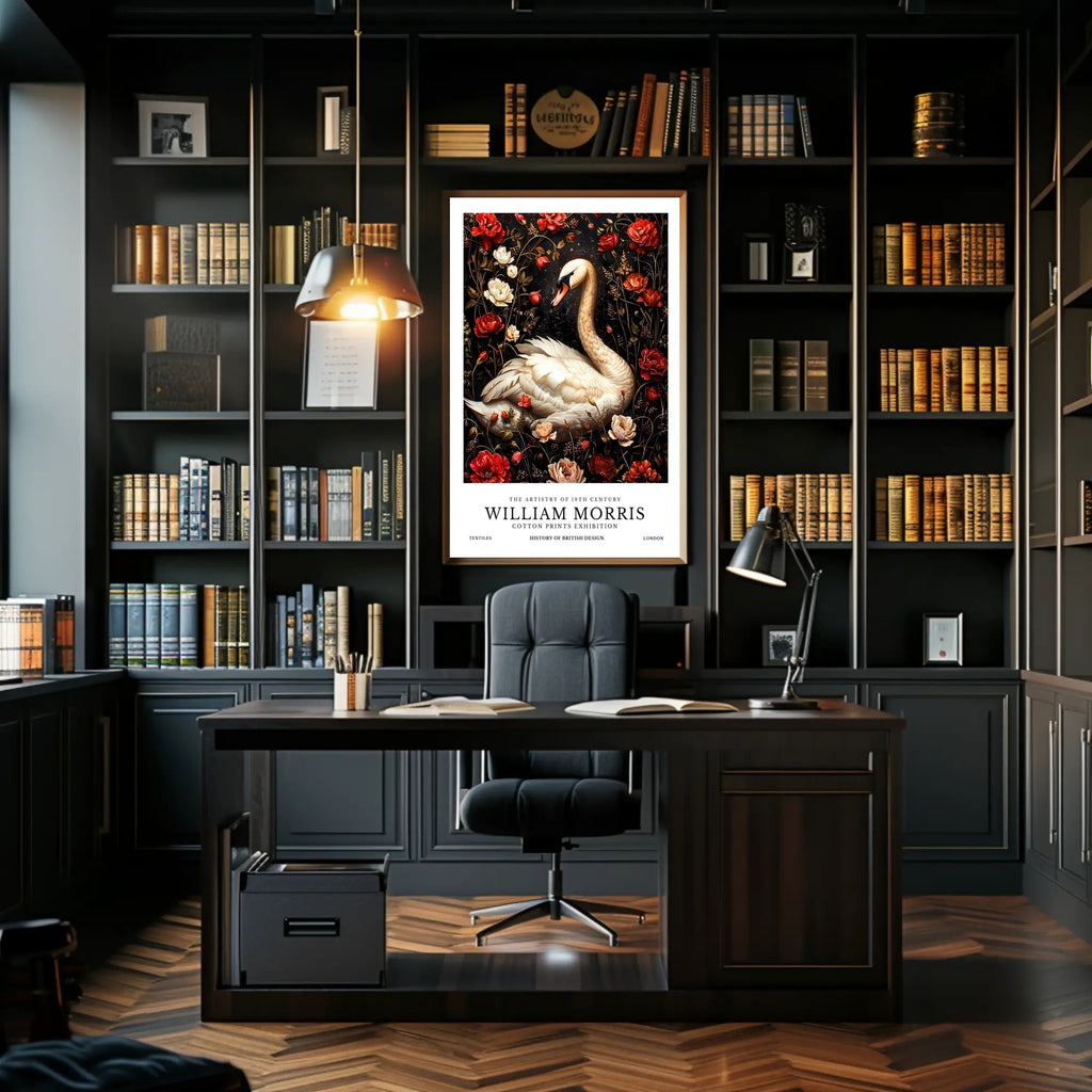 Why you'll love it: The rich contrast between the creamy swan and the vibrant floral border draws the eye while the refined typographic footer — referencing William Morris and cotton prints exhibition — adds an authentic, museum-style finish. This poster elevates both minimalist and traditional interiors, pairing beautifully with dark frames or crisp white mats.