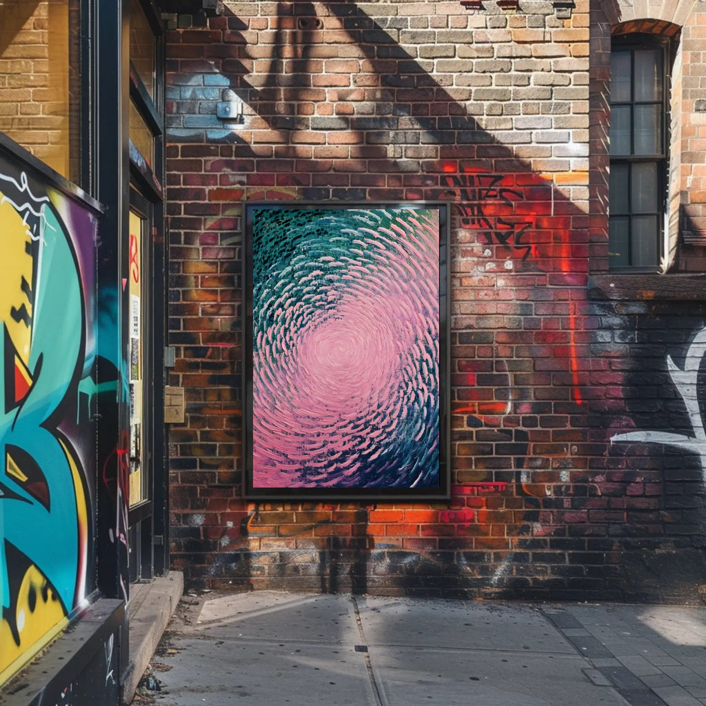 Bring hypnotic motion and contemporary color to your walls with the Swirling Colors Abstract Poster Art Print by PosterGoat. This 18x24 poster captures a textured spiral of brushstrokes — a luminous rose-hued center that ripples outward into deep teal and indigo — creating a dynamic focal point that energizes modern interiors.