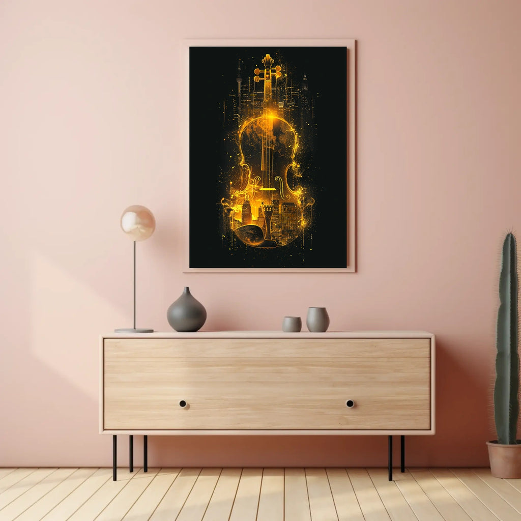 Introducing Symphony of the City—a poster that seamlessly blends music and urban life into a luminous moment of art. The silhouette of a violin glows as it merges with a vibrant cityscape, capturing the golden-hued energy, cultural richness, and nightlife spark that elevate any room.