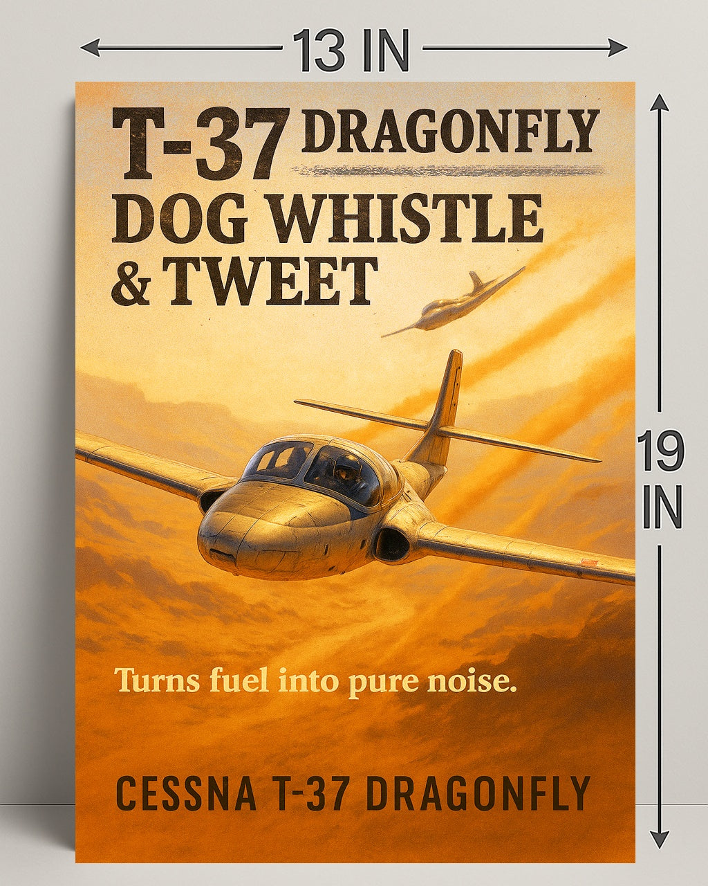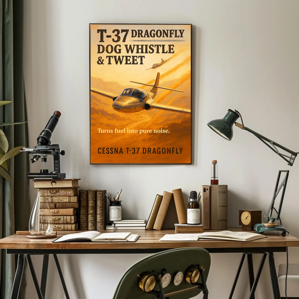 - Retro aviation aesthetic: Bold, vintage lettering—“T-37 Dragonfly Dog Whistle & Tweet”—pairs with the tagline “Turns fuel into pure noise,” evoking classic aircraft posters and nostalgic travel art.