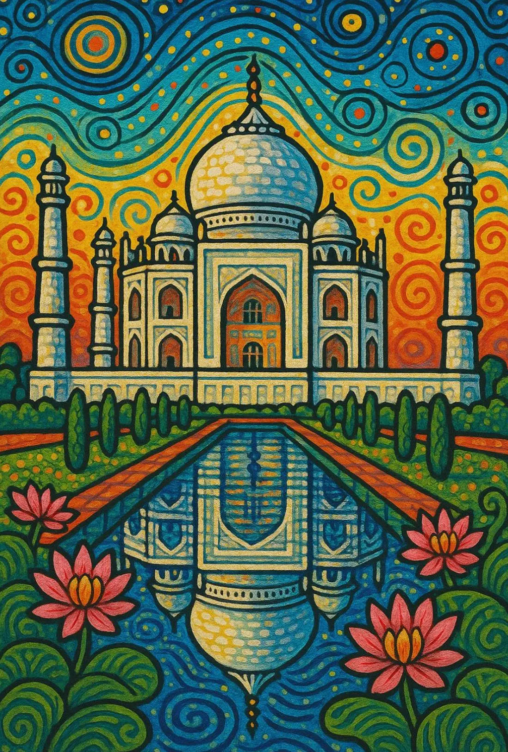 Immerse yourself in the breathtaking beauty of the Taj Mahal Van Gogh Style Travel Poster, a stunning masterpiece that reimagines one of the world's most iconic landmarks. This vibrant poster is infused with a color palette inspired by Van Gogh's celebrated "Starry Night," creating a mesmerizing visual experience that captures the grandeur of the Taj Mahal.