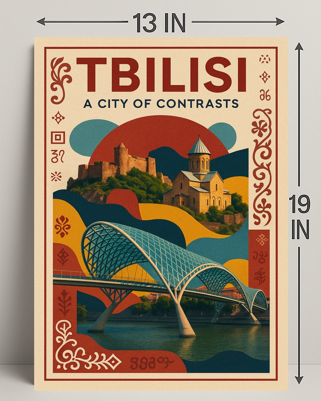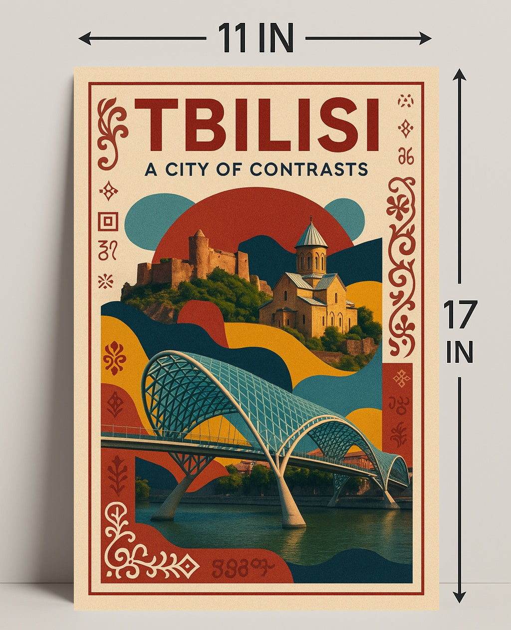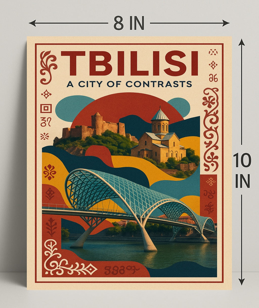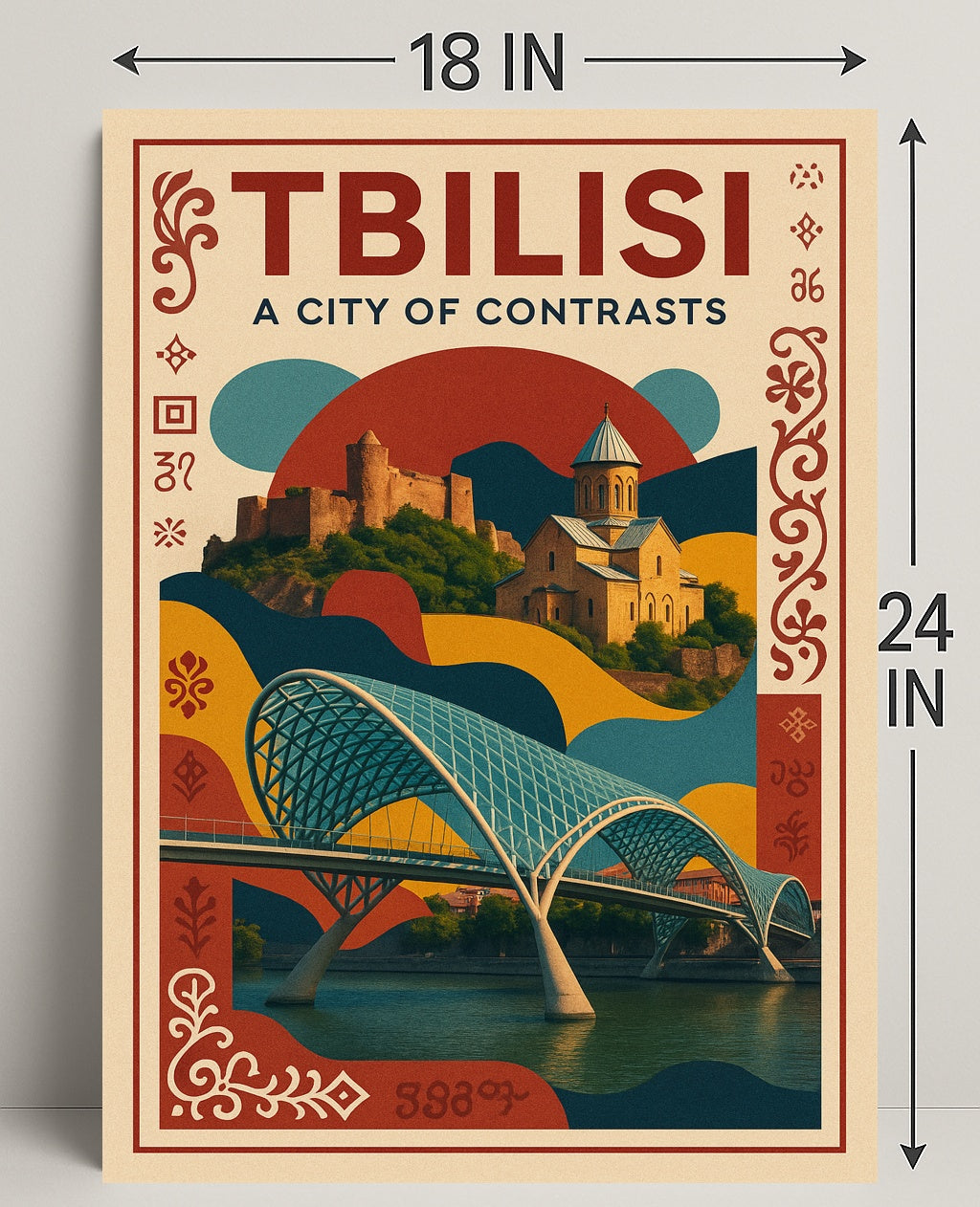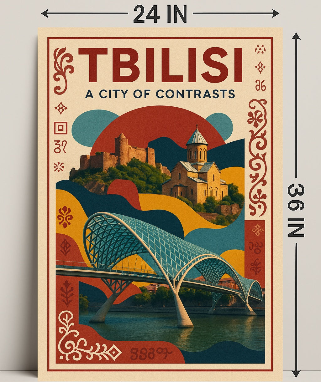 This poster features a striking composition: the graceful lattice arches of a modern pedestrian bridge sweeping over tranquil river reflections, layered beneath a sun‑washed hillside church and fortress. Warm terracotta, deep teal and mustard tones combine with ornamental Georgian motifs to create a vintage travel-poster feel that fits modern and minimalist interiors alike.
