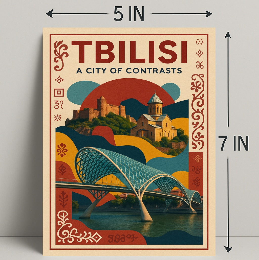 Standout visuals: High-contrast layout showcasing Tbilisi’s blend of ancient and modern landmarks — bridge, church and fortress — rendered in rich, poster-style color blocking.