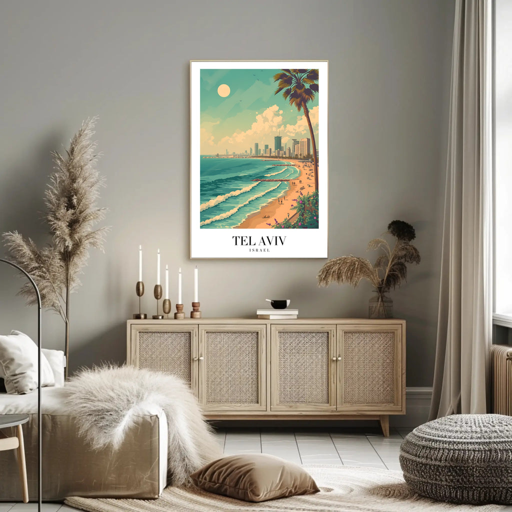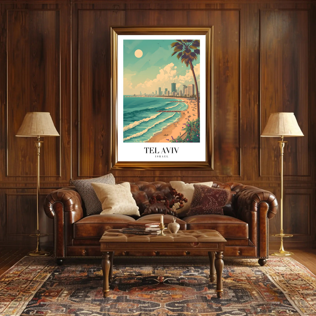 Discover the vibrant allure of Tel Aviv with this captivating poster showcasing its picturesque beachfront against a modern urban skyline. The scene is brought to life with vivid, warm colors that offer a touch of vintage charm while evoking a serene and nostalgic ambiance. The foreground features a prominent palm tree alongside the lively shore, where beachgoers enjoy the sun and surf. The harmonious blend of natural beauty and architectural elegance makes this artwork an inviting addition to any space, celebrating the unique essence and tranquility of this Israeli coastal city.