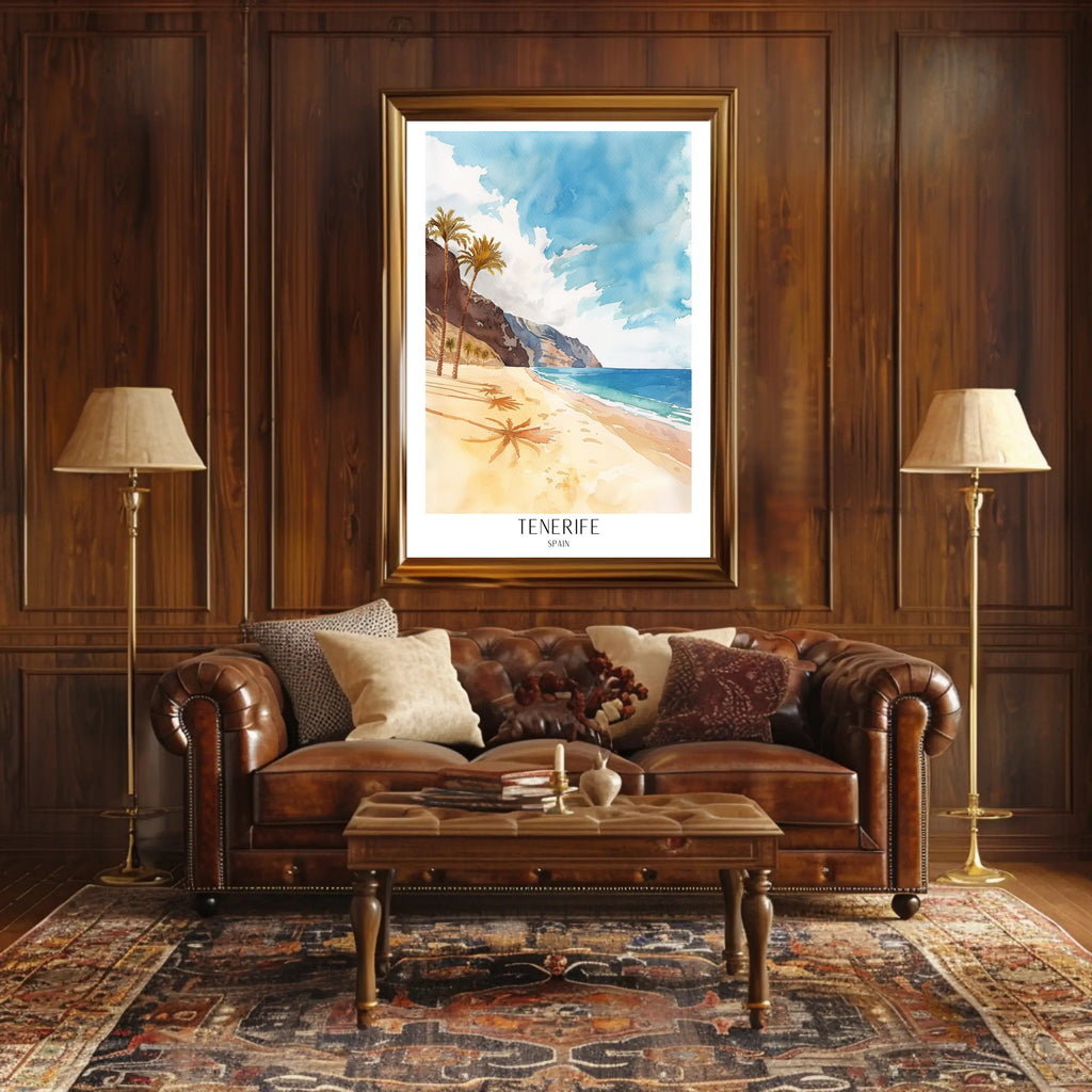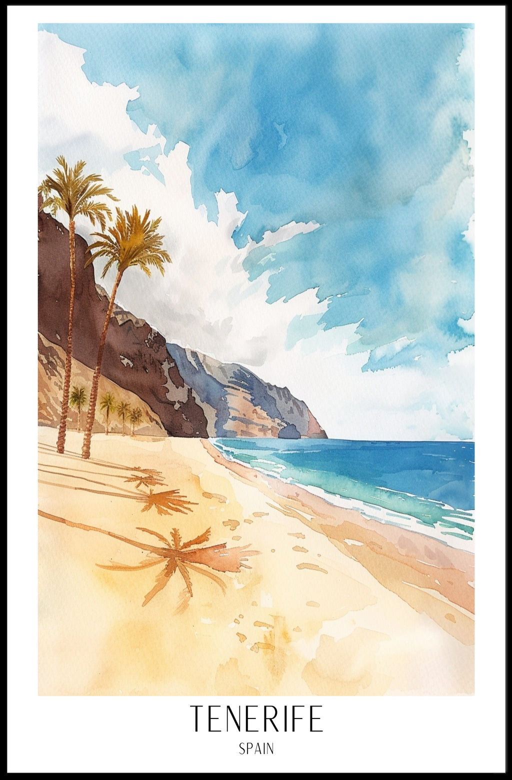 Bring the warm breeze and turquoise horizon of the Canary Islands into your home with the Tenerife Beachscape Poster by PosterGoat. This minimalist, watercolor-inspired print captures a sunlit shoreline, slender palm silhouettes, rugged coastal cliffs and the soft sweep of sand and sea — an elegant travel poster that evokes calm, wanderlust and coastal charm.