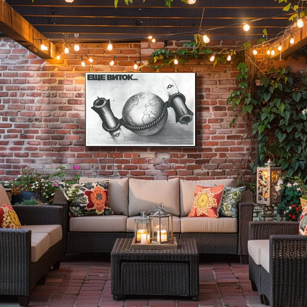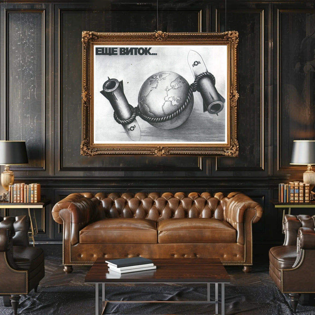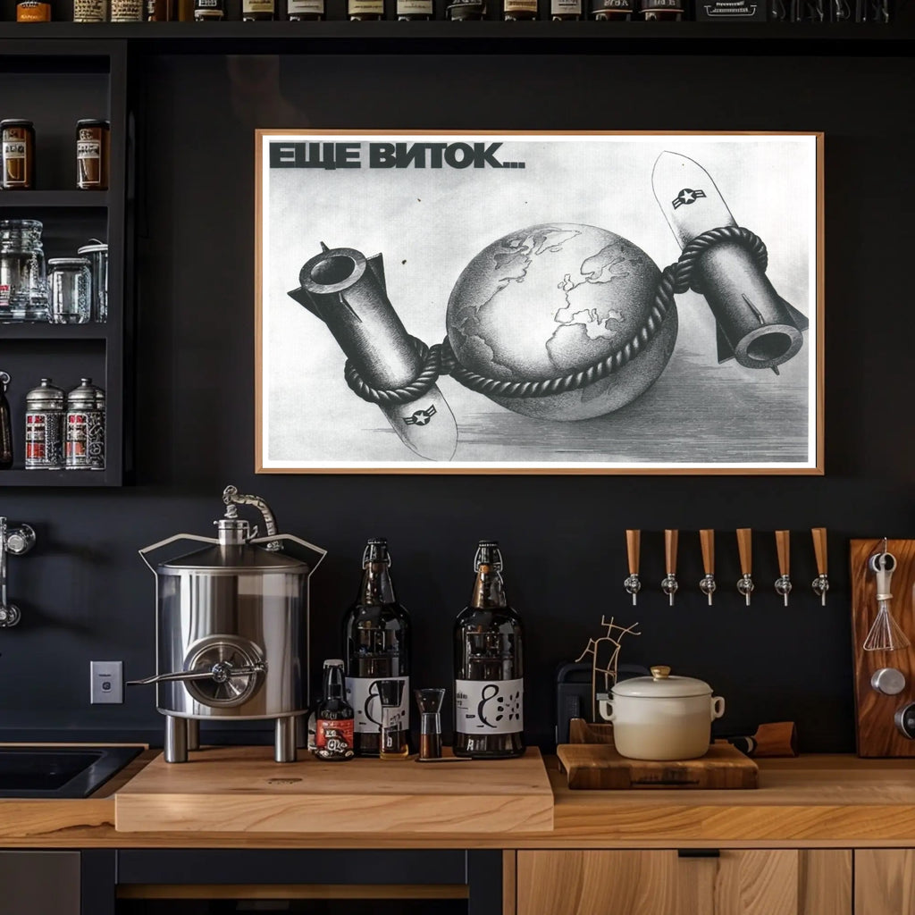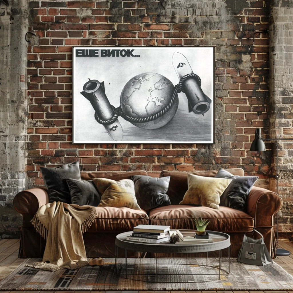 Evocative, vintage-inspired and boldly graphic, the Tension and Power Poster from PosterGoat brings dramatic black-and-white travel art energy to any wall. This striking paper print features a finely detailed globe bound by a thick rope and flanked by stylized rockets — a composition that captures motion, conflict and the pull of distant horizons in a single, memorable image.