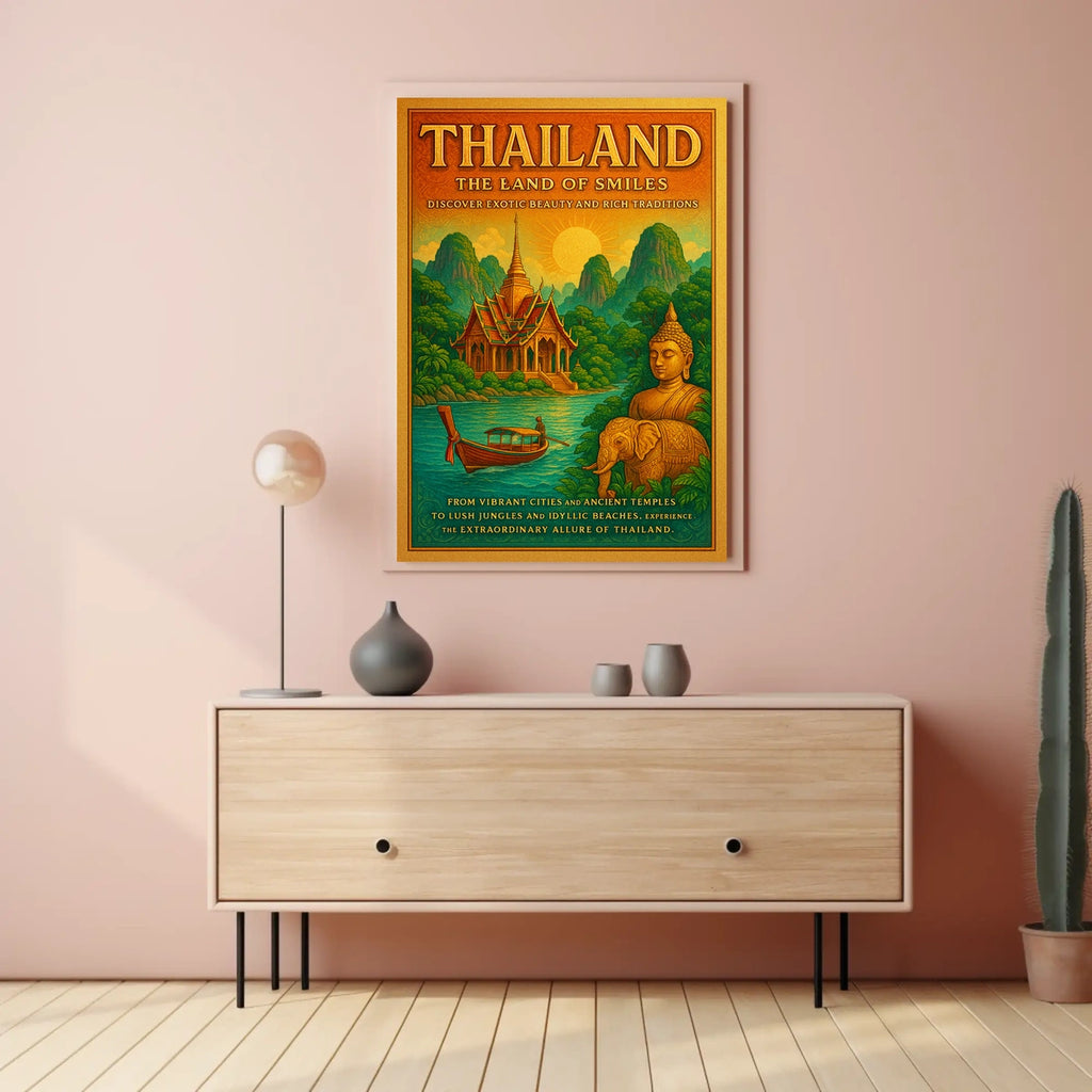 This Thailand The Land of Smiles Poster adds instant charm to any space, pairing beautifully with diverse décor and creating a sense of adventure. Ready to transform your walls? Shop now and bring home a piece of Thailand’s welcoming spirit.