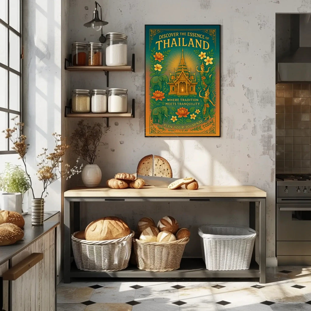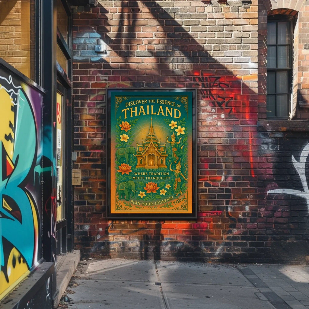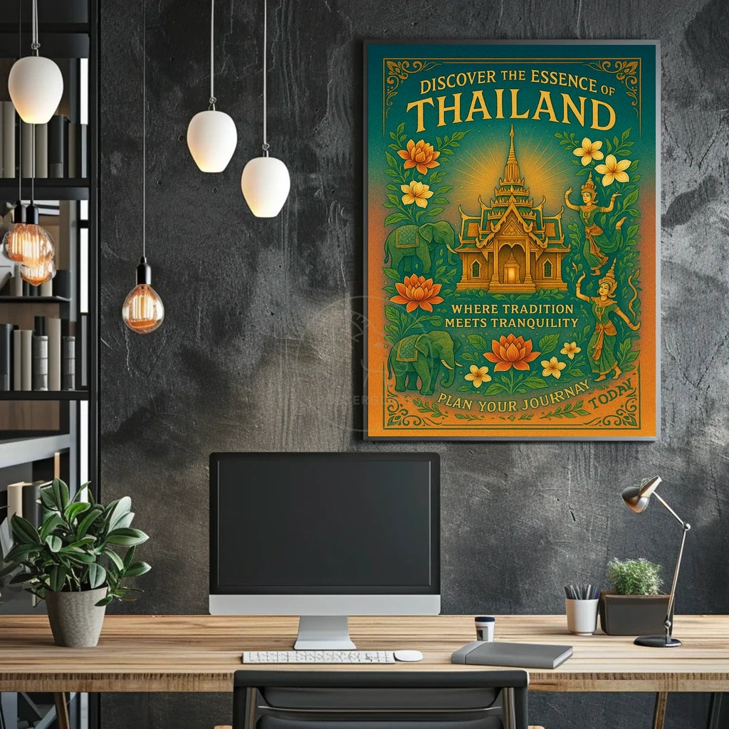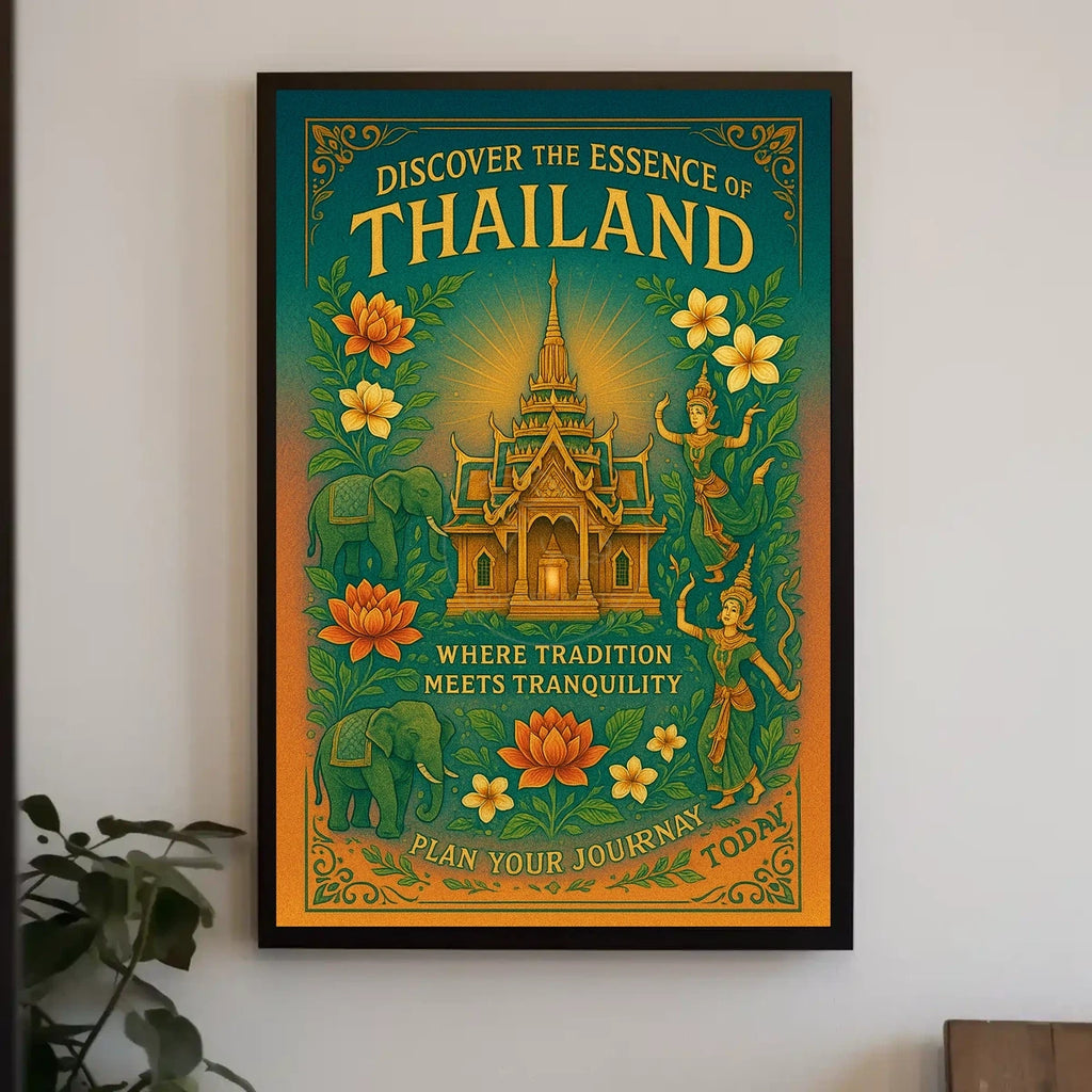 Discover the cultural wonders of Thailand with this captivating travel poster. Featuring a traditional Thai temple at its heart, the poster masterfully showcases intricate architectural details that speak to Thailand's rich heritage. Vibrant illustrations of lotus flowers surround the temple, along with two graceful traditional Thai dancers. The inclusion of an elephant brings a touch of local symbolism, all set against lush greenery. A warm palette of oranges and greens enhances the serene, inviting atmosphere. This piece blends vintage charm with illustrative artistry, appealing to travelers seeking authentic, cultural experiences.