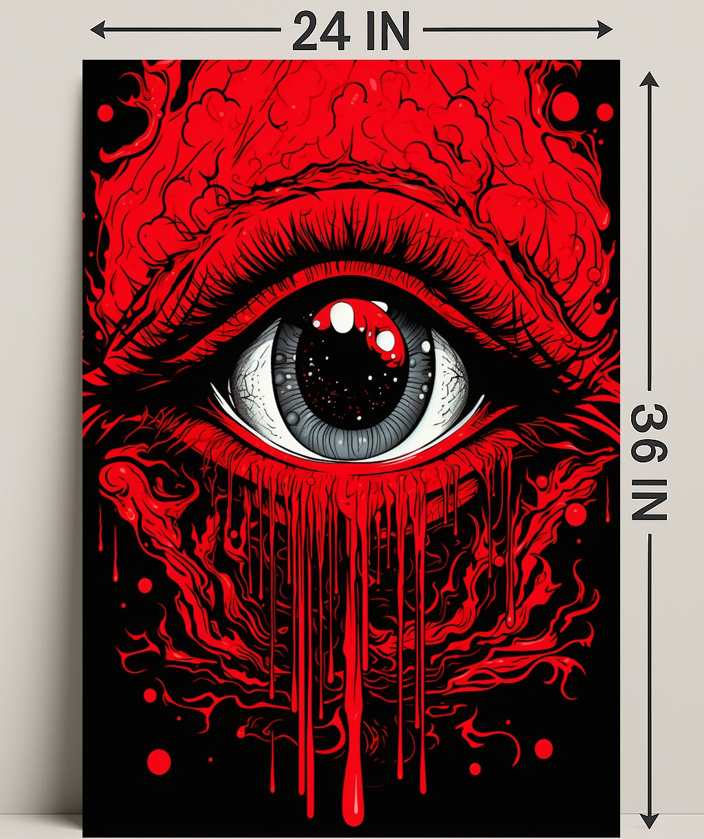 Intricate line work and dripping, fluid motifs surround the single, hyper-detailed eye, creating motion and depth that read beautifully from across a room. The dramatic contrast and fine detailing make it ideal for modern living rooms, creative studios, or gallery-style displays where striking wall art is needed to define the space.