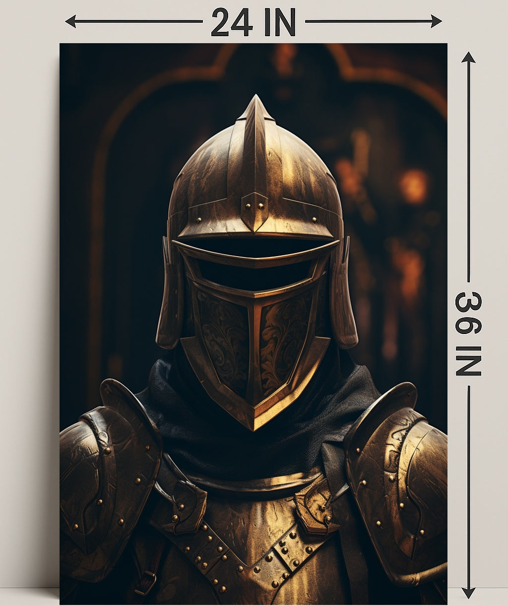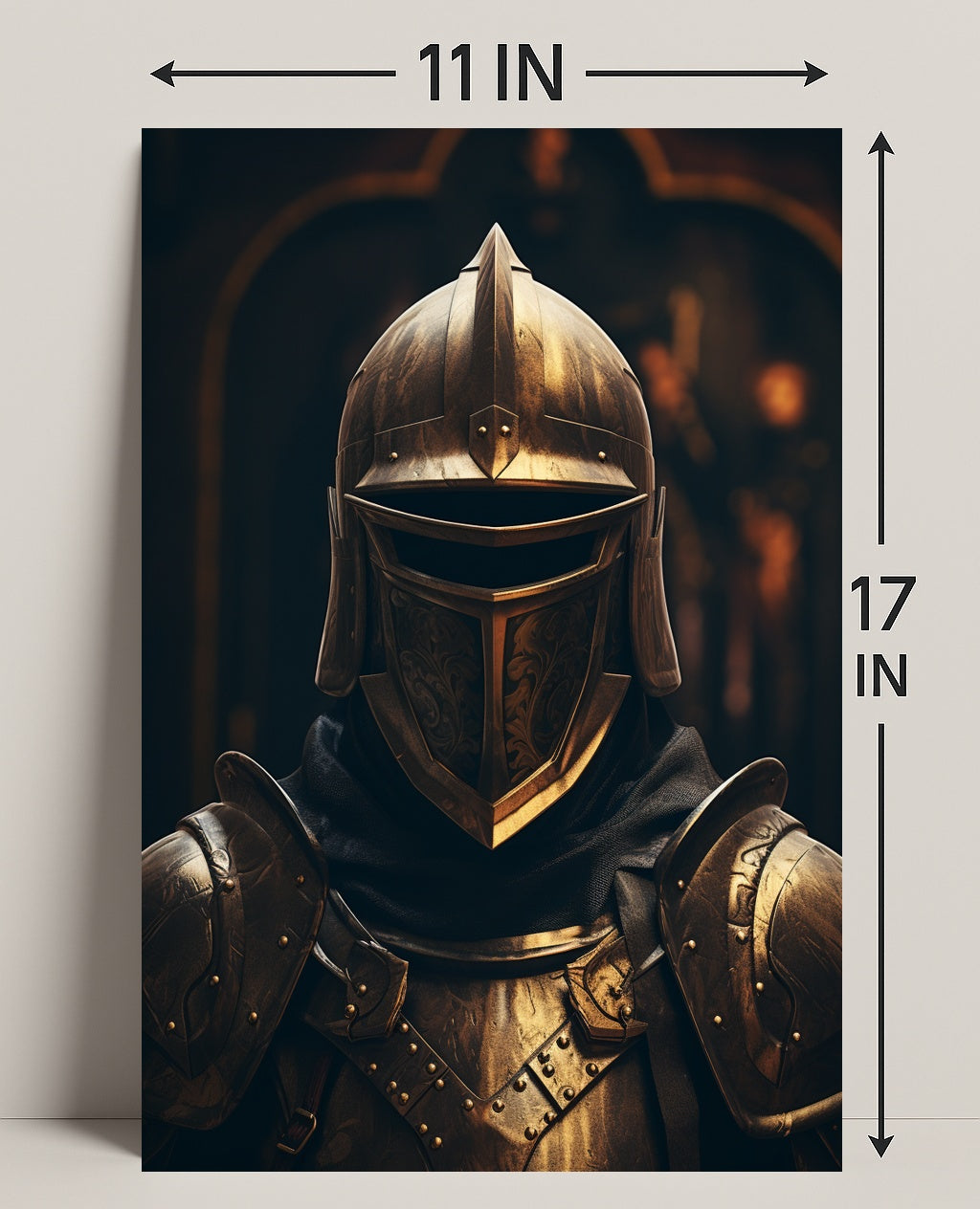 Bring legendary presence to your walls with The Armored Sentinel Poster from PosterGoat — a striking, high-contrast art print that marries medieval strength with minimalist, gallery-ready design. This dramatic portrait features a finely detailed, gold-toned helmet and armor set against a deep, moody backdrop, creating a timeless focal point for living rooms, studies, or game rooms.