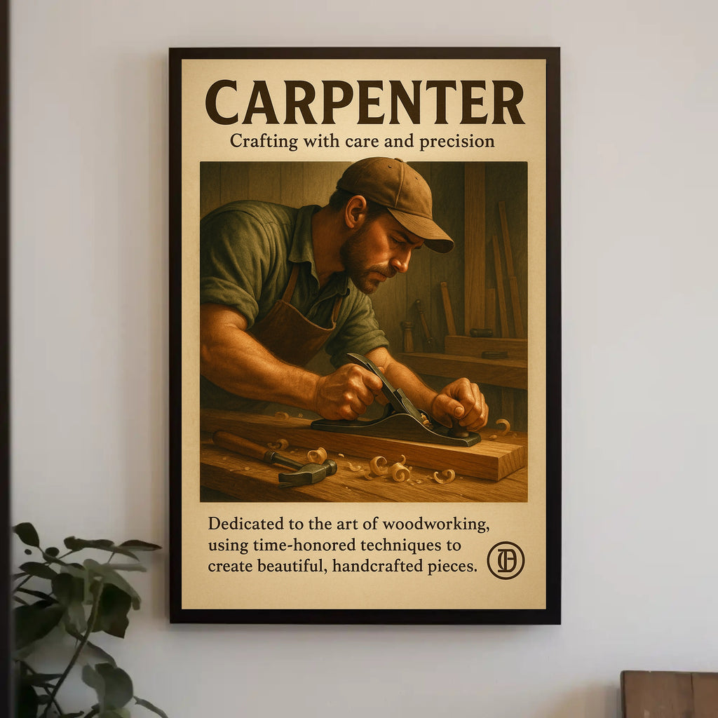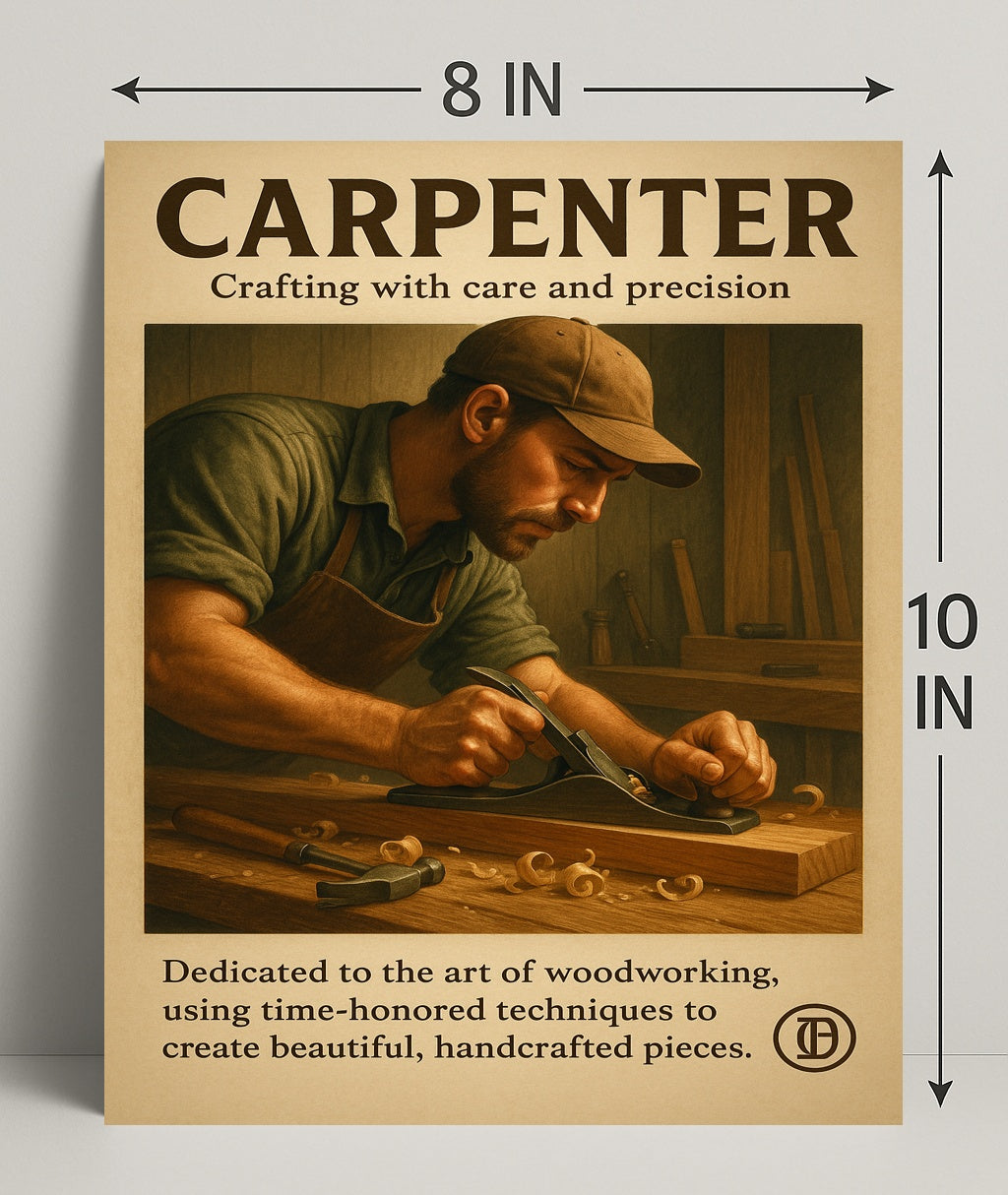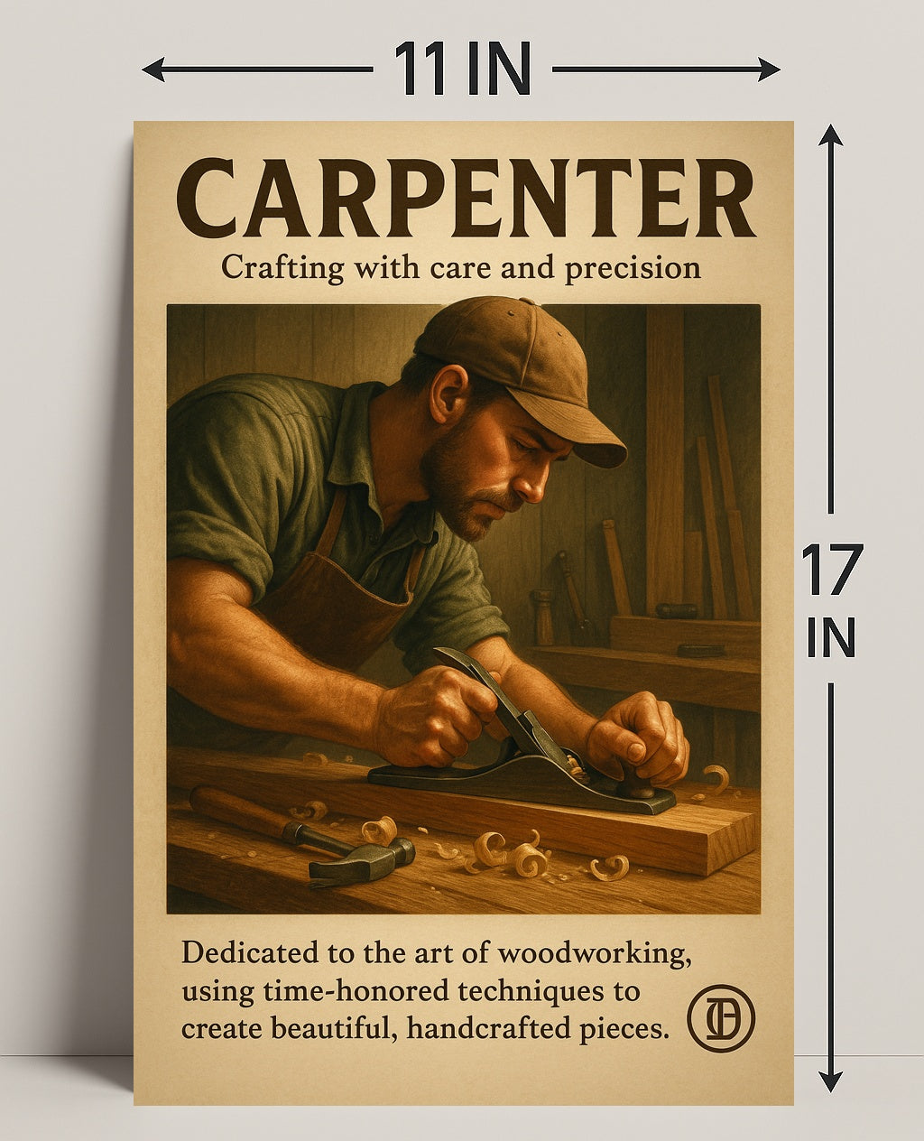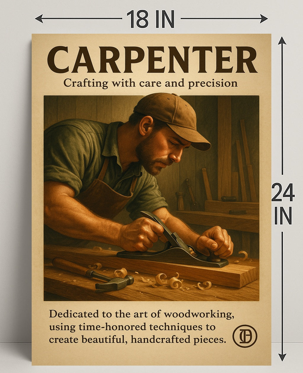 Capture the timeless craft of woodworking with "The Art of Carpentry" wall art print from PosterGoat — a vintage-inspired poster that celebrates precision, patience, and handmade beauty. This striking print features a focused carpenter using a hand plane on a plank, surrounded by curled wood shavings and classic workshop tools, rendered in warm, earthy tones that bring calm and character to any room.