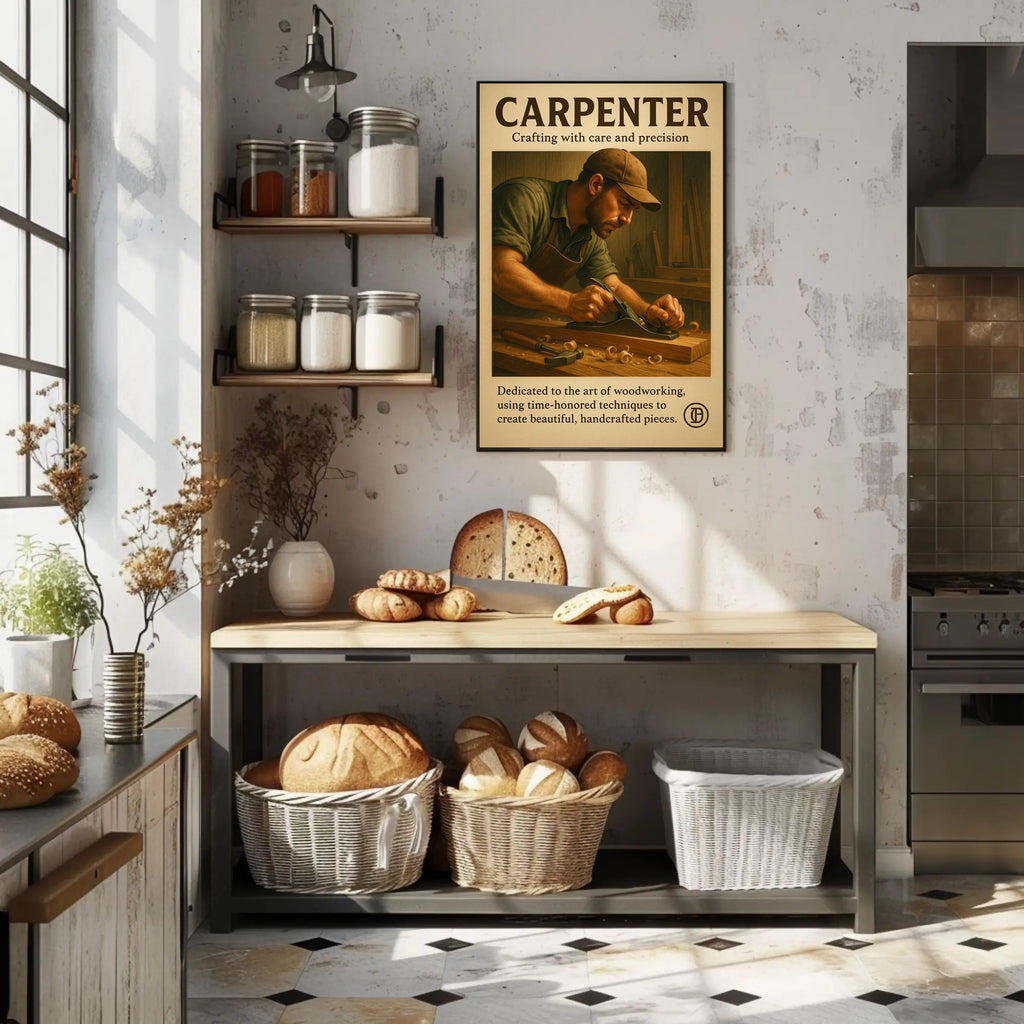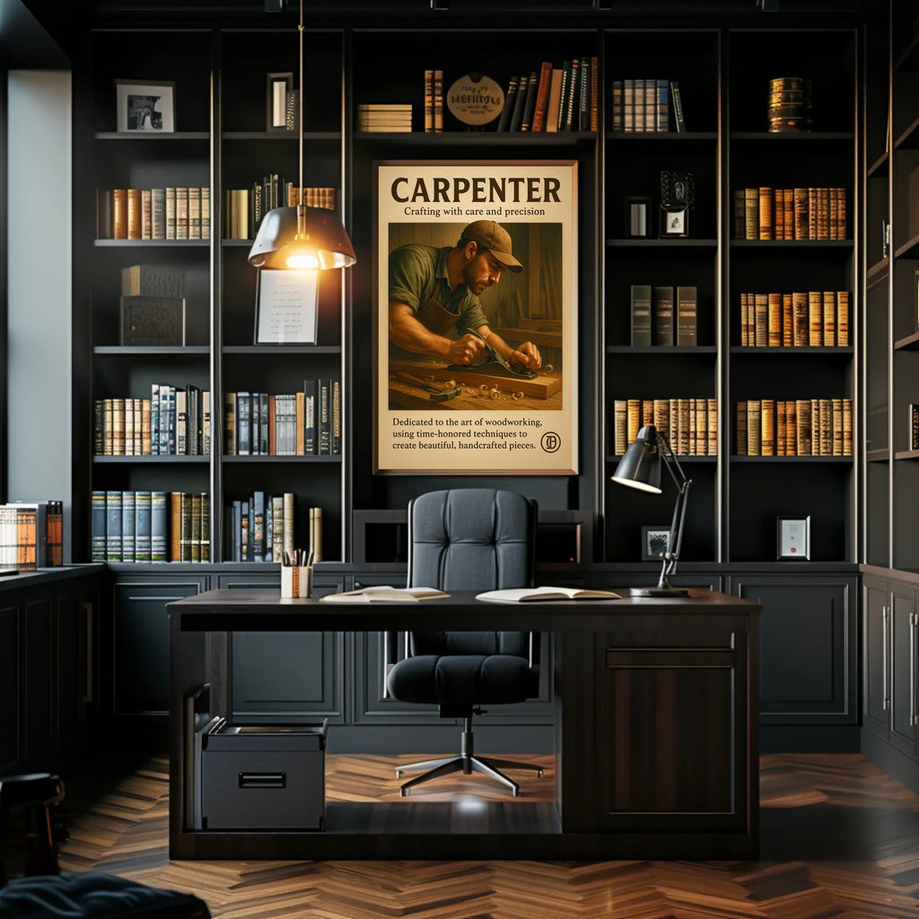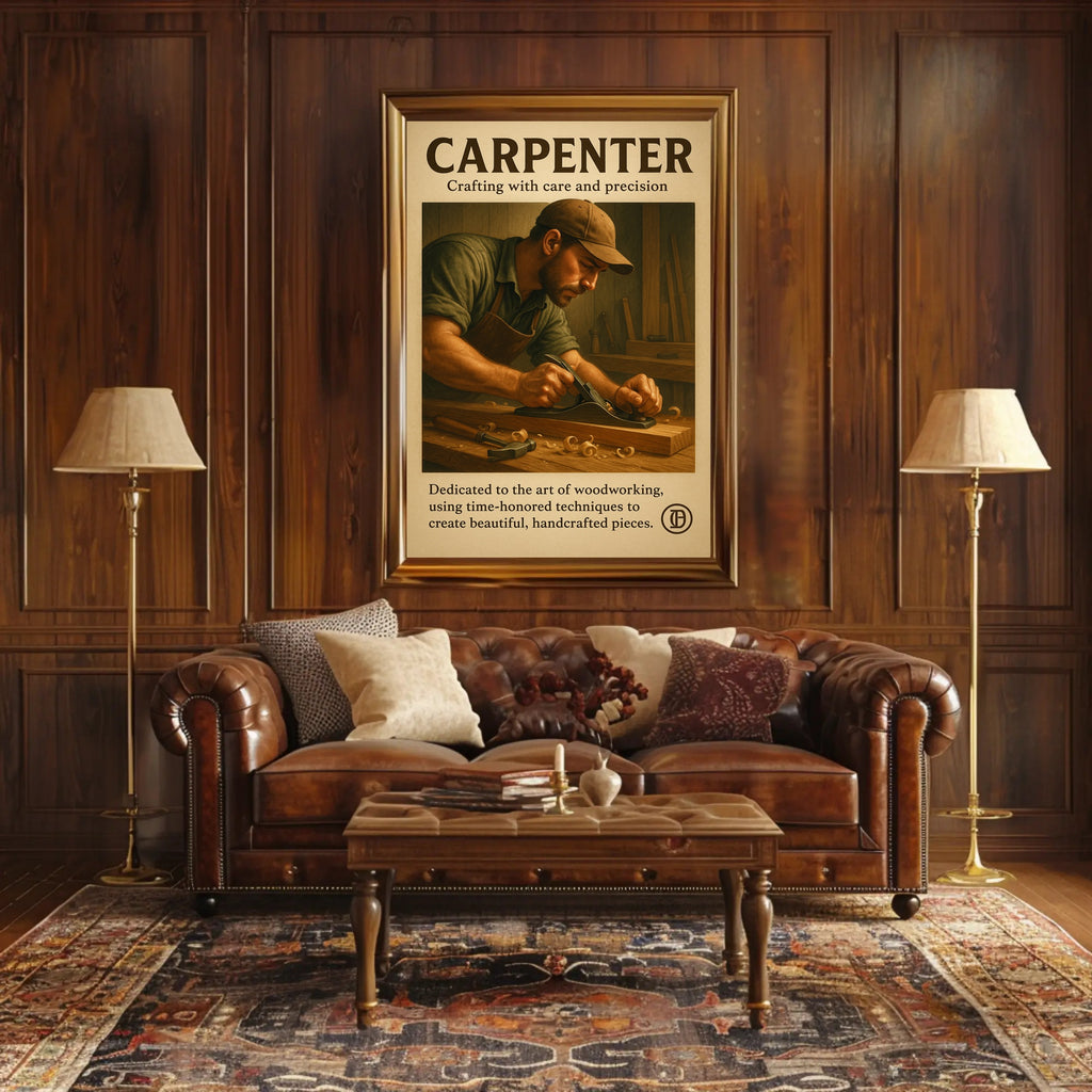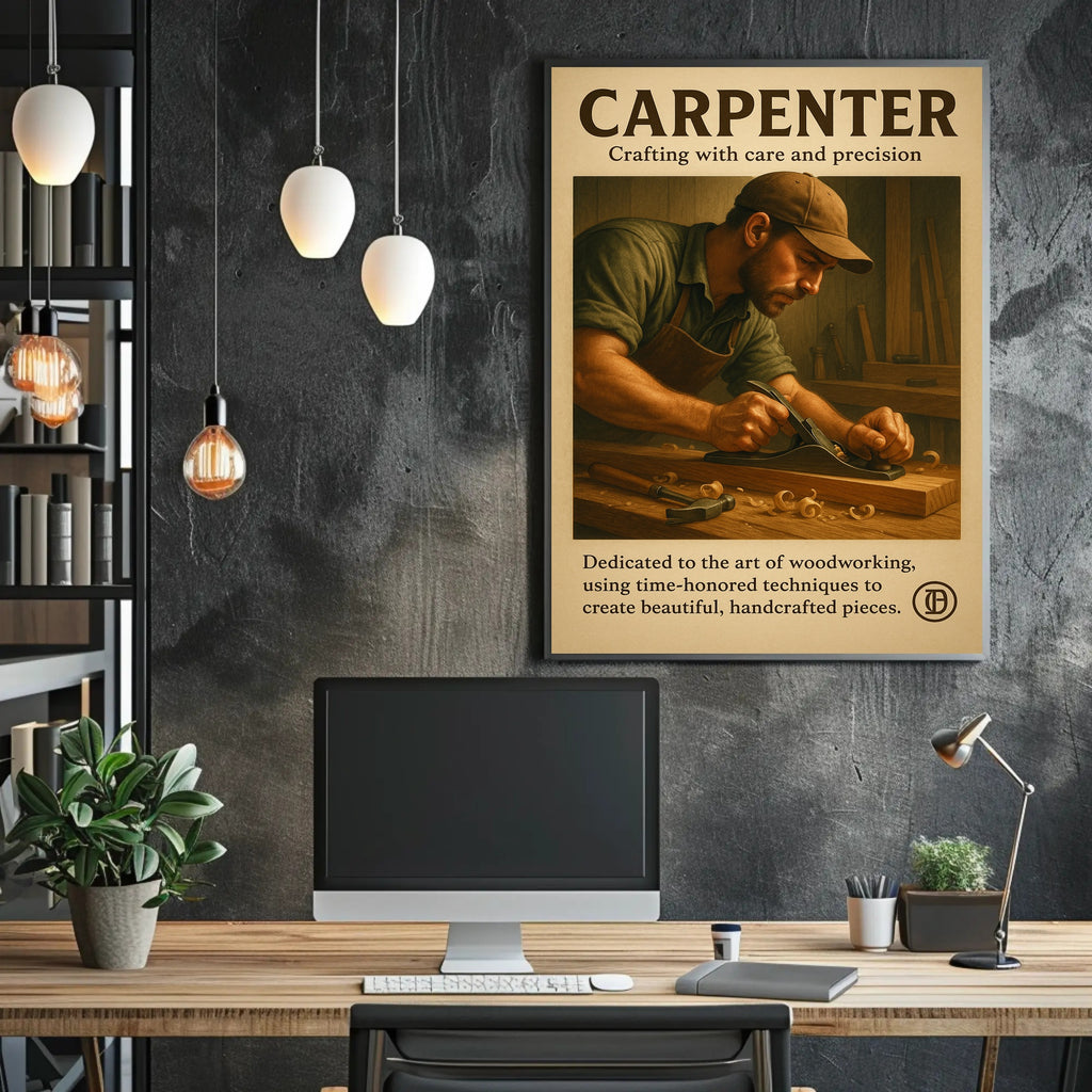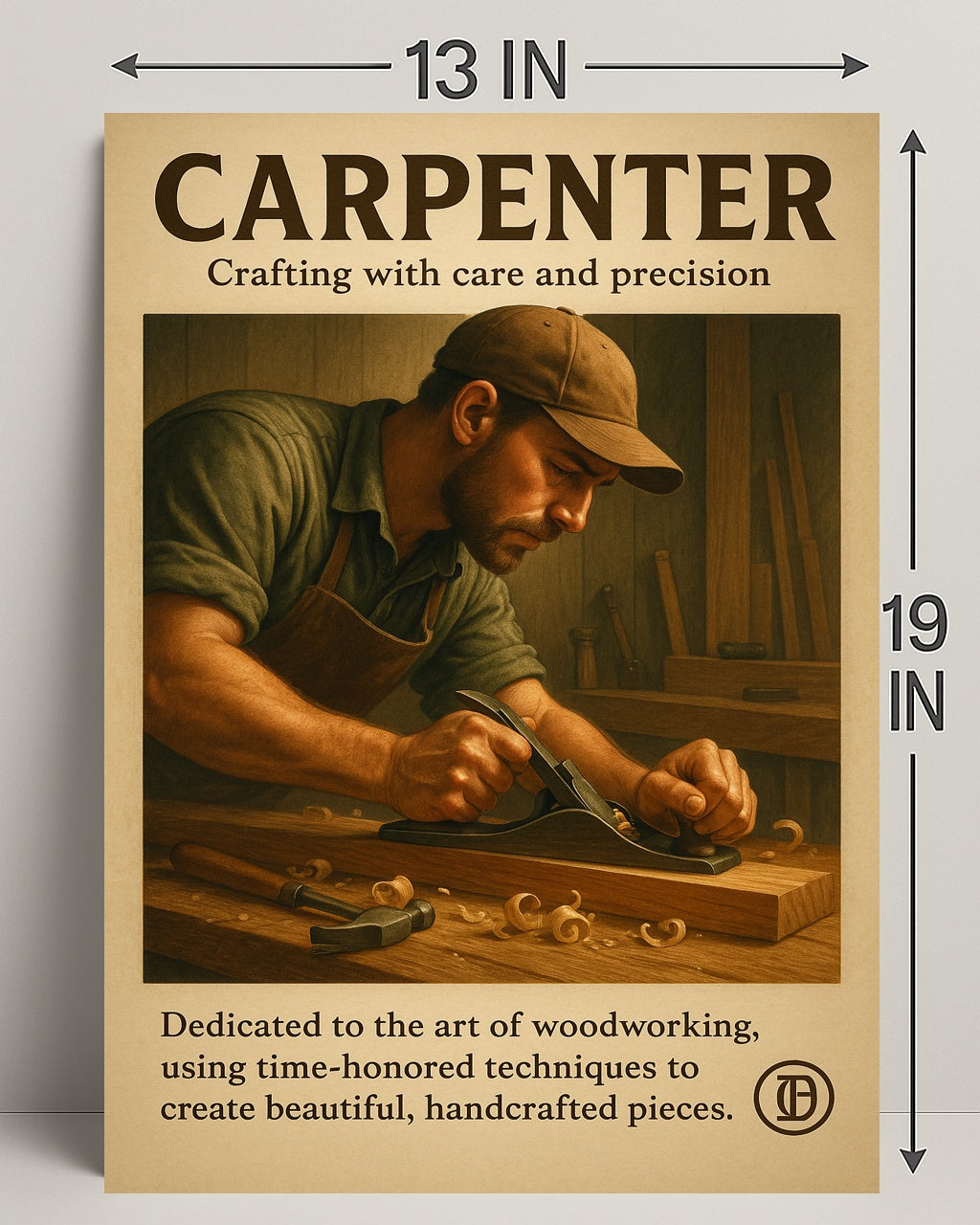 Capture the timeless craft of woodworking with "The Art of Carpentry" wall art print from PosterGoat — a vintage-inspired poster that celebrates precision, patience, and handmade beauty. This striking print features a focused carpenter using a hand plane on a plank, surrounded by curled wood shavings and classic workshop tools, rendered in warm, earthy tones that bring calm and character to any room.