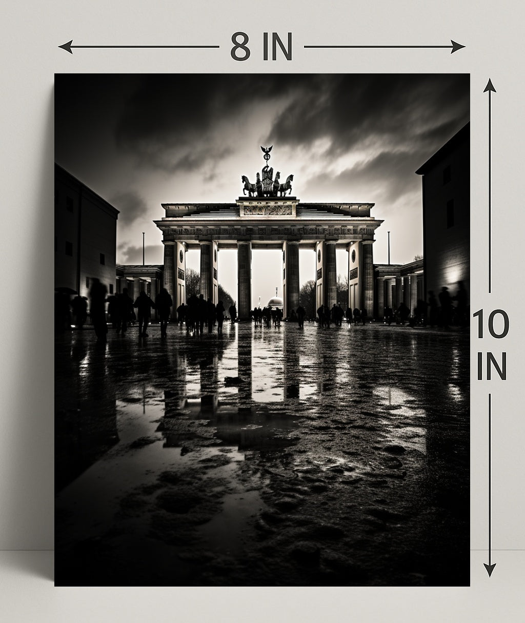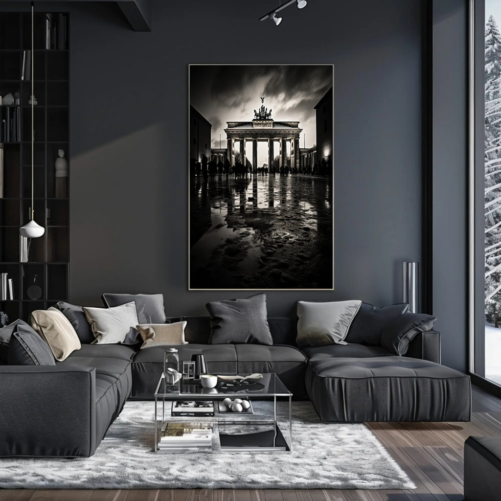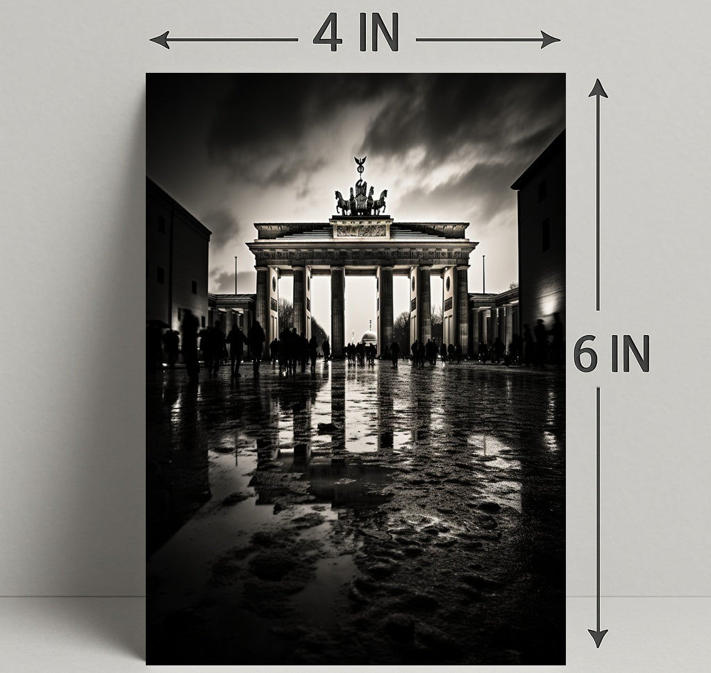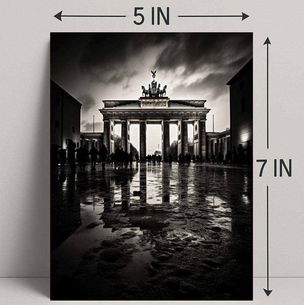 The Brandenburg Gate At Dusk Poster from PosterGoat brings the timeless silhouette of Berlin’s most iconic landmark into your home with dramatic, minimalist flair. Captured in high-contrast monochrome at dusk, this poster emphasizes the Gate’s classical columns, the Quadriga crowning the top, and the moody sky reflected on a wet cobblestone foreground — a striking piece of wall art for travel lovers and design-conscious interiors.