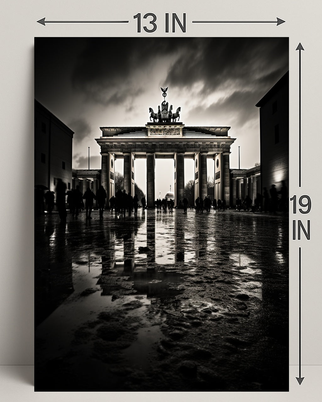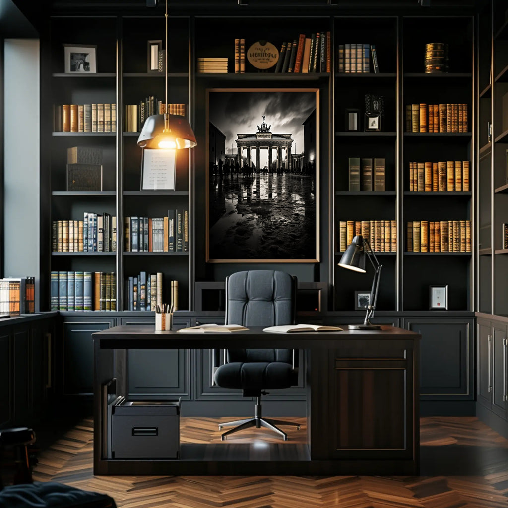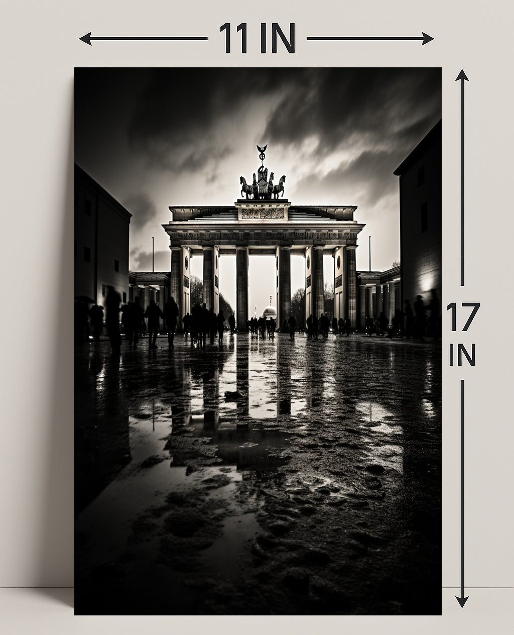 The Brandenburg Gate At Dusk Poster from PosterGoat brings the timeless silhouette of Berlin’s most iconic landmark into your home with dramatic, minimalist flair. Captured in high-contrast monochrome at dusk, this poster emphasizes the Gate’s classical columns, the Quadriga crowning the top, and the moody sky reflected on a wet cobblestone foreground — a striking piece of wall art for travel lovers and design-conscious interiors.
