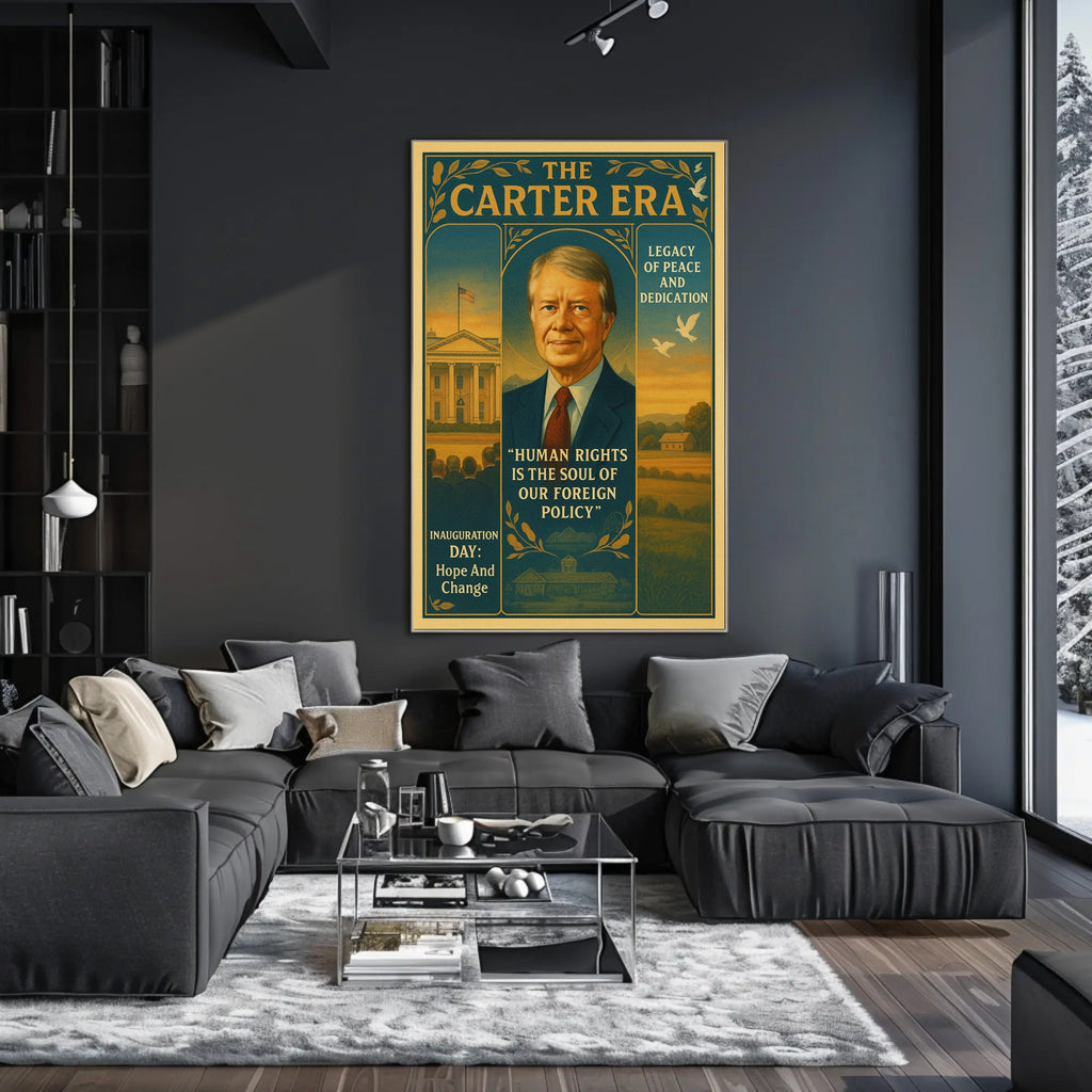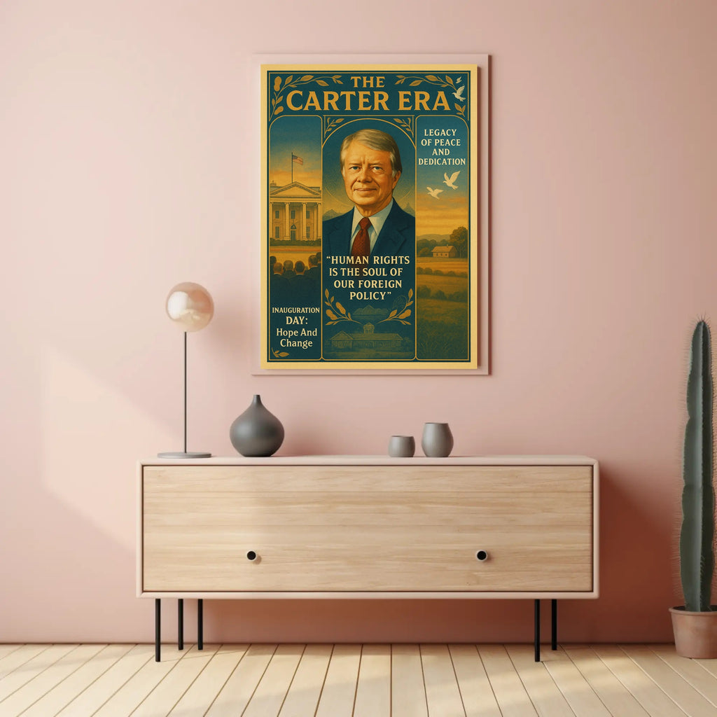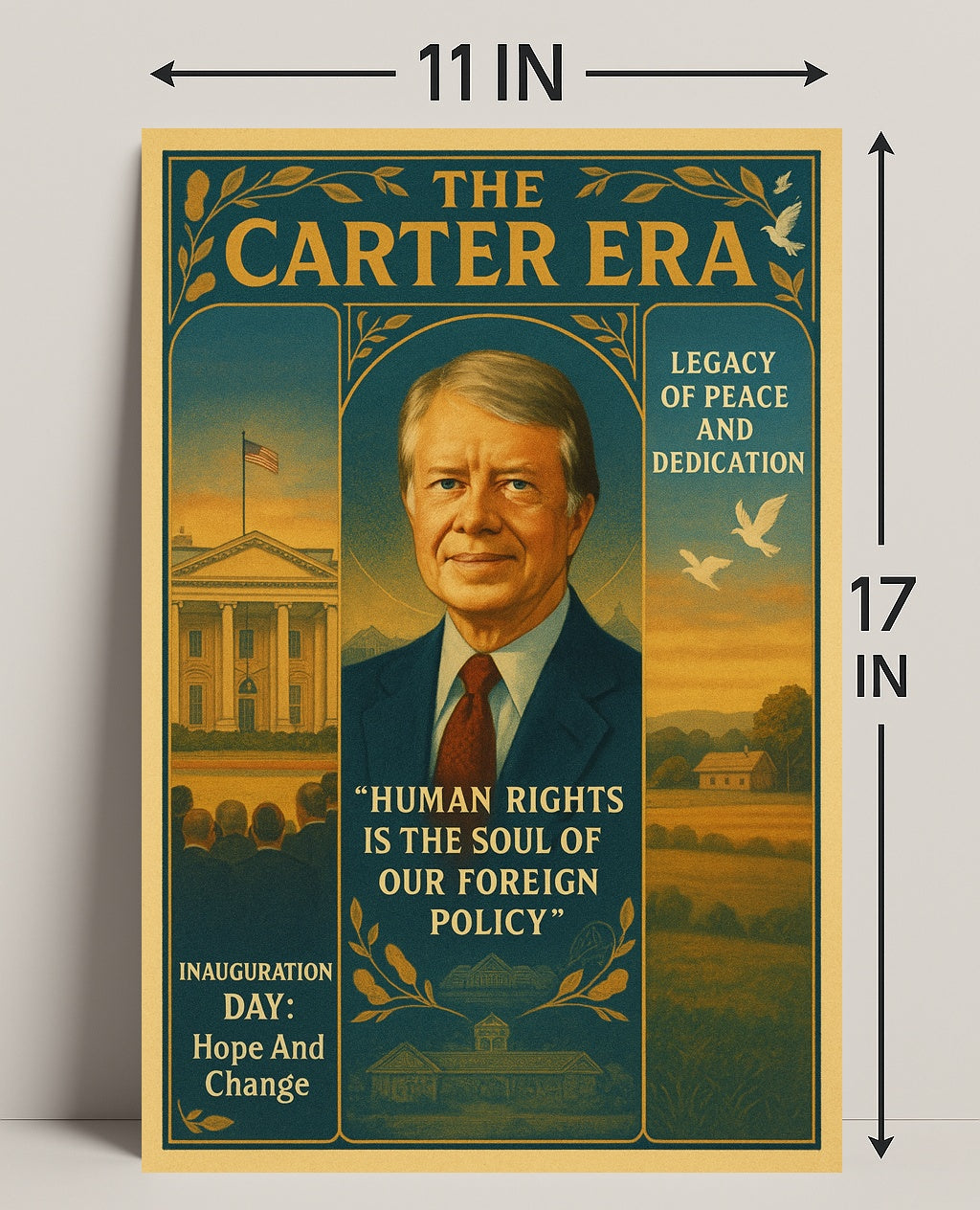 Capture a moment of inspired leadership with The Carter Era Poster — a vintage‑inspired art print from PosterGoat that blends nostalgic Americana with refined pop‑art styling. Rich teal and gold tones frame a dignified portrait set between scenes of the White House and a peaceful countryside, accented by soaring doves and classic ornamental flourishes. This scenic poster is designed to be a focal point in living rooms, offices, study spaces, or anywhere wall art makes a statement.