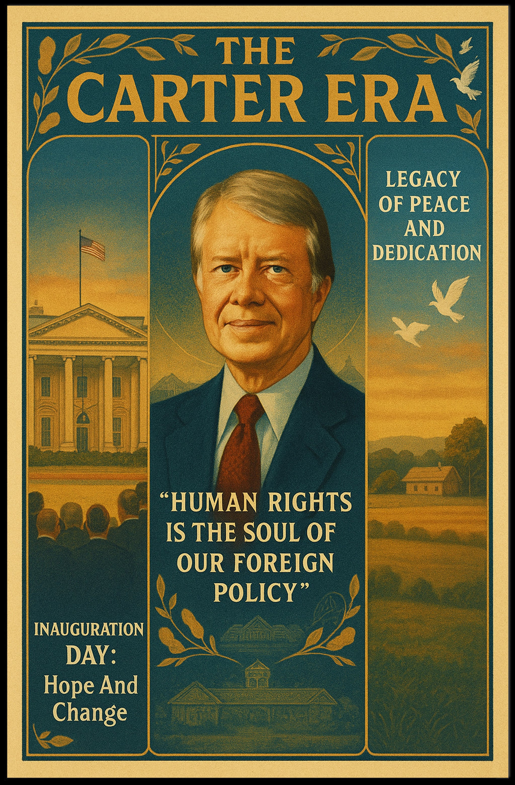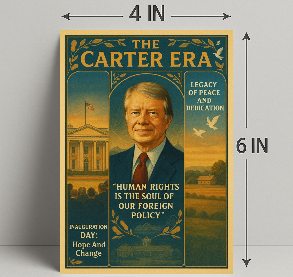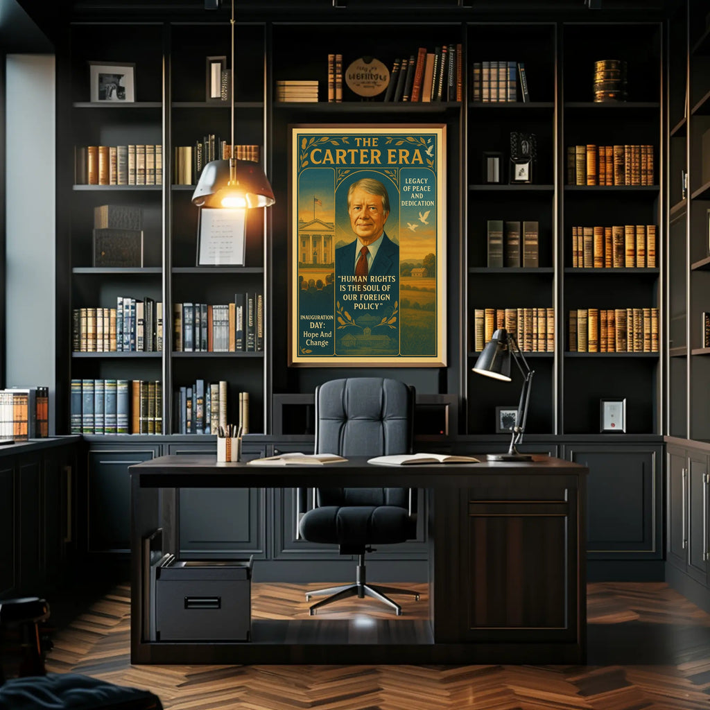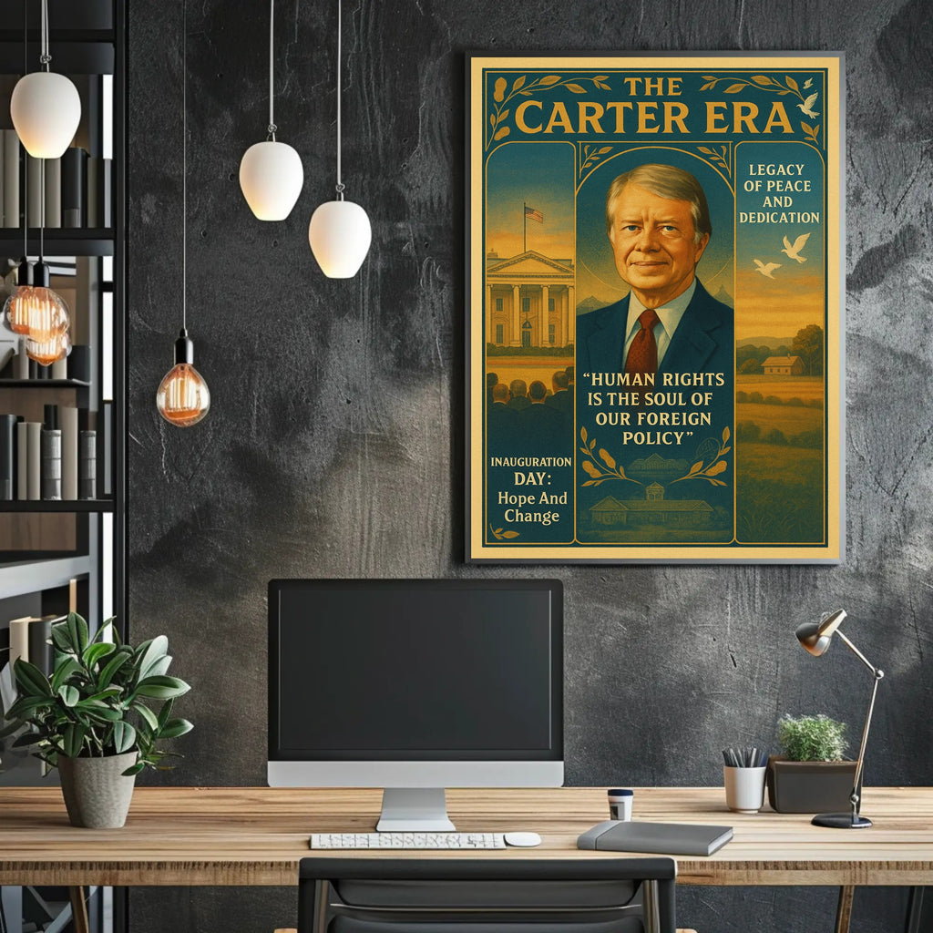 Capture a moment of inspired leadership with The Carter Era Poster — a vintage‑inspired art print from PosterGoat that blends nostalgic Americana with refined pop‑art styling. Rich teal and gold tones frame a dignified portrait set between scenes of the White House and a peaceful countryside, accented by soaring doves and classic ornamental flourishes. This scenic poster is designed to be a focal point in living rooms, offices, study spaces, or anywhere wall art makes a statement.