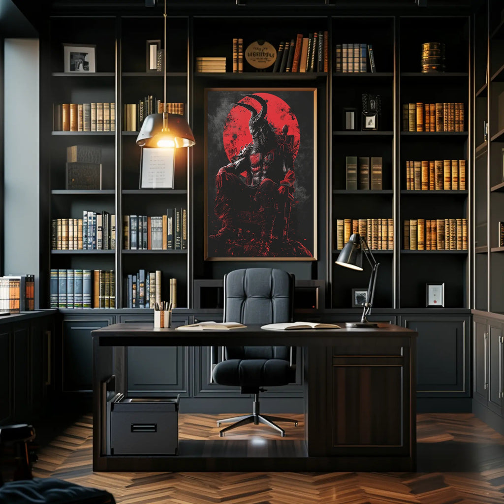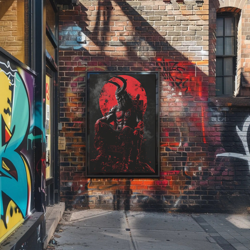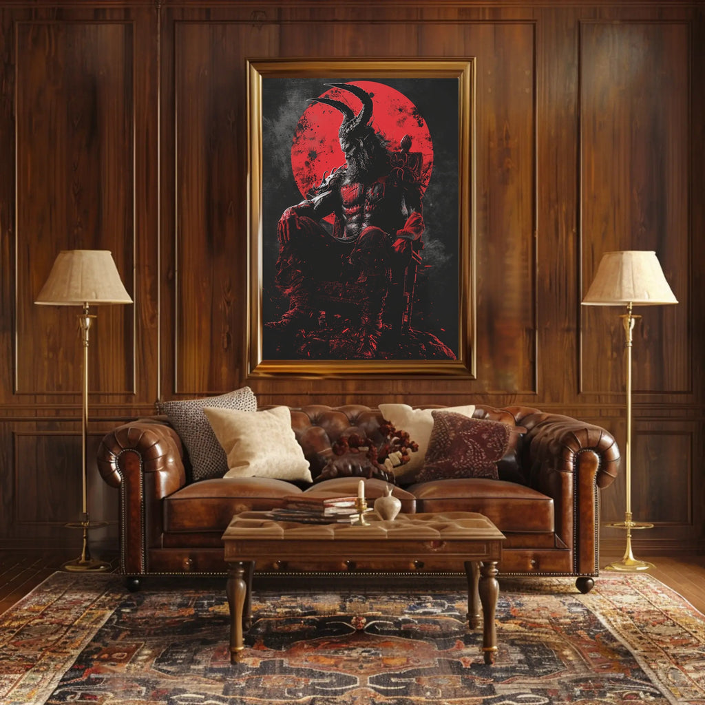 This minimalist, high-contrast poster blends deep blacks and vivid crimson highlights to create a powerful focal point. The intricately textured figure with sweeping horns and sculpted musculature is rendered with cinematic detail, while splattered ink effects and ash-like accents add a gritty, artistic edge.