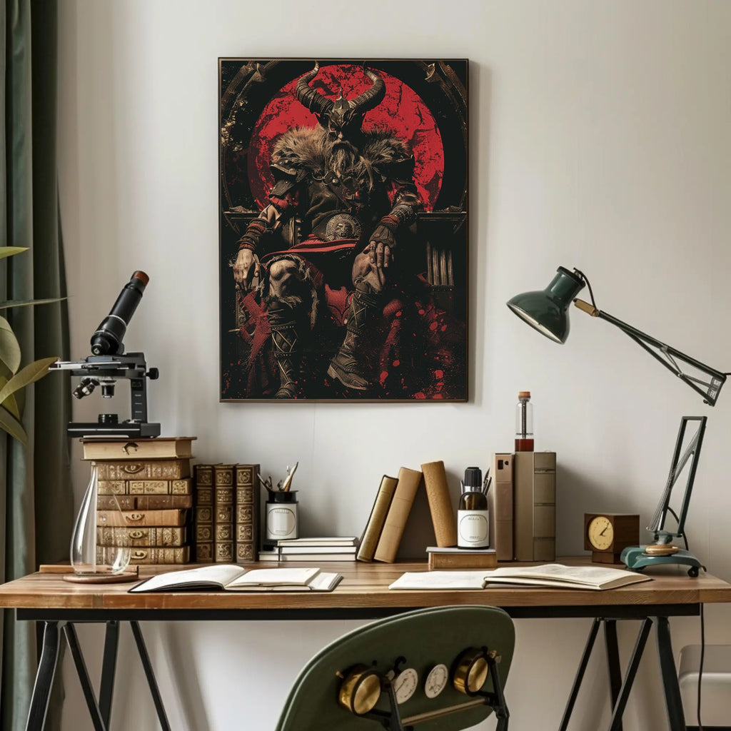 This striking poster depicts a horned warlord seated on a throne before a blood-red moon, cloaked in fur and battle-worn leathers. Intricate details — from the carved helm and ornate belt medallion to the laced boots and torn fabric — combine with distressed textures and splattered accents to deliver a bold statement that elevates any room.