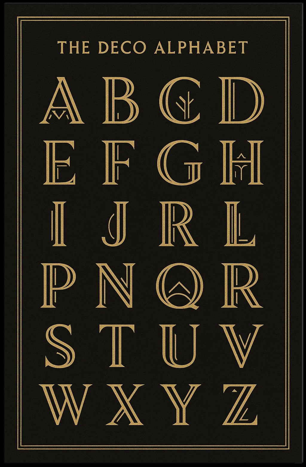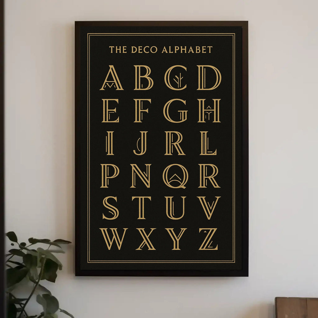 Immerse yourself in the elegance of the early 20th century with this exquisite Art Deco poster. Featuring "The Deco Alphabet," this piece is a stunning example of decorative typography. The poster artfully presents the alphabet in a geometric, symmetrical layout, capturing the essence of the Art Deco movement. Each letter is crafted with precision, displaying intricate details that are beautifully contrasted against a dark background. This artistic masterpiece evokes a sense of sophistication and nostalgia, making it an ideal choice for those who appreciate historic design and timeless elegance in their decor.