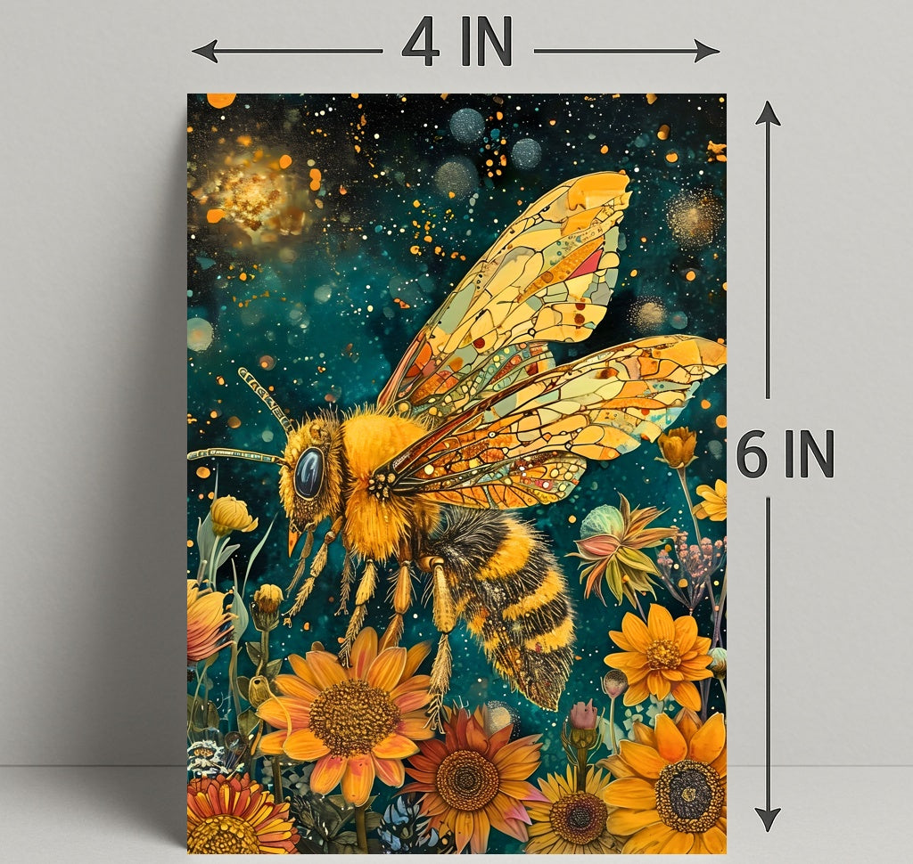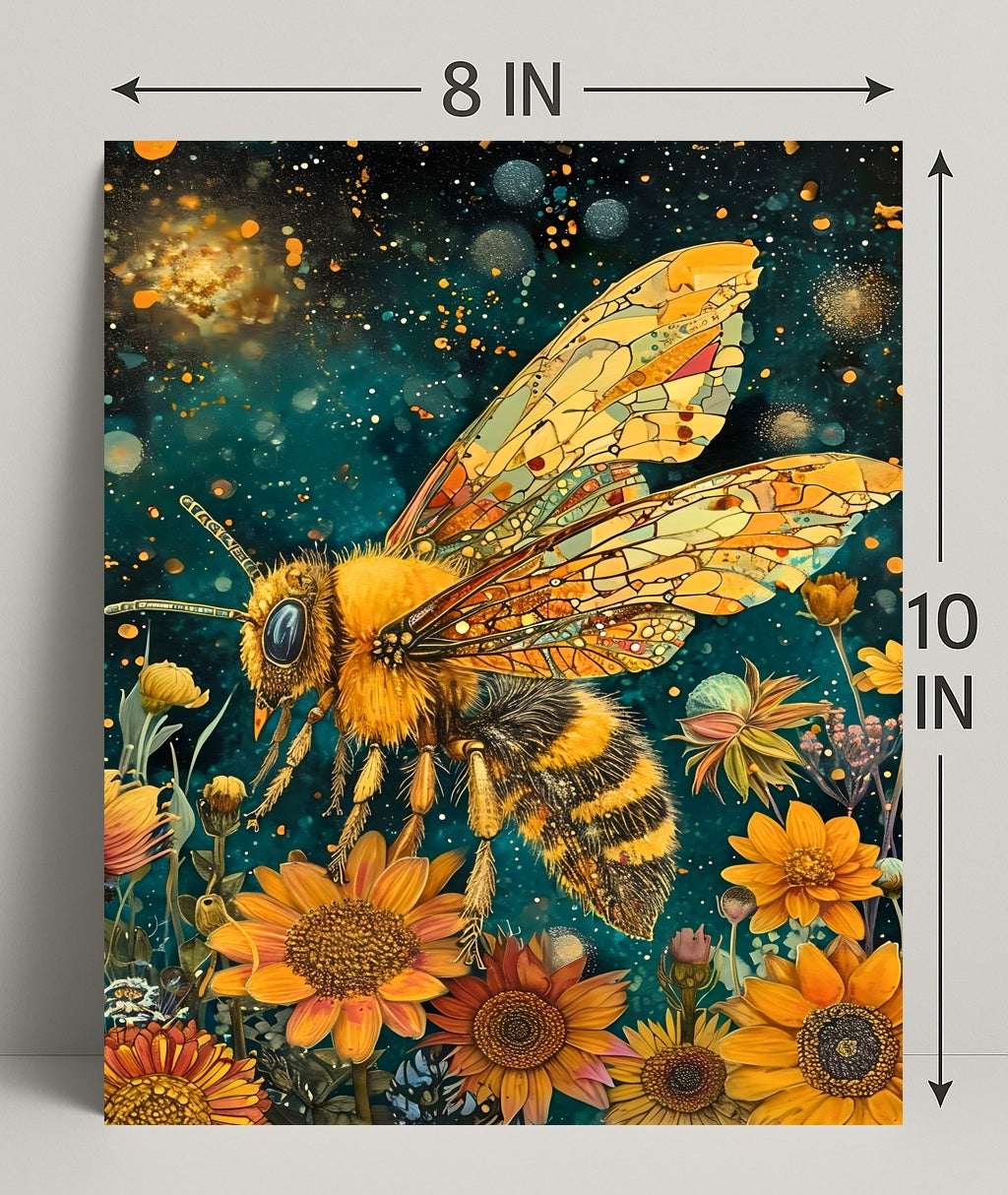 Bring a touch of classic charm and modern whimsy to your walls with The Enchanted Bee William Morris Art Poster from PosterGoat. This striking poster captures a richly detailed bumblebee rendered like stained glass — iridescent, mosaic-style wings and a plush, golden body — set against a deep teal, star-speckled sky and a blossoming bed of sunflowers and wild blooms. The result is an enchanting focal piece that blends William Morris-inspired motifs with contemporary, minimalist sensibilities.