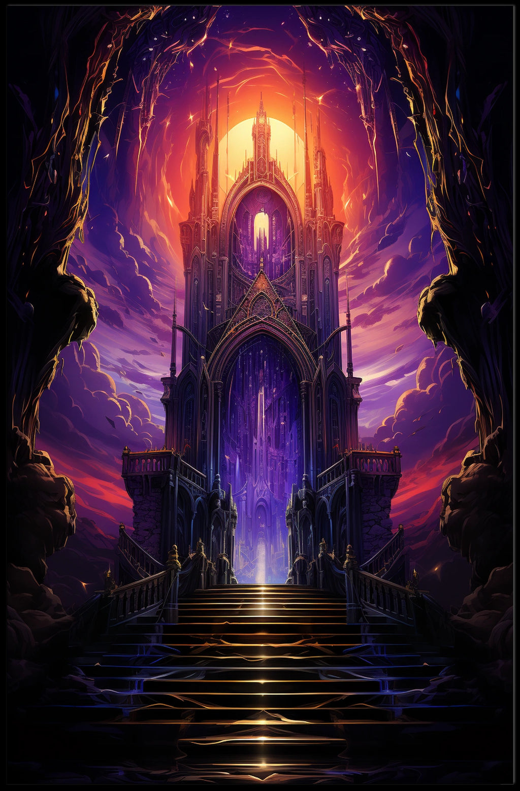 - Golden-lit stairs motif — a striking focal point that guides the eye upward, conveying grandeur, ascent, and hope.