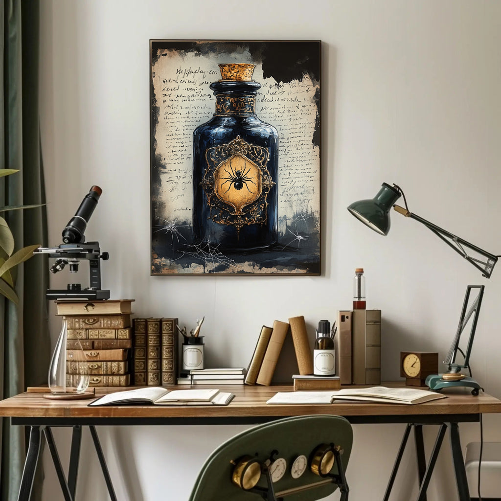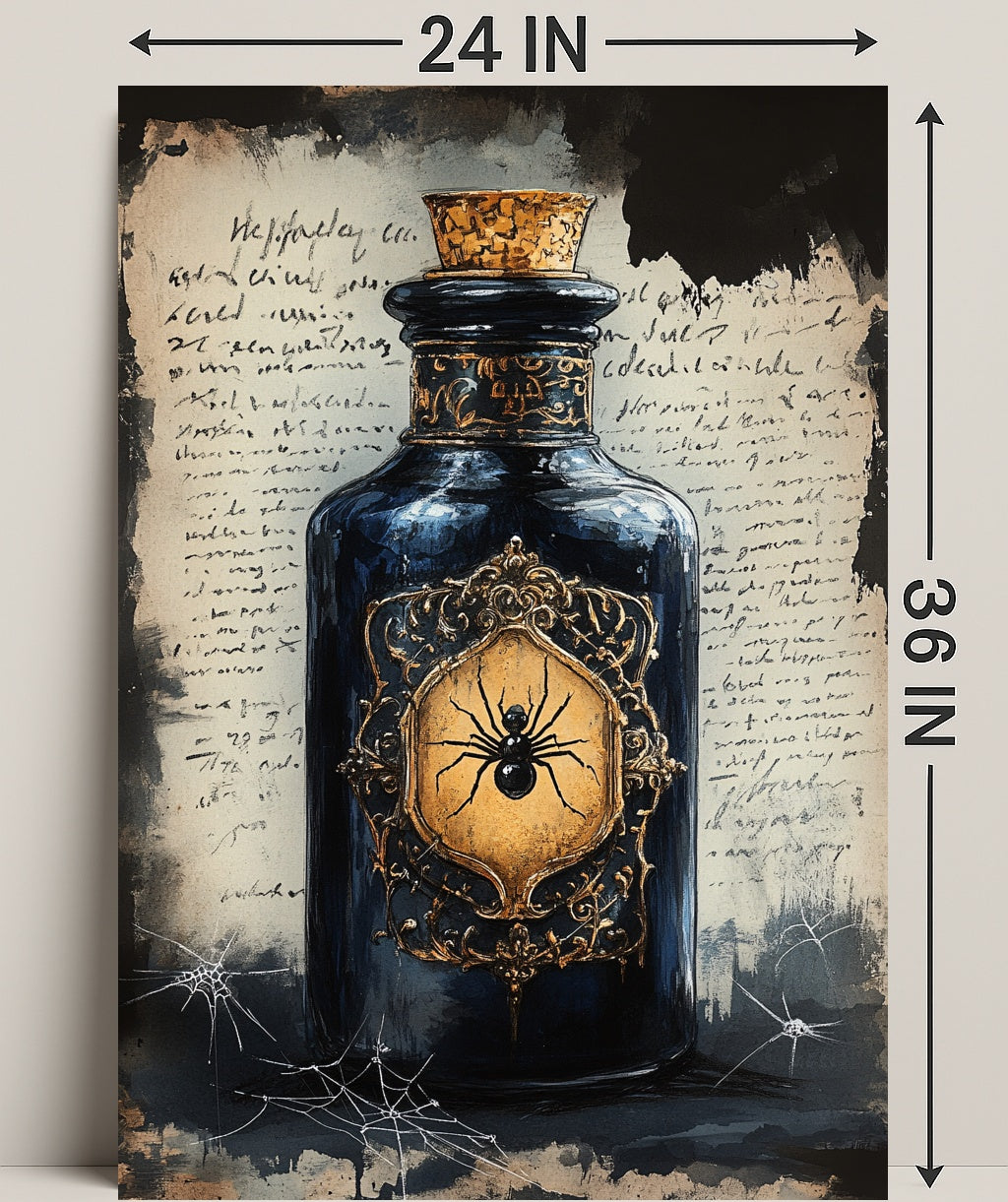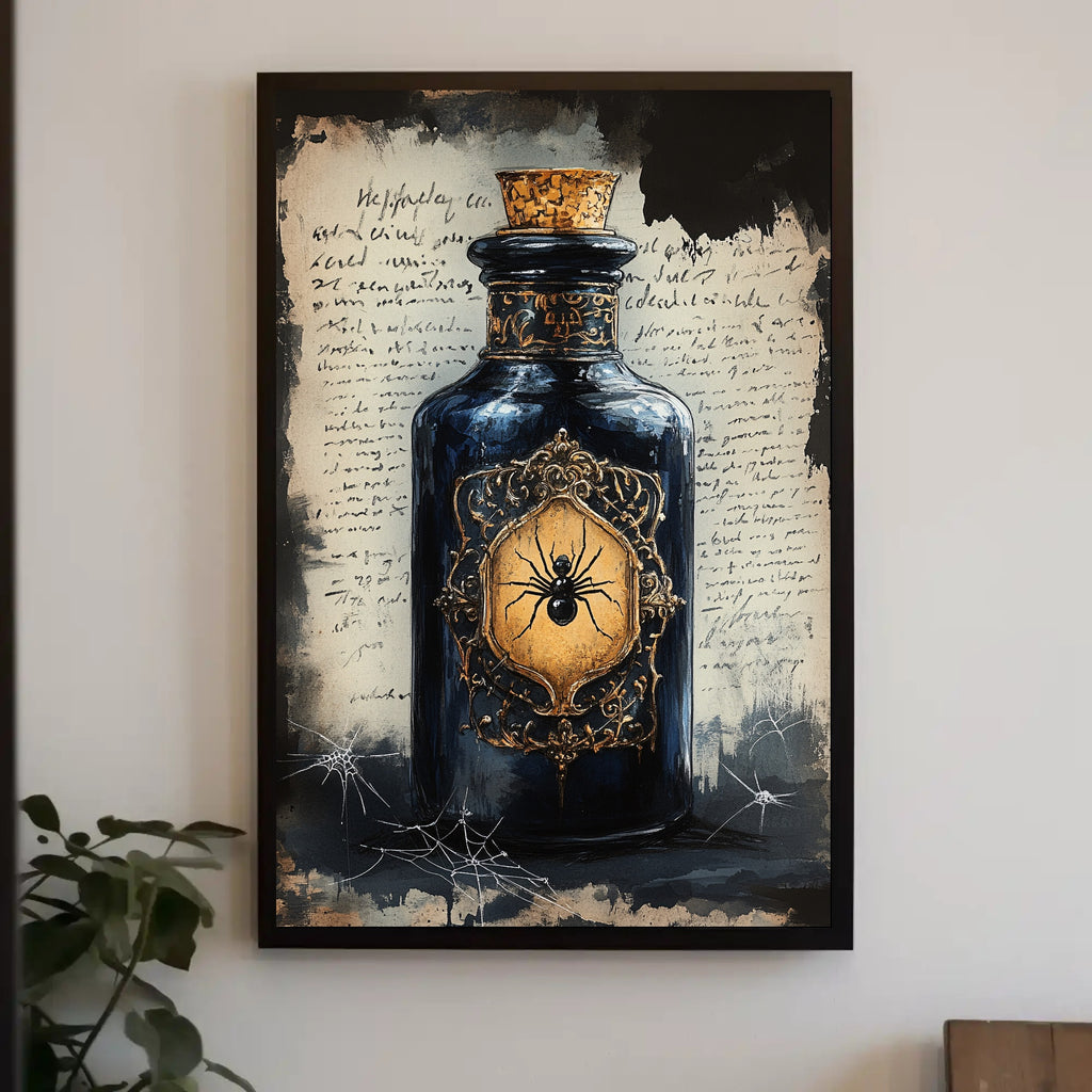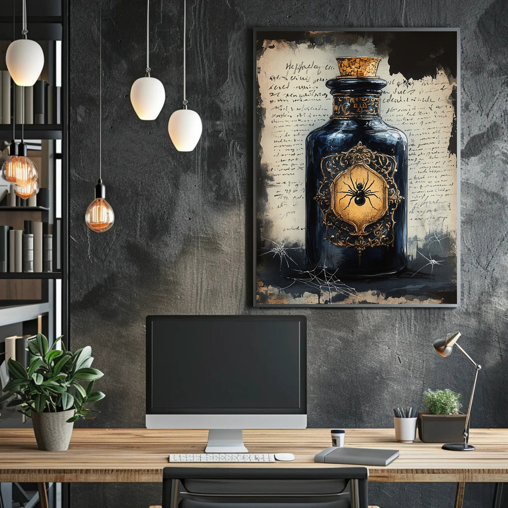 Invite mystery and vintage charm into your home with The Enchanted Elixir Poster by PosterGoat — a striking art print that blends pop-art flair with antique apothecary aesthetics. At its center, a glossy deep-blue elixir bottle framed with ornate gold filigree and a bold spider emblem sits against a textured parchment backdrop of handwritten notes and delicate cobwebs. This poster creates an evocative focal point for living rooms, studies, game rooms, or seasonal Halloween displays.