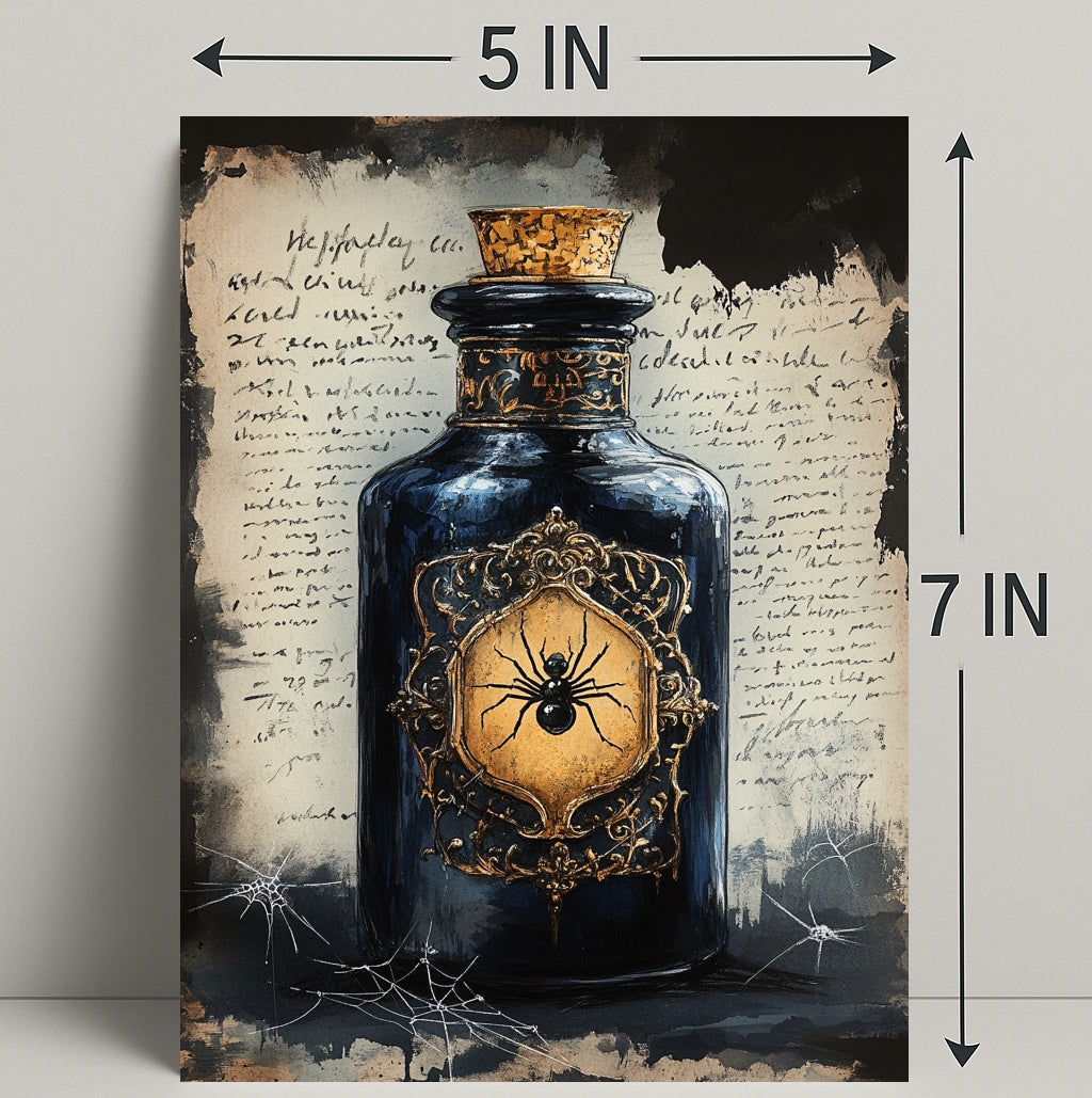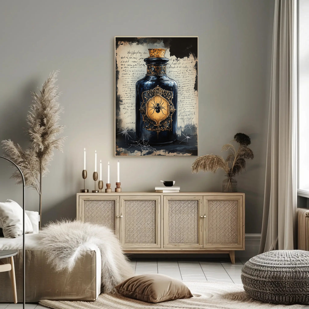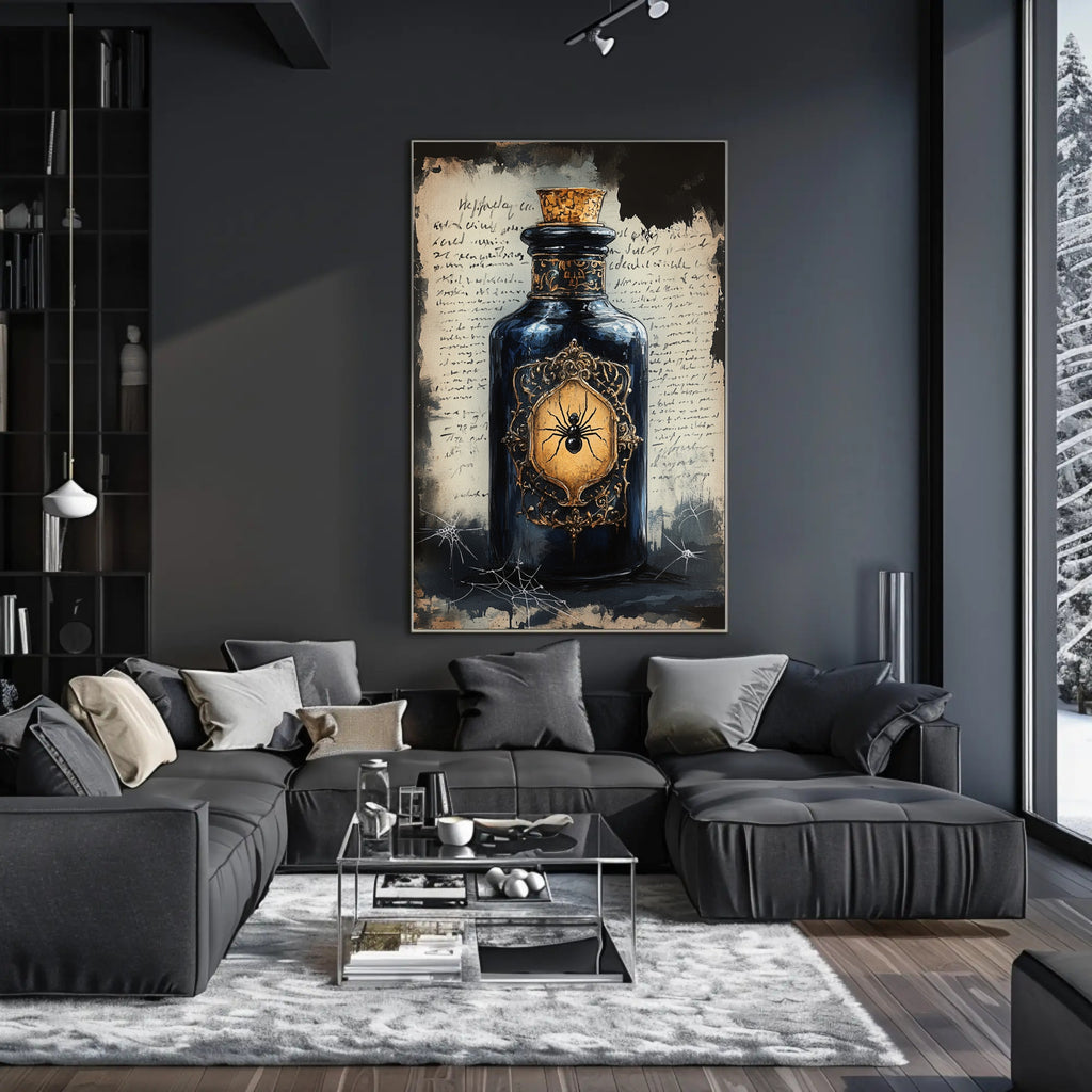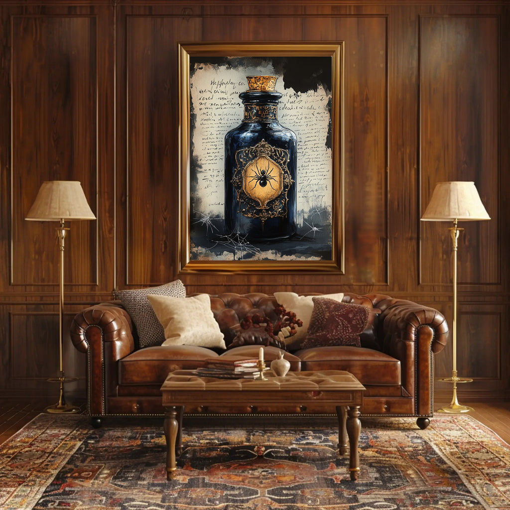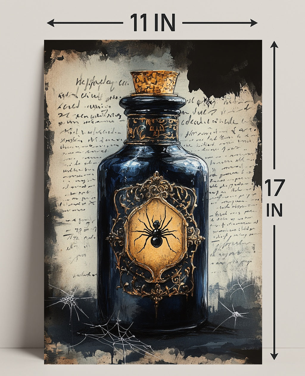 Invite mystery and vintage charm into your home with The Enchanted Elixir Poster by PosterGoat — a striking art print that blends pop-art flair with antique apothecary aesthetics. At its center, a glossy deep-blue elixir bottle framed with ornate gold filigree and a bold spider emblem sits against a textured parchment backdrop of handwritten notes and delicate cobwebs. This poster creates an evocative focal point for living rooms, studies, game rooms, or seasonal Halloween displays.