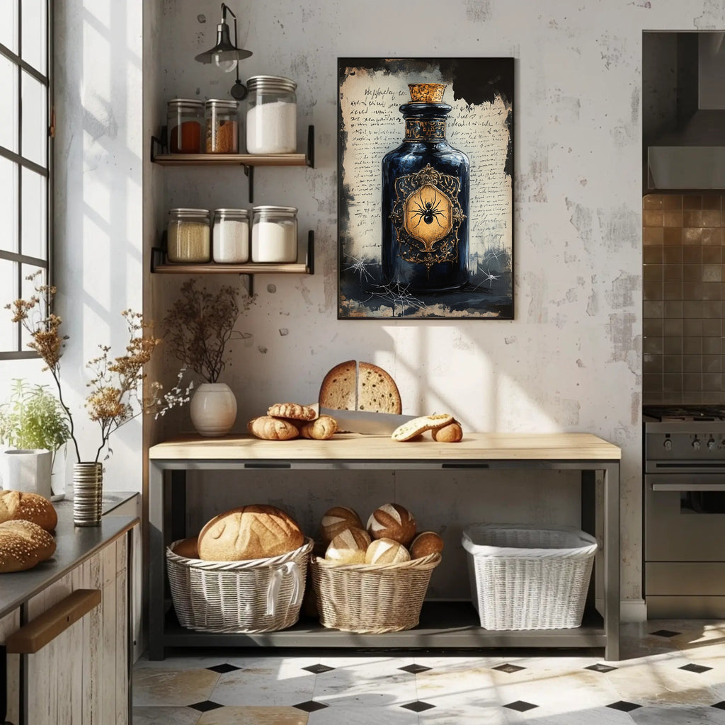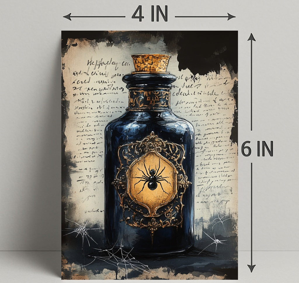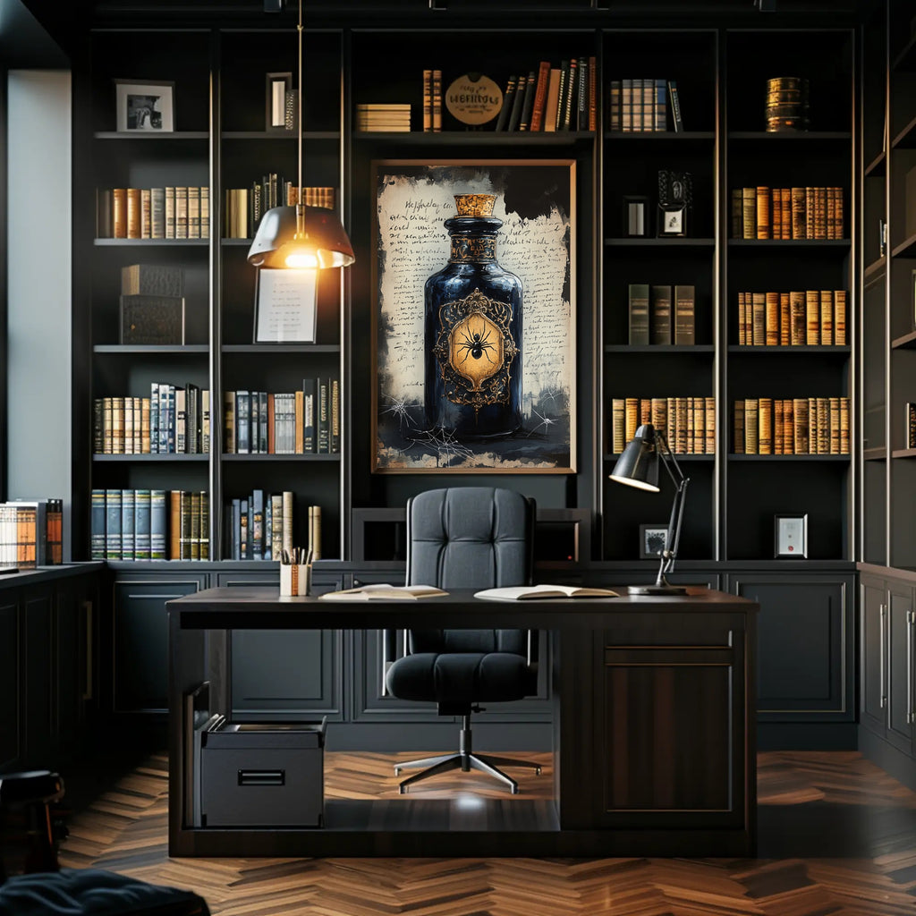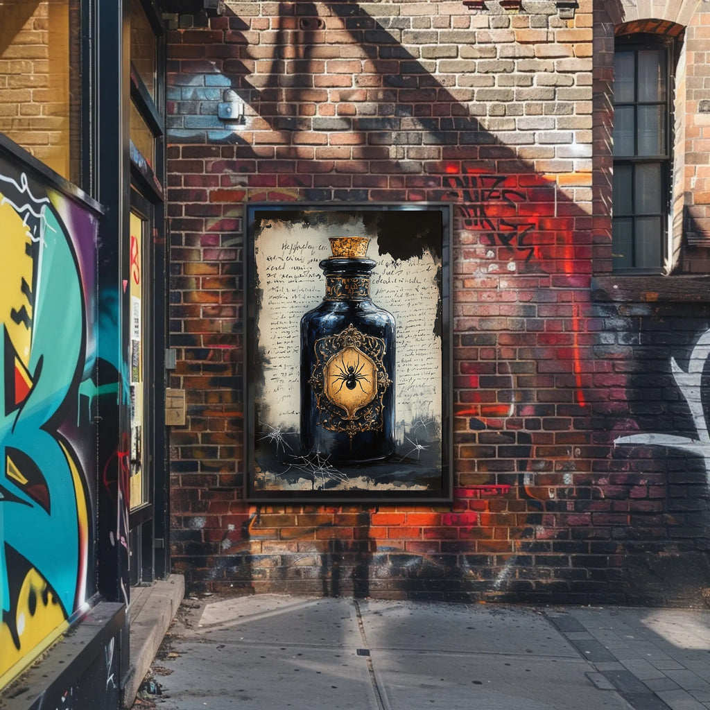 Invite mystery and vintage charm into your home with The Enchanted Elixir Poster by PosterGoat — a striking art print that blends pop-art flair with antique apothecary aesthetics. At its center, a glossy deep-blue elixir bottle framed with ornate gold filigree and a bold spider emblem sits against a textured parchment backdrop of handwritten notes and delicate cobwebs. This poster creates an evocative focal point for living rooms, studies, game rooms, or seasonal Halloween displays.