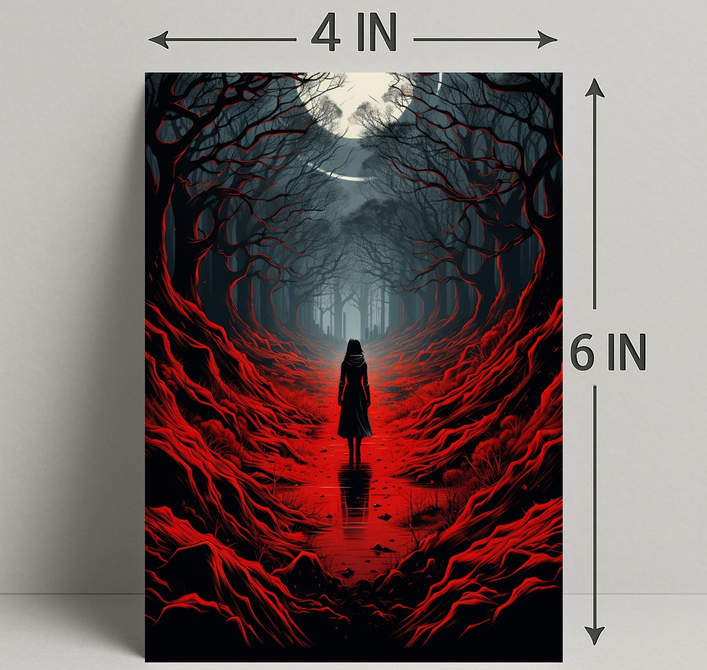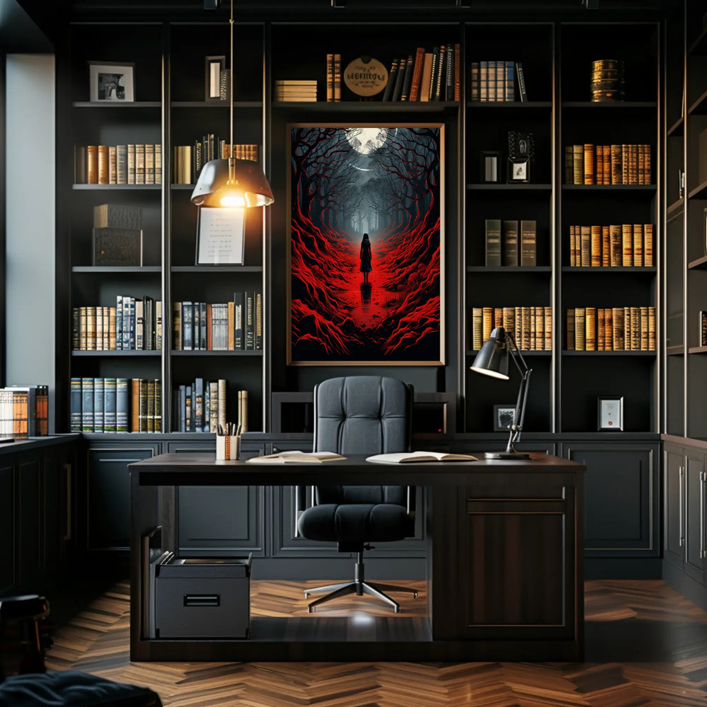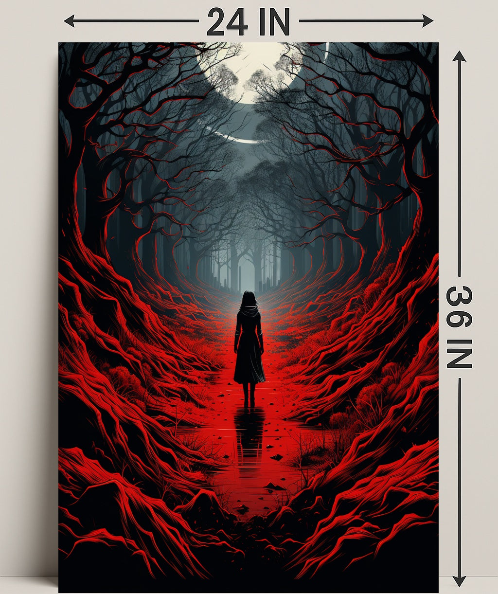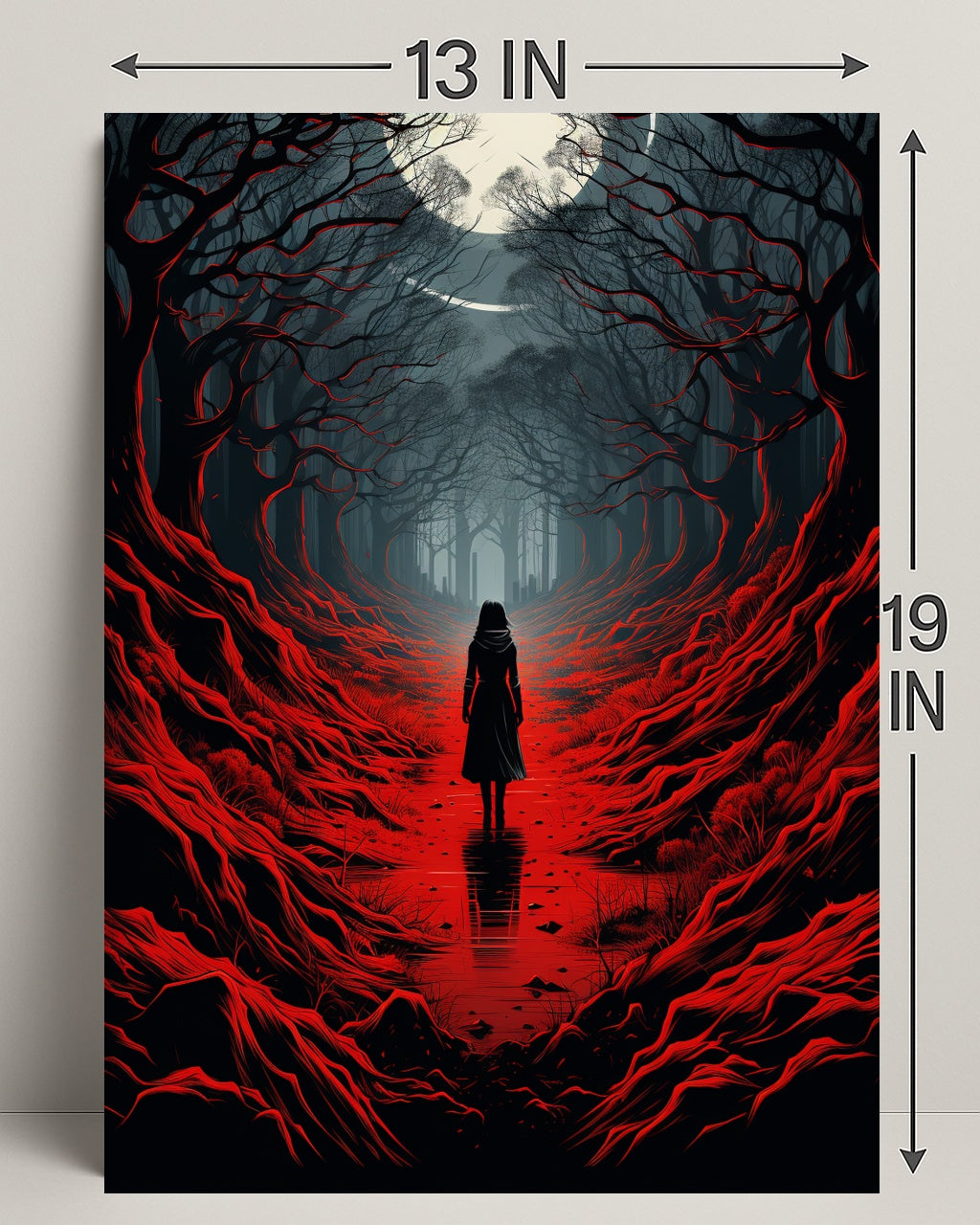 Dramatic composition: A lone silhouette walks a glowing red path framed by gnarled, arching trees and a moonlit canopy — an instantly captivating focal point for living rooms, bedrooms, offices, or studio spaces.