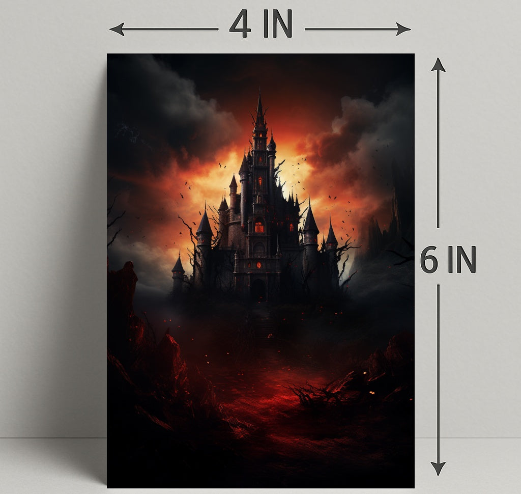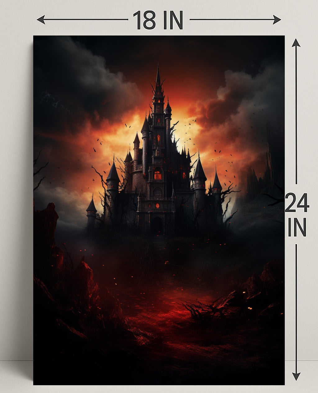 Bring a touch of dramatic fantasy to your walls with The Enchanted Fortress Poster by PosterGoat. This atmospheric poster features a towering, spired fortress silhouetted against a burning, cloud-streaked sky and a blood-red foreground — a striking centerpiece for any home decor or artwork collection. Ideal for lovers of enchanted, scenic wall art and anyone wanting a moody focal point in living rooms, bedrooms, or home offices.