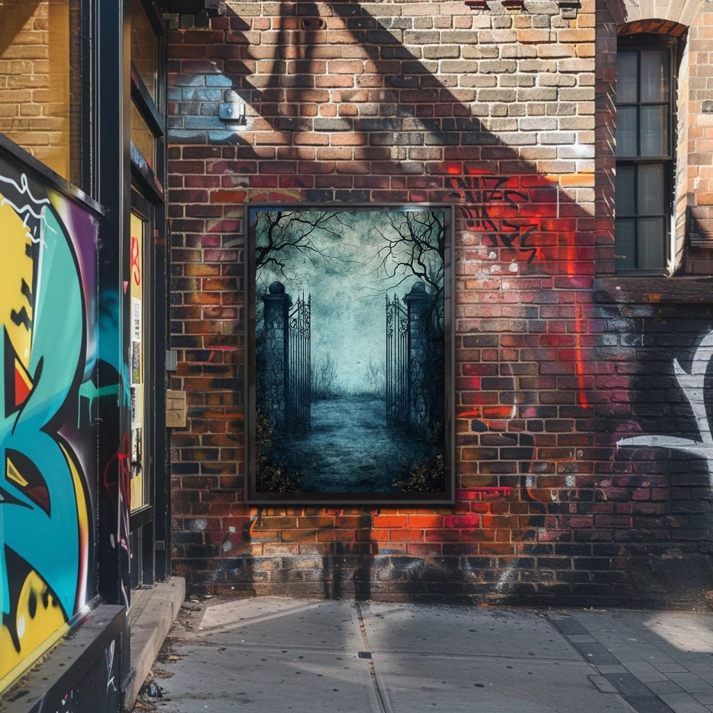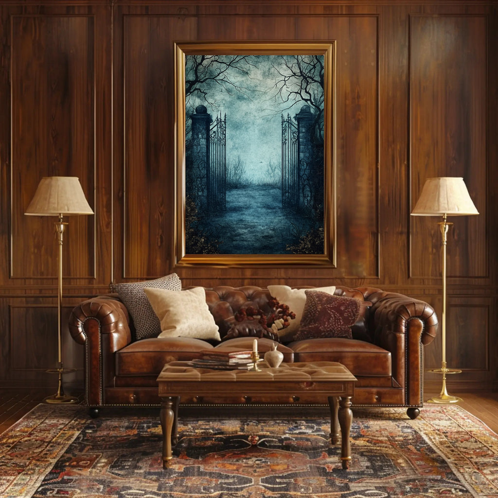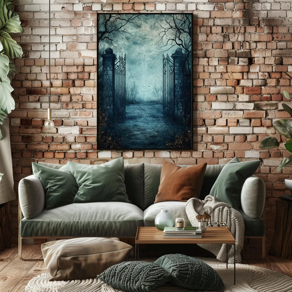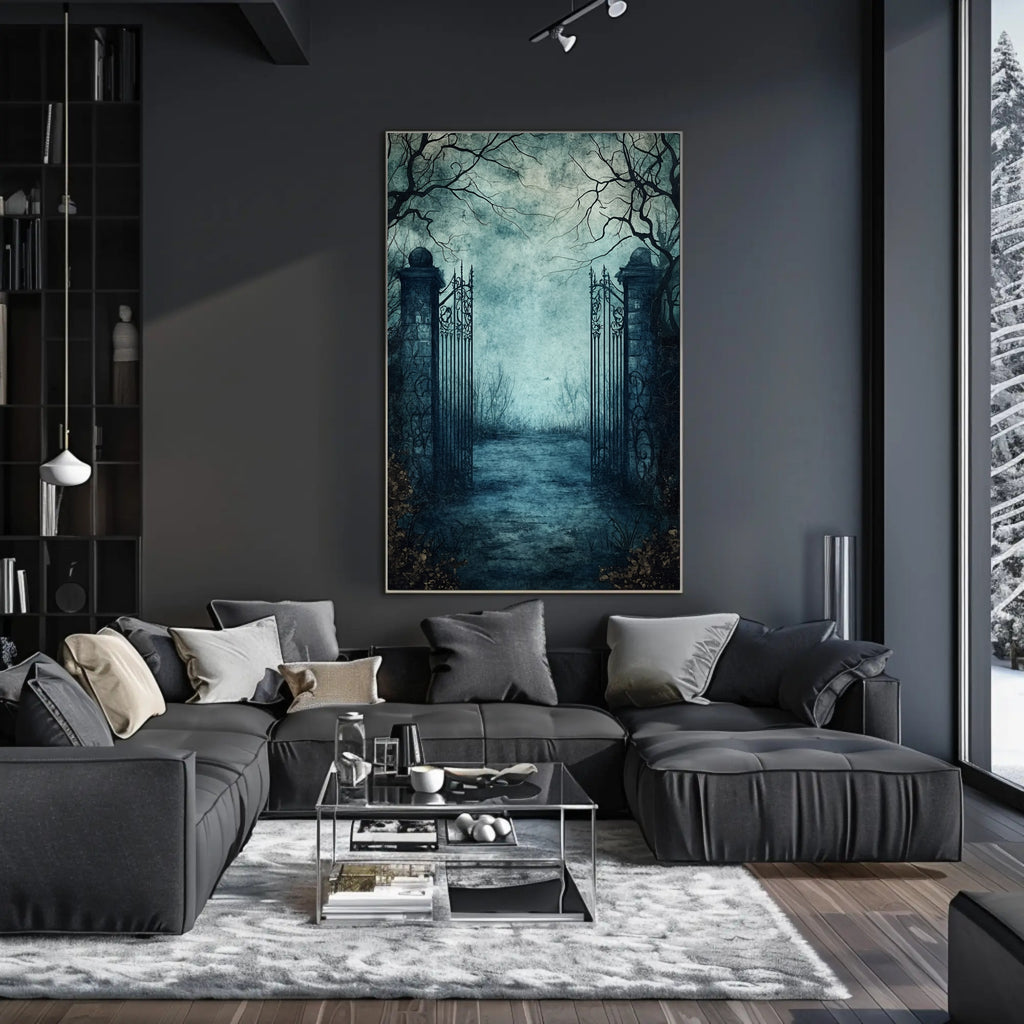 Step through a doorway of imagination. The Enchanted Gate Poster from PosterGoat captures a hauntingly beautiful scene: ornate wrought-iron gates parting into a misted, teal-blue landscape framed by skeletal branches and textured atmospheric sky. This art print blends minimalist composition with rich, moody detail to create a statement piece that elevates living rooms, hallways, bedrooms, and seasonal displays.