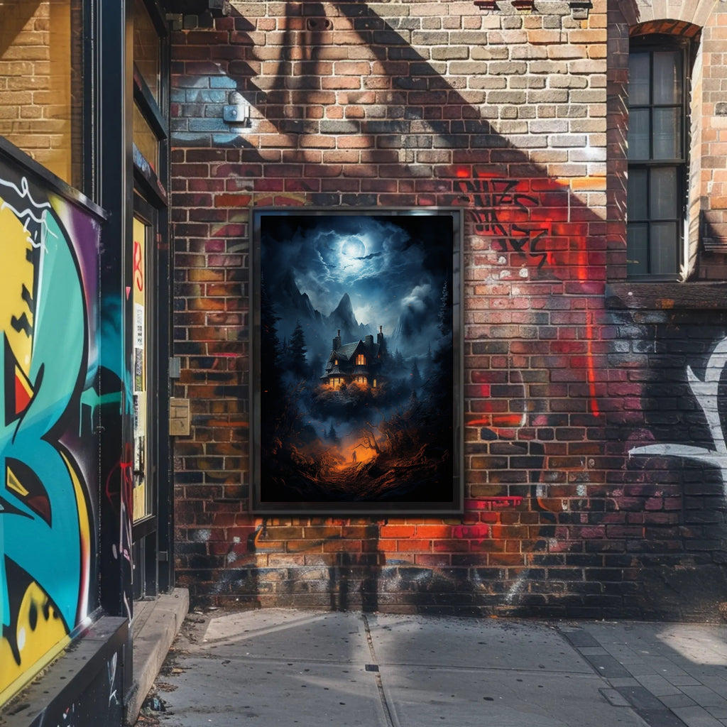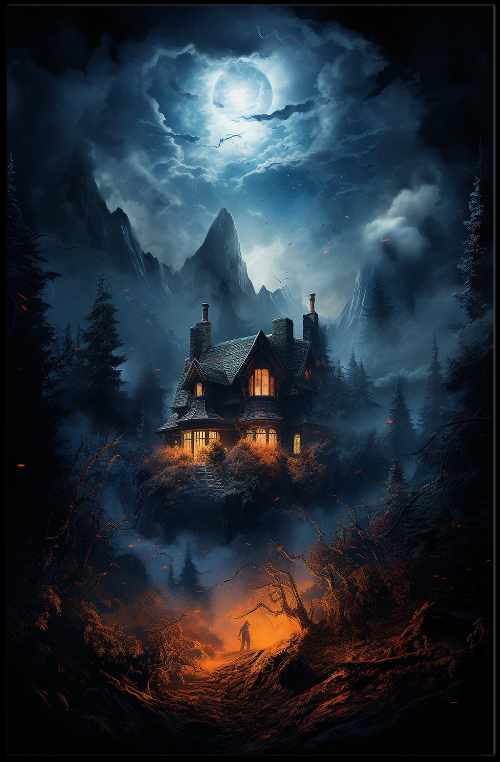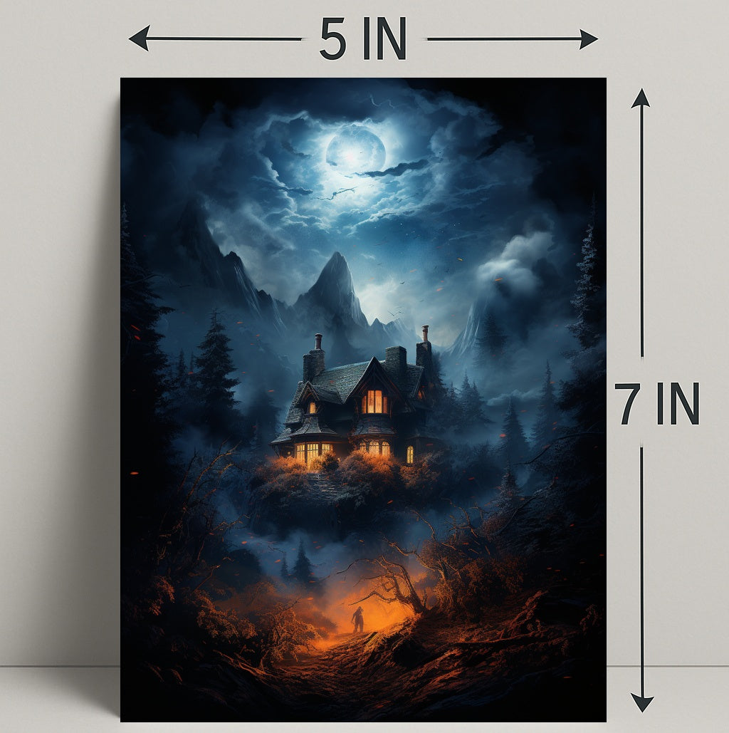 Bring a whisper of mystery and cinematic beauty to your walls with The Enchanted House In The Woods Poster by PosterGoat. This atmospheric poster captures a moonlit mountain sky, a cozy lantern-lit cottage perched above a foggy pine valley, and a lone figure ascending a fiery-orange path — a dramatic contrast of cool blue moonlight and warm ember tones that draws the eye and fuels the imagination.