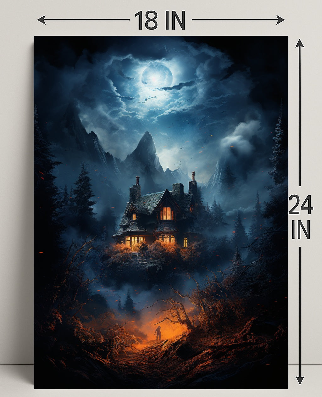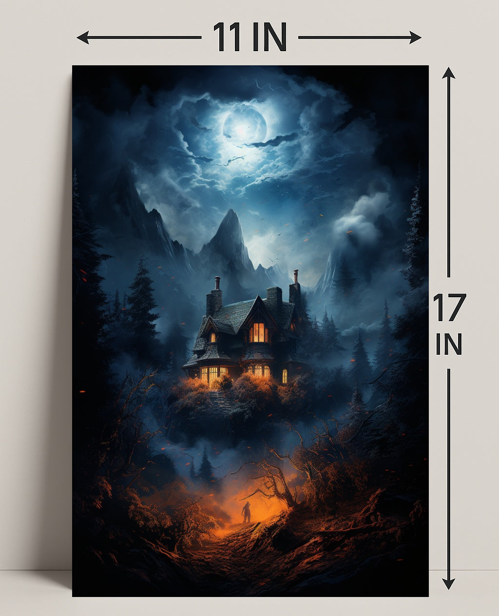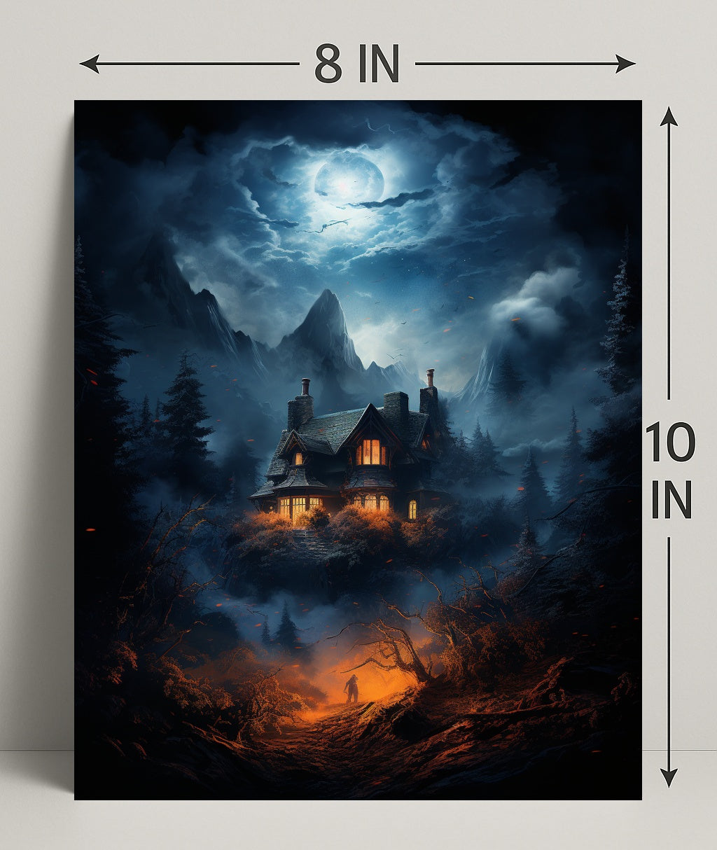 Bring a whisper of mystery and cinematic beauty to your walls with The Enchanted House In The Woods Poster by PosterGoat. This atmospheric poster captures a moonlit mountain sky, a cozy lantern-lit cottage perched above a foggy pine valley, and a lone figure ascending a fiery-orange path — a dramatic contrast of cool blue moonlight and warm ember tones that draws the eye and fuels the imagination.