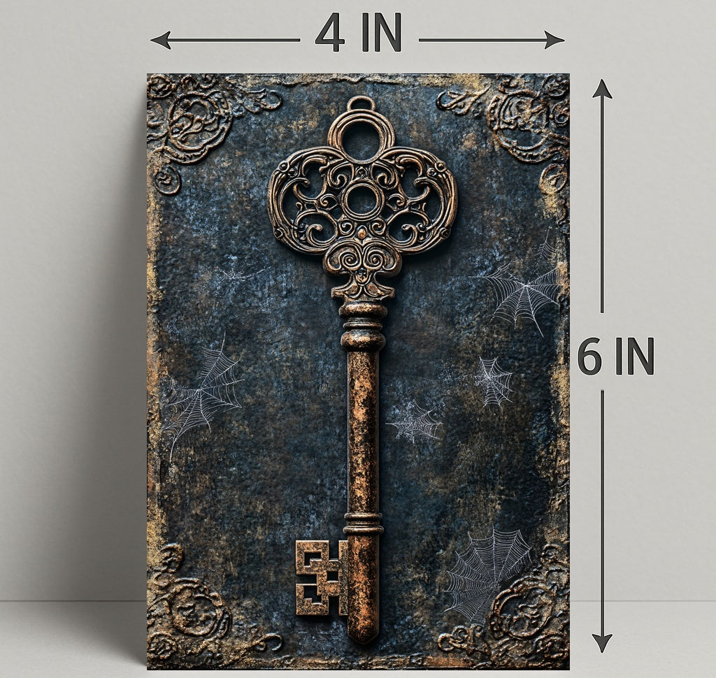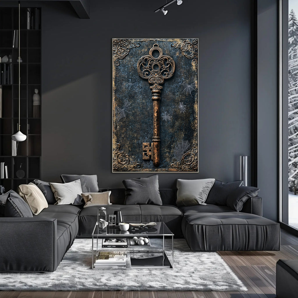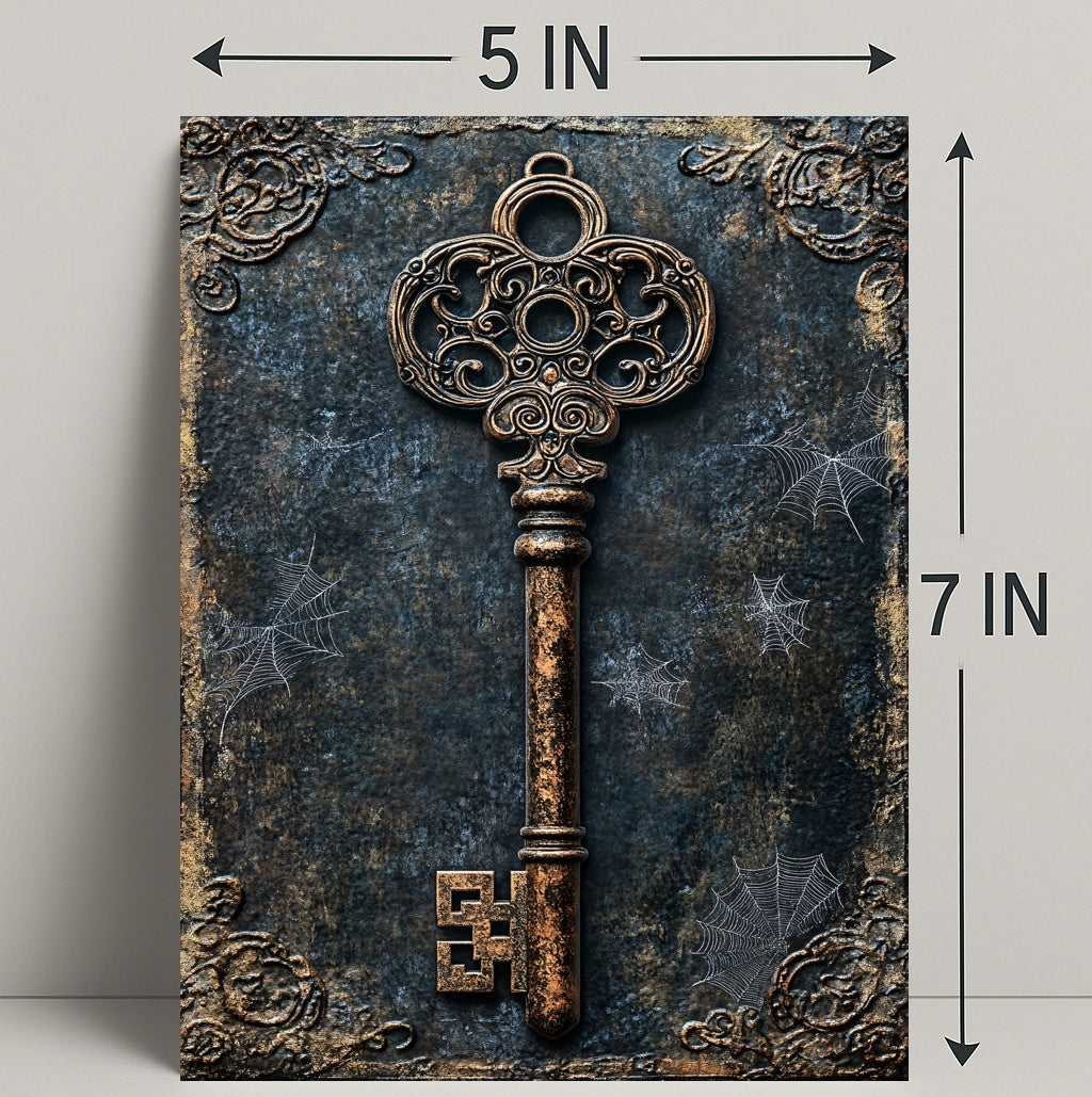 Invite mystery and timeless elegance into your home with The Enchanted Key Poster from PosterGoat — a striking art print that blends antique charm with minimalist, moody design. A beautifully detailed ornate key rests against a textured, patina-rich background accented by delicate spiderweb motifs, creating a piece that feels both enchanted and sophisticated. Perfect for living rooms, hallways, or as a memorable gift for lovers of vintage, scenic, and Halloween-inspired decor.
