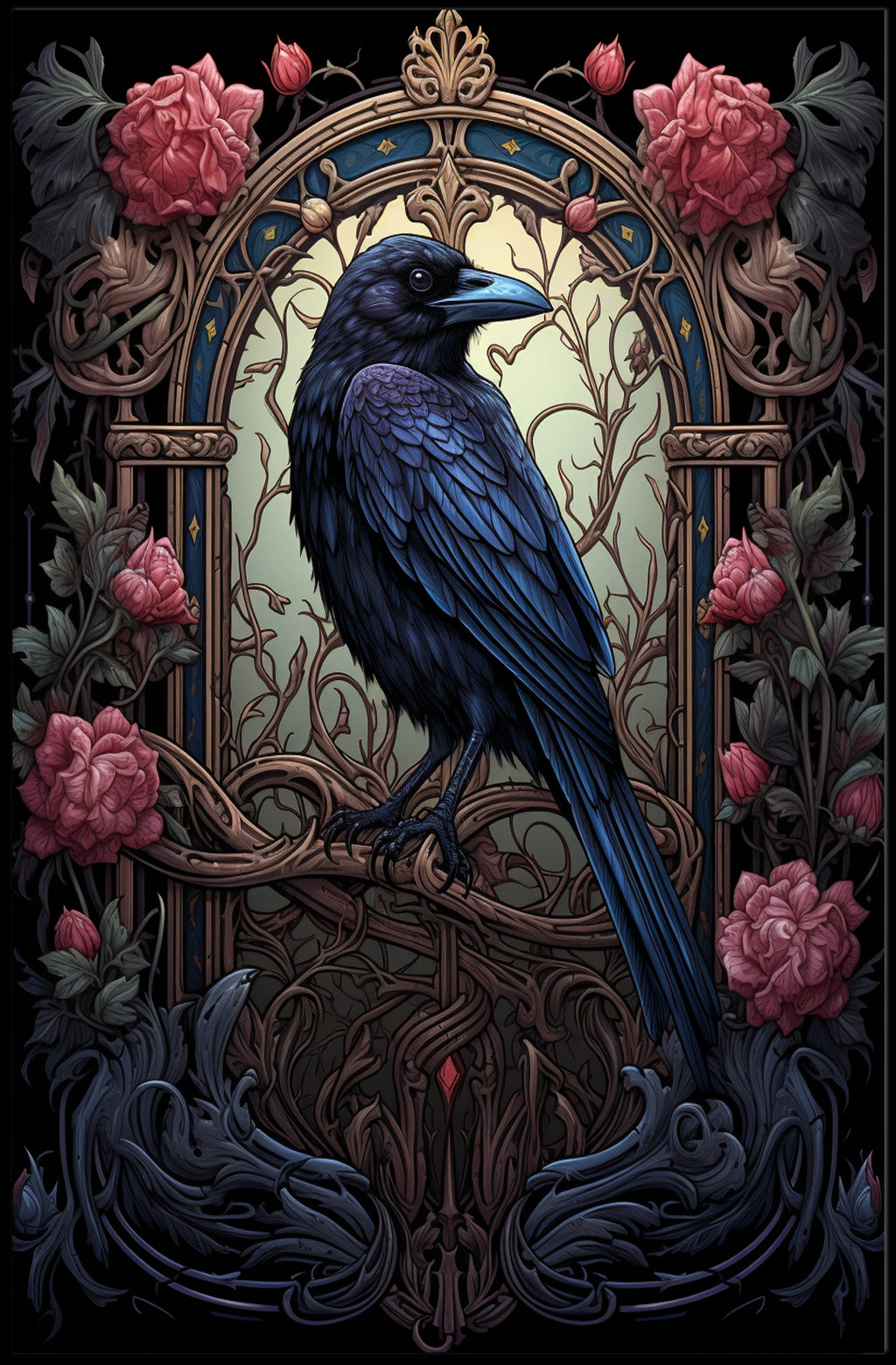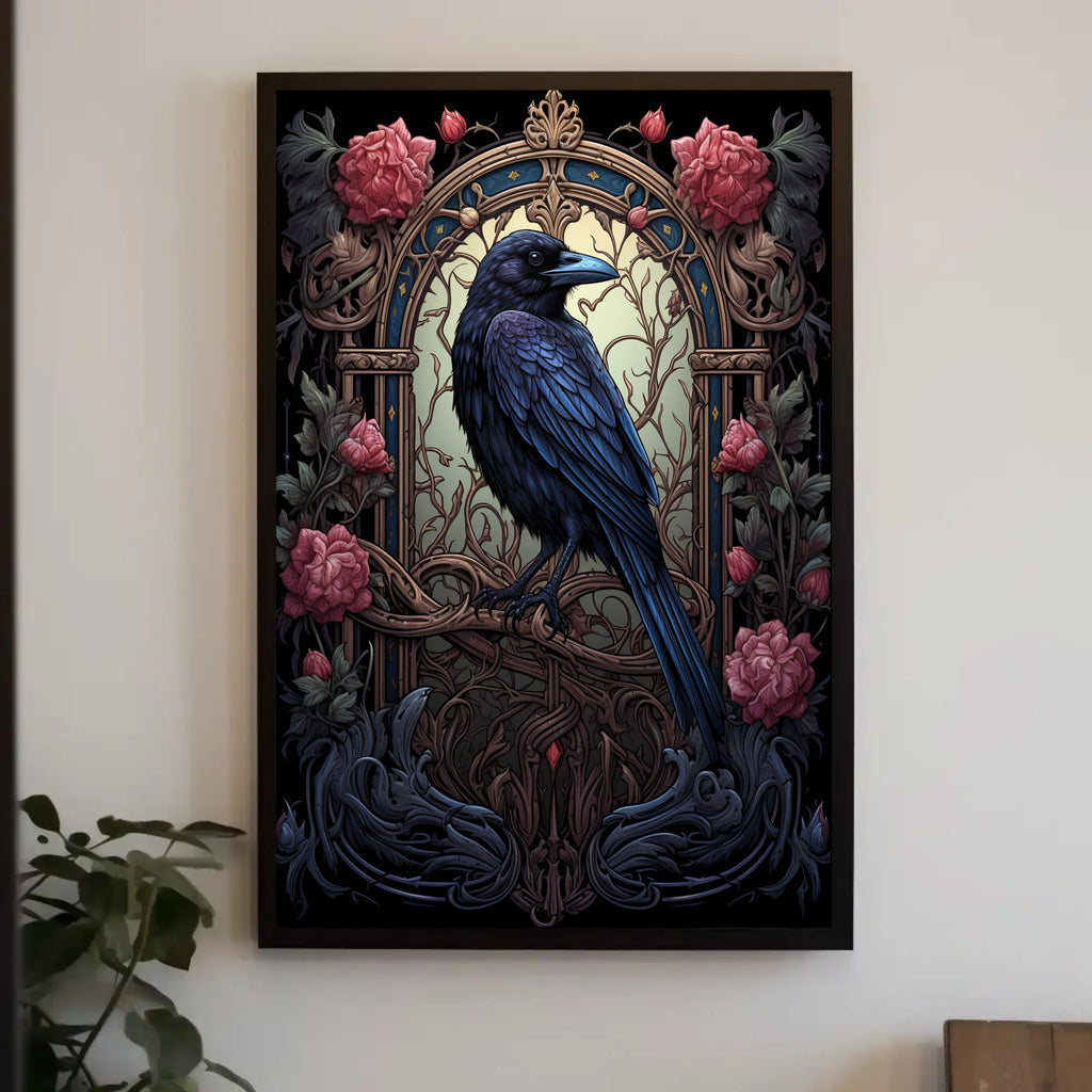 The Enchanted Raven Poster from PosterGoat brings a timeless blend of mystique and elegance to your walls. This richly detailed poster features a majestic raven perched within an ornate, art‑nouveau inspired arch, framed by twisting vines and lush roses—perfect for decor lovers seeking a dramatic focal point for living rooms, bedrooms, or creative spaces.