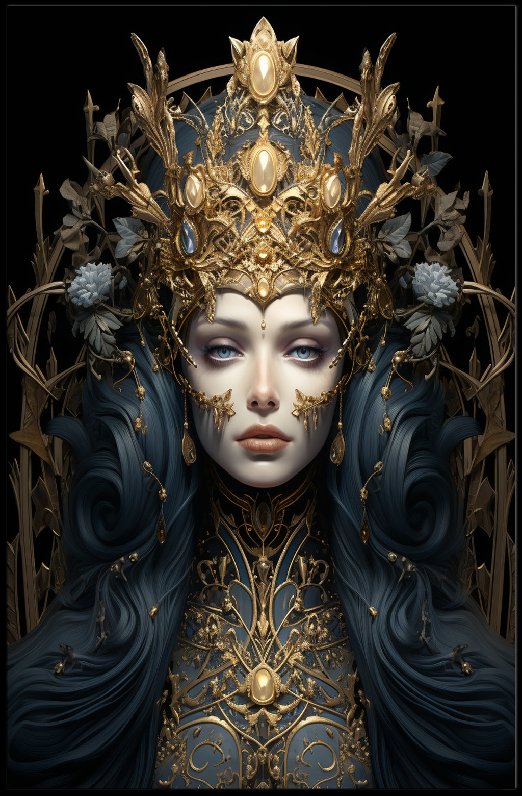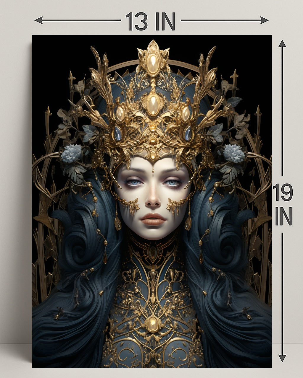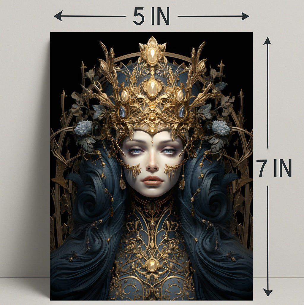 The Enchanted Sovereign Poster from PosterGoat elevates any wall with a mesmerizing blend of regal portraiture and enchanted, scenic design. Rich navy tresses flow like silk around a porcelain face framed by an intricate gold crown and filigree armor — a composition that captures both minimalist elegance and ornate fantasy for sophisticated home décor.