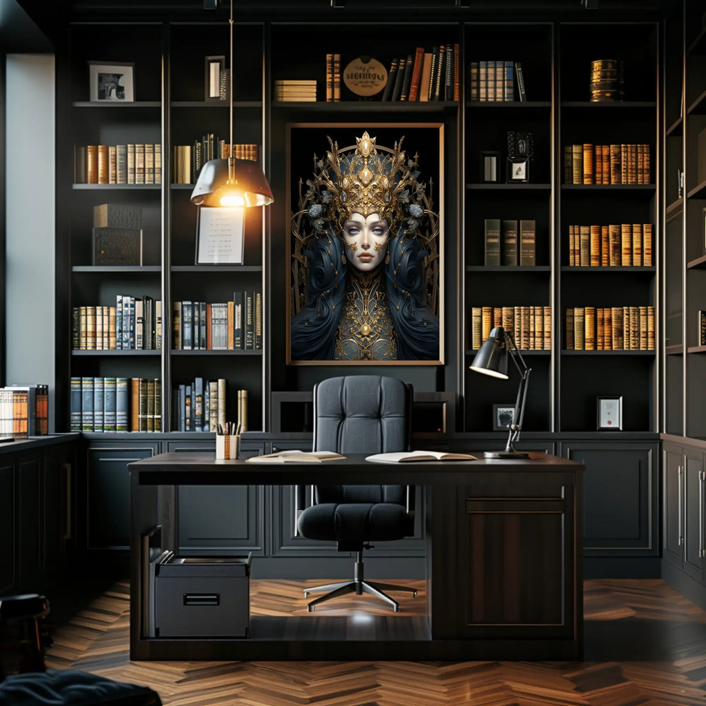 Striking focal art: A dramatic, high-contrast portrait with luminous gold detailing and deep, jewel-toned hues that command attention in living rooms, bedrooms, or office galleries.