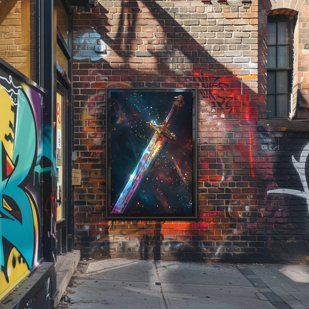 Bring a touch of myth and wonder to your walls with The Enchanted Sword Art Print Poster from PosterGoat. This striking poster features an ornate golden hilt and a radiant, multicolored blade set against a deep, star-speckled backdrop — a perfect fusion of fantasy and scenic artwork that draws the eye and sparks the imagination.