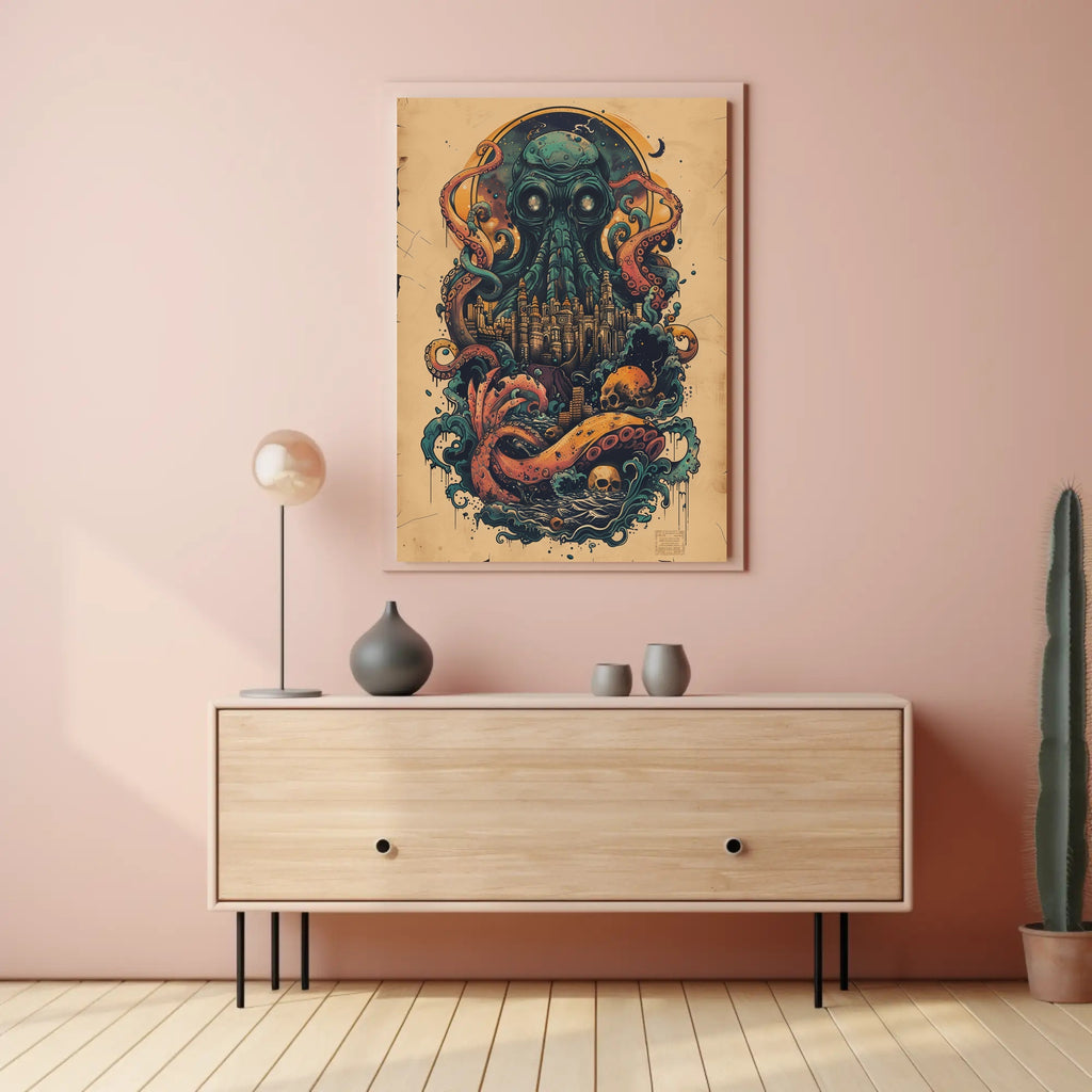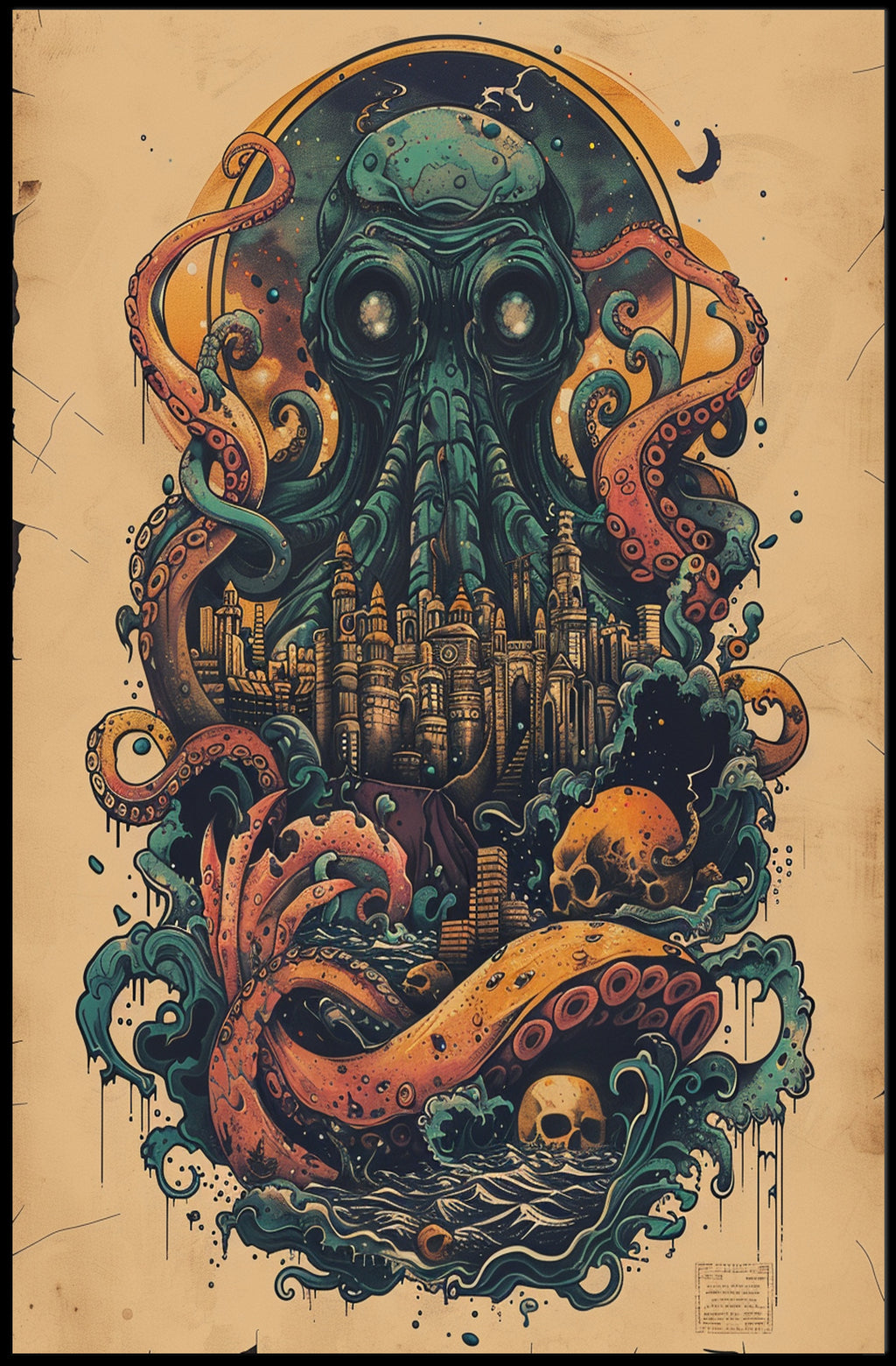 Sink into the mysterious depths with The Enigma of the Deep Wall Art Poster Print from PosterGoat — a striking art print that blends oceanic myth with sculpted cityscape detail. This decorative poster captures a colossal cephalopod rising above crashing waves, tentacles curling around an ornate submerged city and scattered skull motifs, all rendered on a warm, vintage-paper backdrop that adds timeless character to any room.
