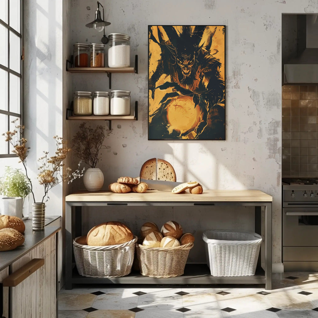This poster captures motion and menace: the demon's curved horns and furrowed brow hover above a luminous sphere that appears to pulse from the page, while dynamic splatters and distressed edges add tactile energy. It fits modern, eclectic, and dark aesthetic interiors, and makes a standout gift for fans of imaginative, evocative wall art.