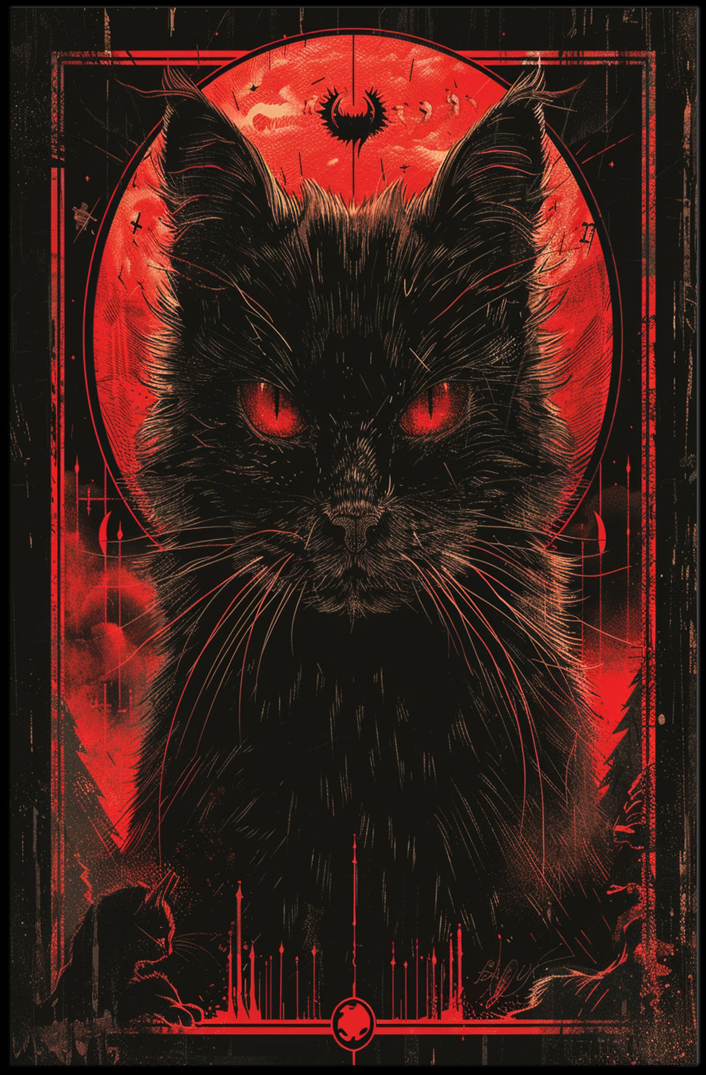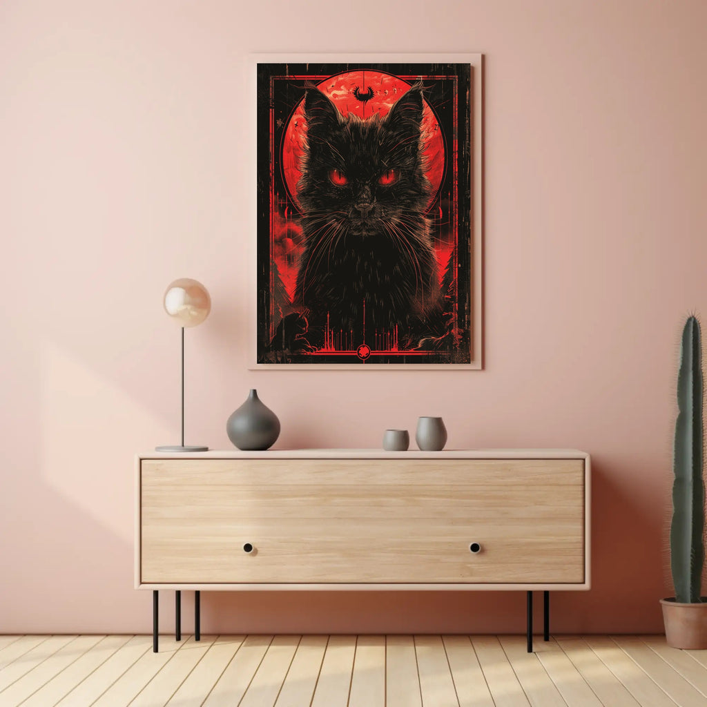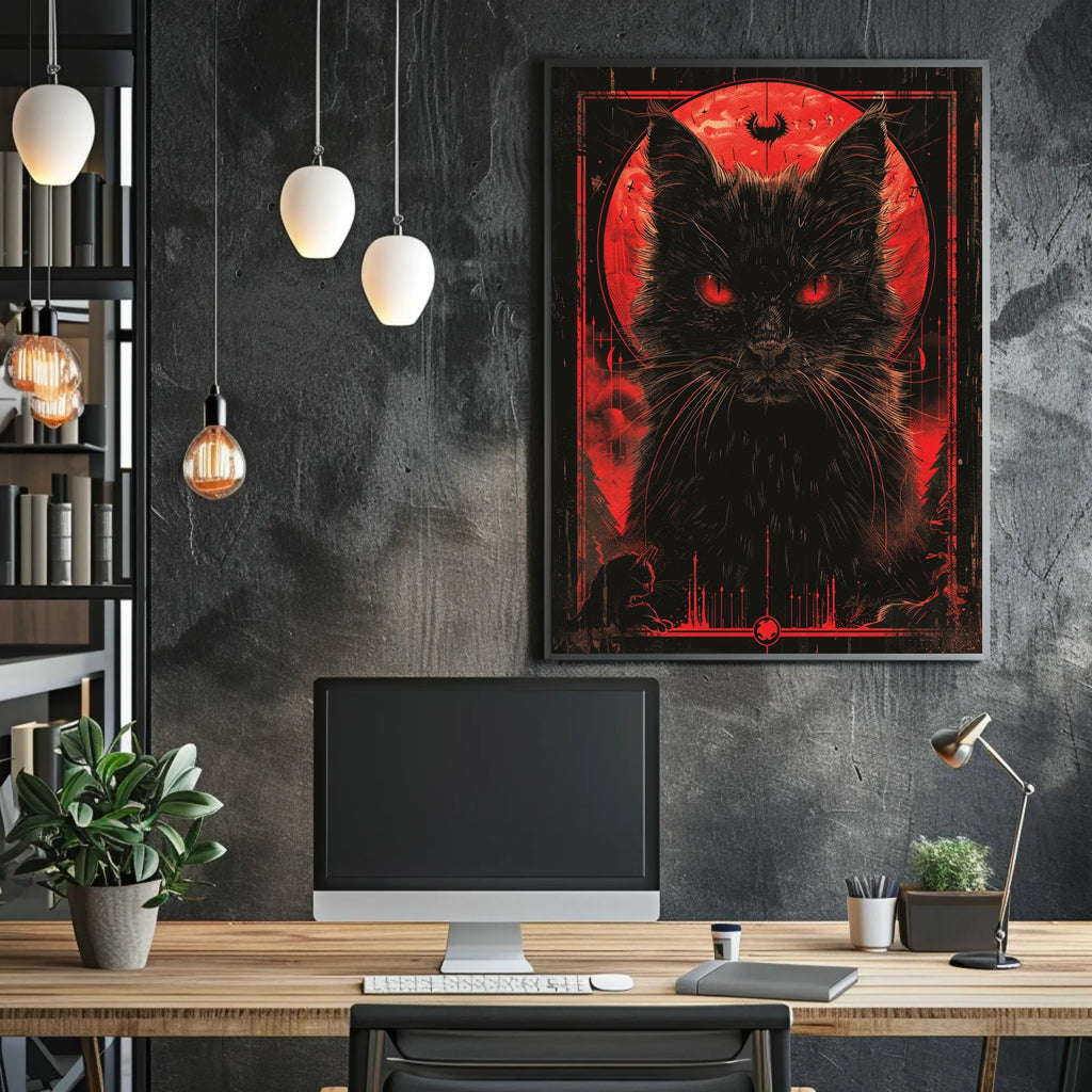 Channel mystery and modern style with The Enigmatic Feline Art Print Poster from PosterGoat — a bold, minimalist piece of wall art that makes an instant statement in any room. This striking poster features a finely detailed black cat rendered in dense linework, glowing red eyes, and a blood-red lunar halo that creates an unforgettable, cinematic contrast. Perfect for cat lovers, art collectors, and anyone who appreciates atmospheric home decor with an edge.