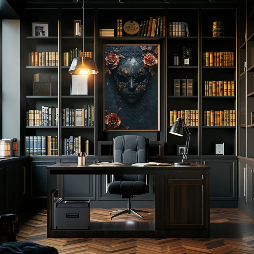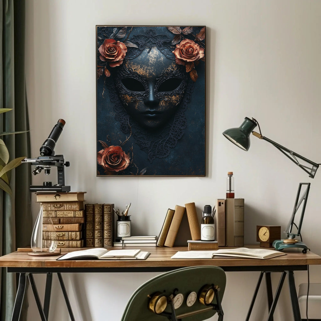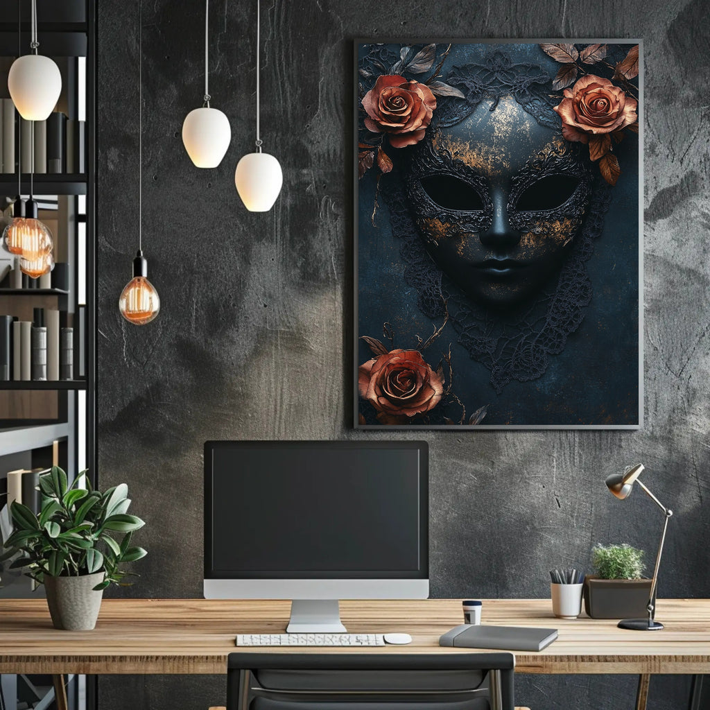 The Enigmatic Mask Poster from PosterGoat transforms any wall into a statement of mystery and refined beauty. A sculpted dark mask, delicate lace edging and rich copper roses combine with distressed gold flecks to create a hauntingly elegant focal point that suits modern, minimalist and artful interiors.
