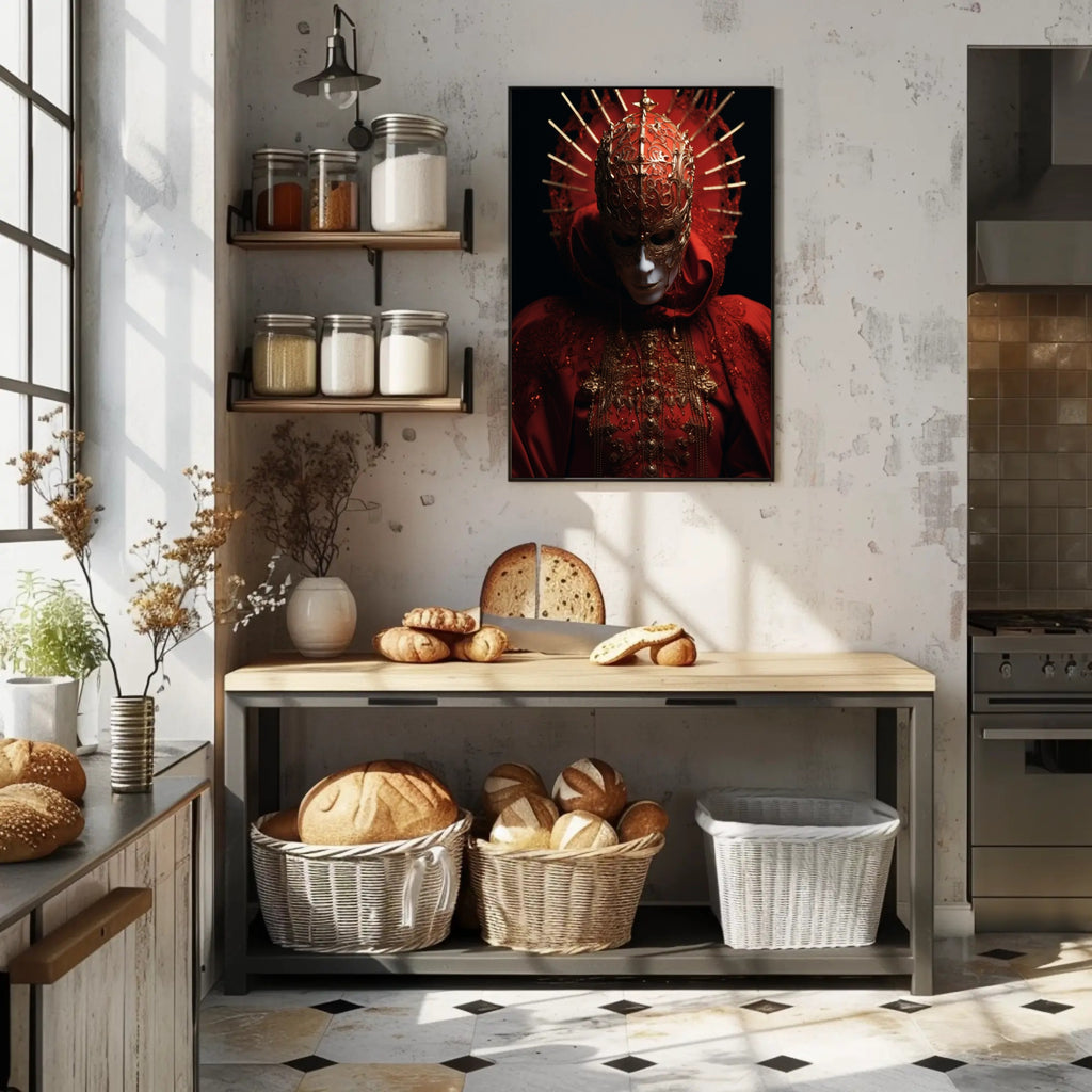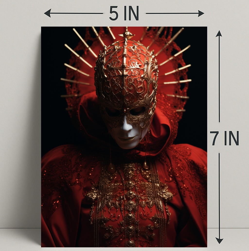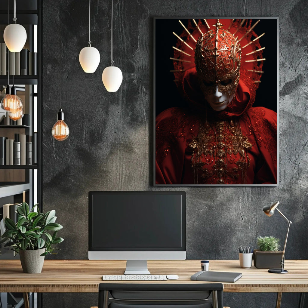 The Enigmatic Mask Poster from PosterGoat transforms any room into a stage of mystery and refinement. This striking poster captures a masked figure draped in sumptuous red fabric, intricate gold filigree, and a radiant spiked halo — a visual statement piece that blends enigmatic symbolism with scenic, wearable-art detail.