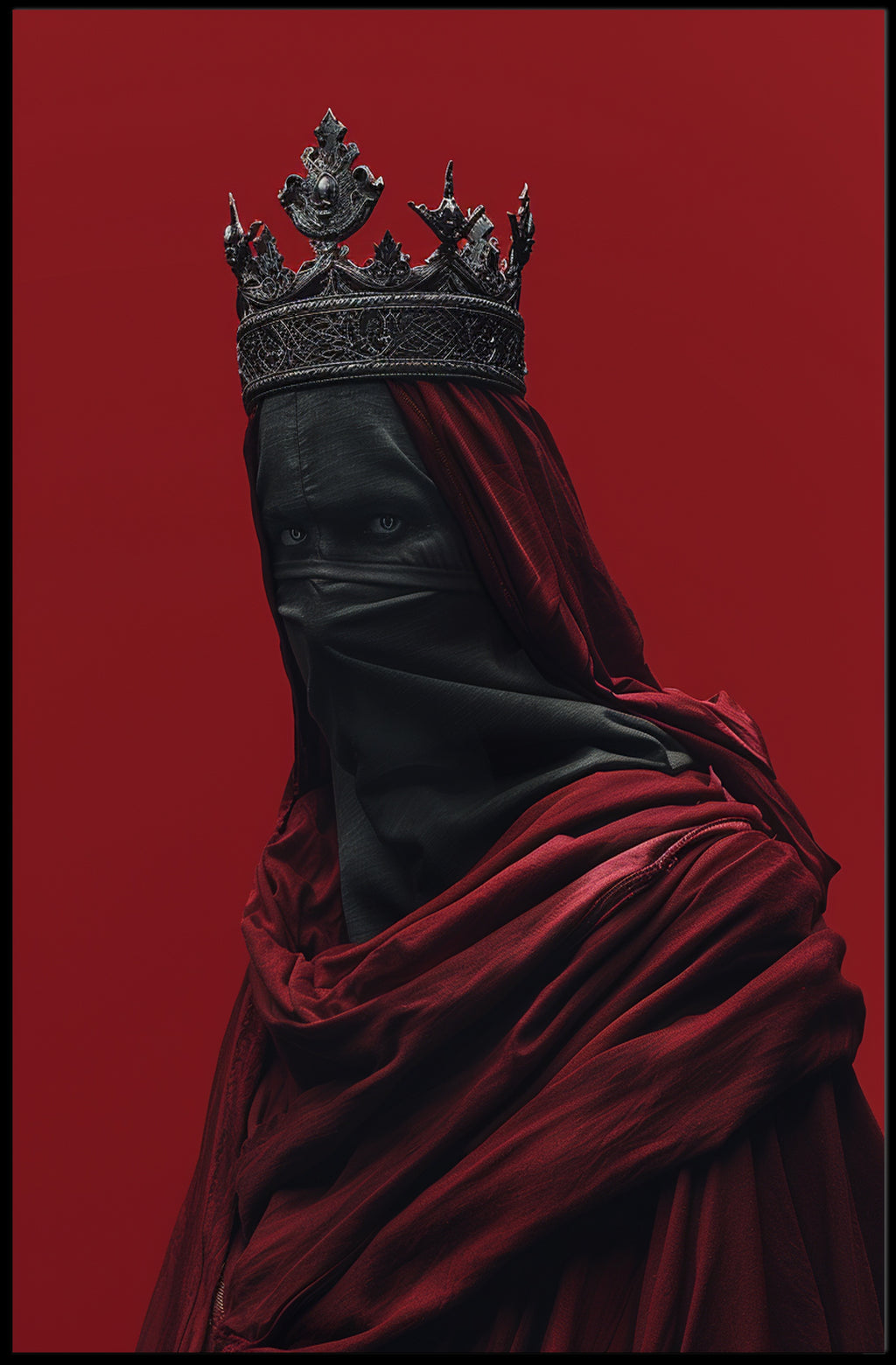 Bring dramatic elegance to your walls with The Enigmatic Monarch Art Print Poster from PosterGoat — a striking, minimalist artwork that blends mysterious portraiture with regal symbolism. Against a deep crimson backdrop, a veiled figure wrapped in rich, sculptural drapery wears an ornate metallic crown, creating a powerful focal point that sparks conversation and elevates any living space.