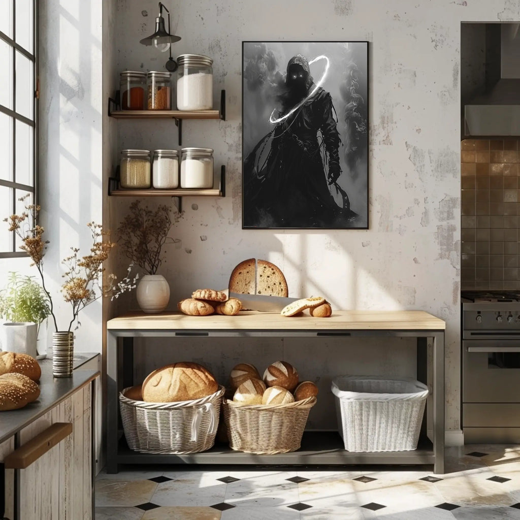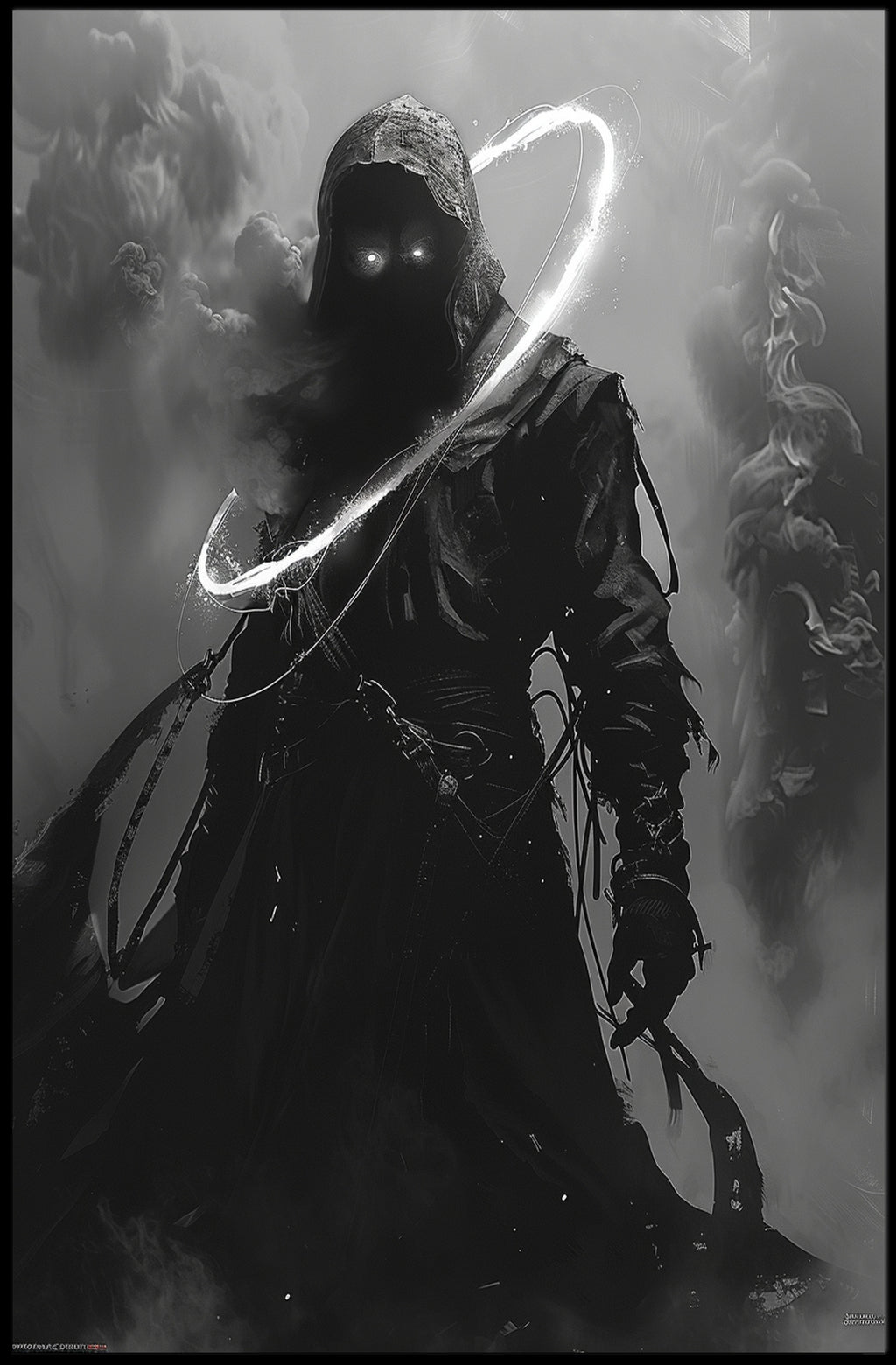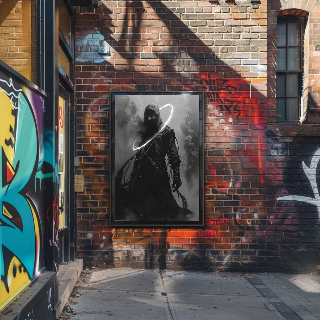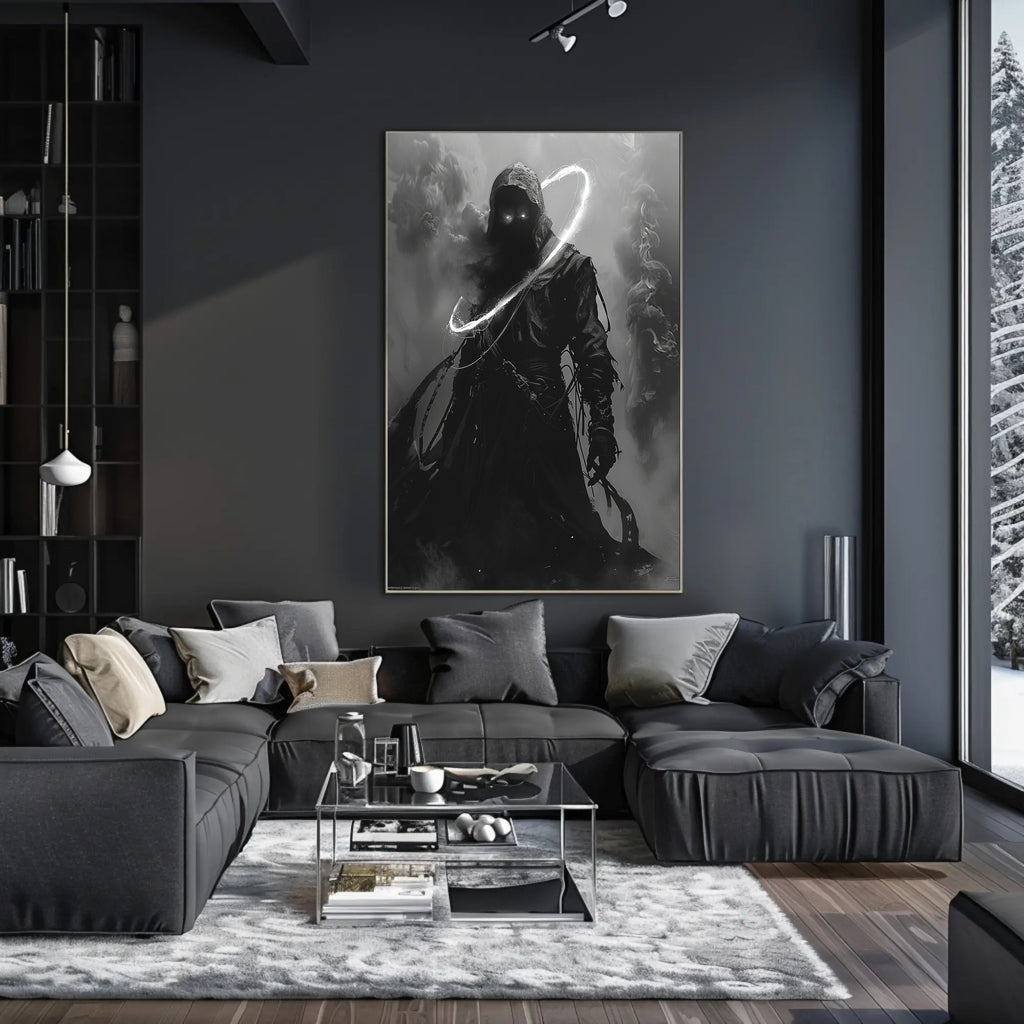 Bring mystery and minimalist drama to your walls with The Enigmatic Shadow Art Print Poster from PosterGoat. This striking, monochrome poster captures a hooded, shadowed figure with piercing luminous eyes and a sweeping ring of light—an evocative piece that blends scenic inspiration with surreal, wanderlust-ready storytelling.
