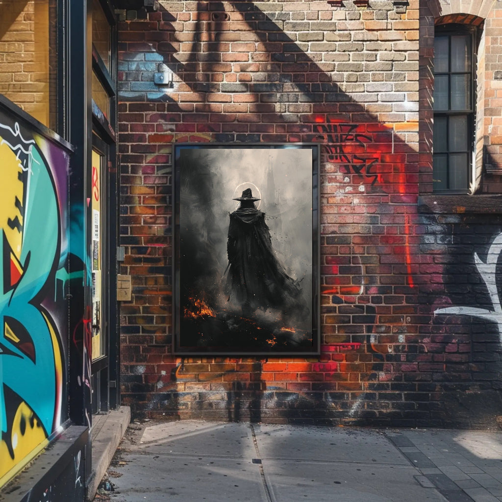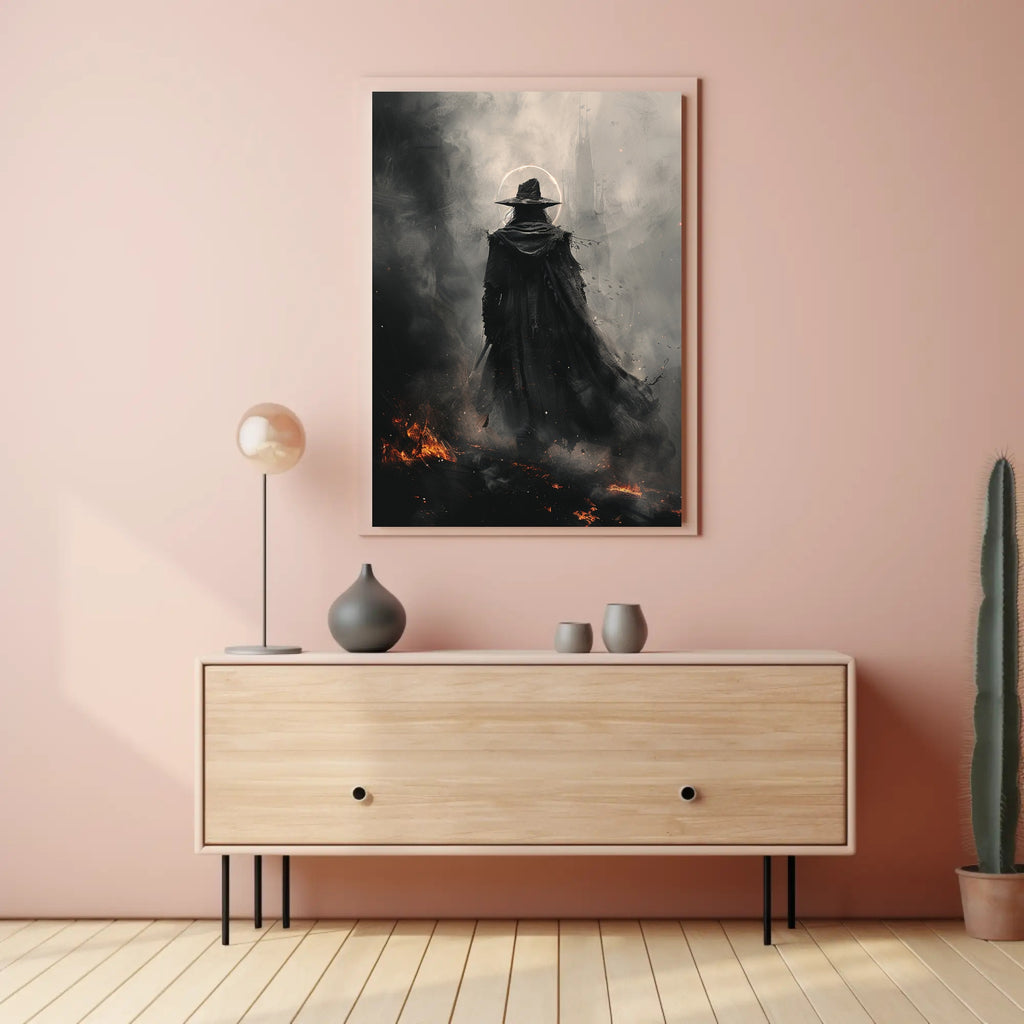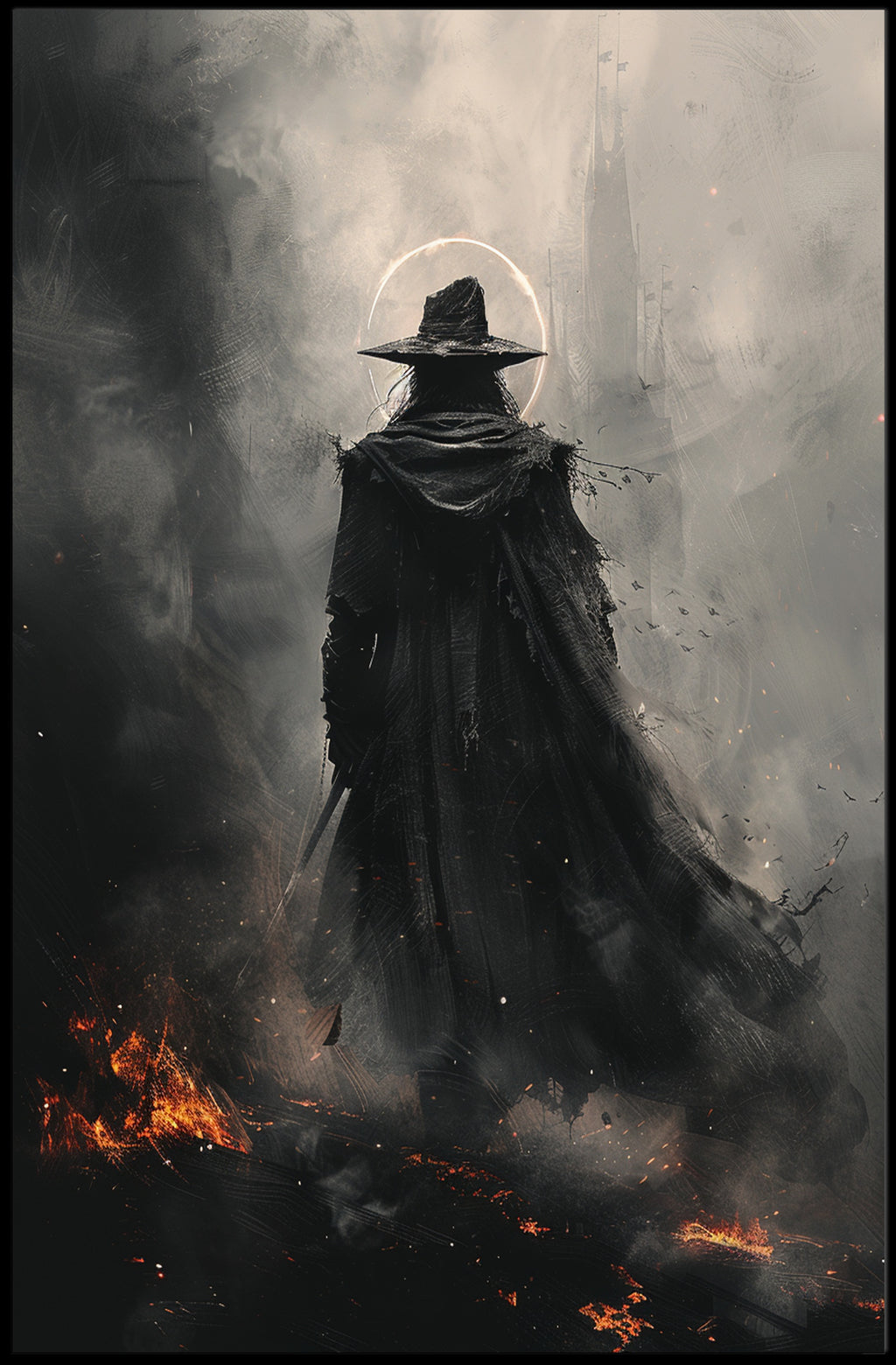 Rendered in a stormy palette of charcoal grays and ember-orange accents, this vertical poster captures a lone cloaked wanderer seen from behind, a pale halo framing their head as ash and smoke swirl around a smoldering landscape. The artwork’s rich contrast and textured brushwork create depth and motion, making it perfect for travel enthusiasts, collectors of enigmatic artwork, or anyone seeking a bold interior statement.