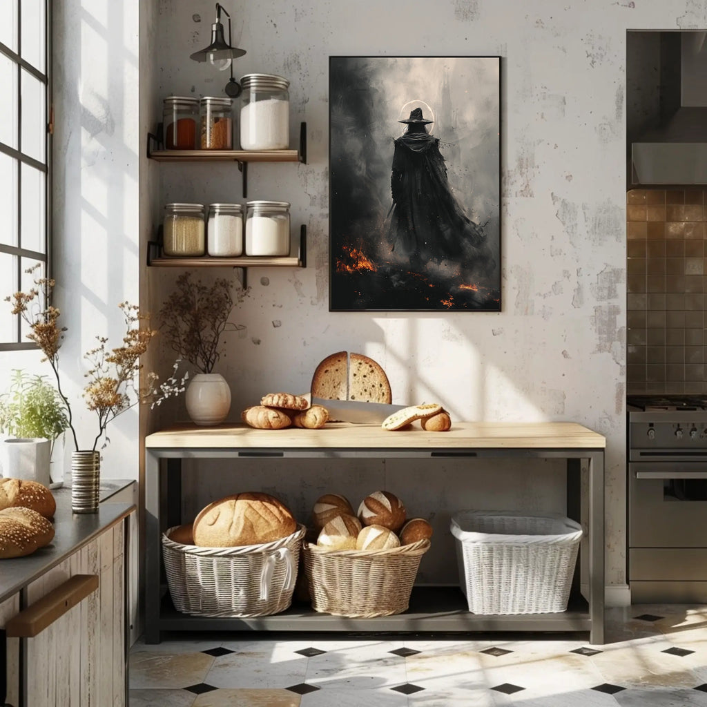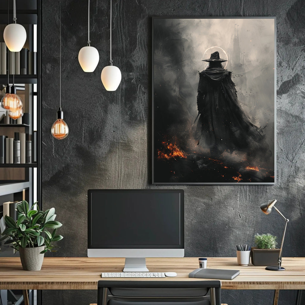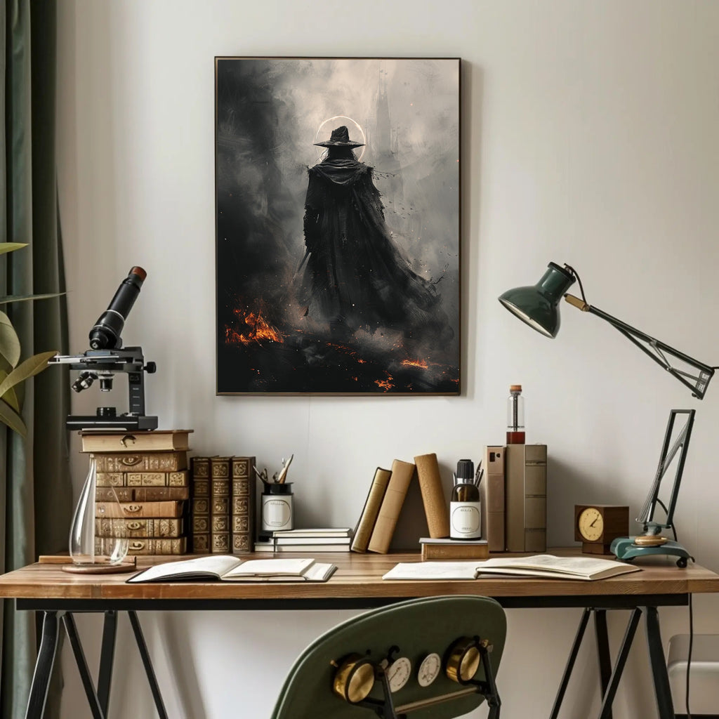 Rendered in a stormy palette of charcoal grays and ember-orange accents, this vertical poster captures a lone cloaked wanderer seen from behind, a pale halo framing their head as ash and smoke swirl around a smoldering landscape. The artwork’s rich contrast and textured brushwork create depth and motion, making it perfect for travel enthusiasts, collectors of enigmatic artwork, or anyone seeking a bold interior statement.