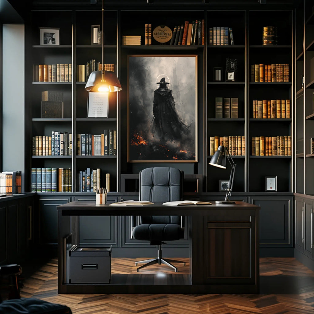 Invite mystery and wanderlust into your home with "The Enigmatic Wanderer" art print from PosterGoat — a striking poster that blends minimalist composition with cinematic drama to become the focal point of any room.