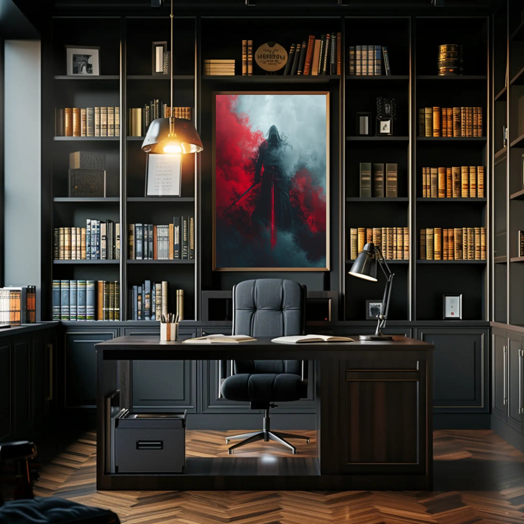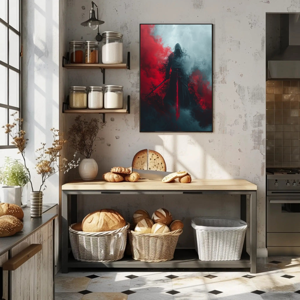 The Enigmatic Warrior Poster from PosterGoat transforms any wall into a dramatic focal point. A hooded, faceless warrior emerges from swirling red and teal smoke, clutching a blood-red, glowing blade — a striking composition that blends minimalist design with cinematic intensity. Perfect for fans of evocative wall art, this high-quality poster brings adventure print energy and enigmatic atmosphere to contemporary interiors.